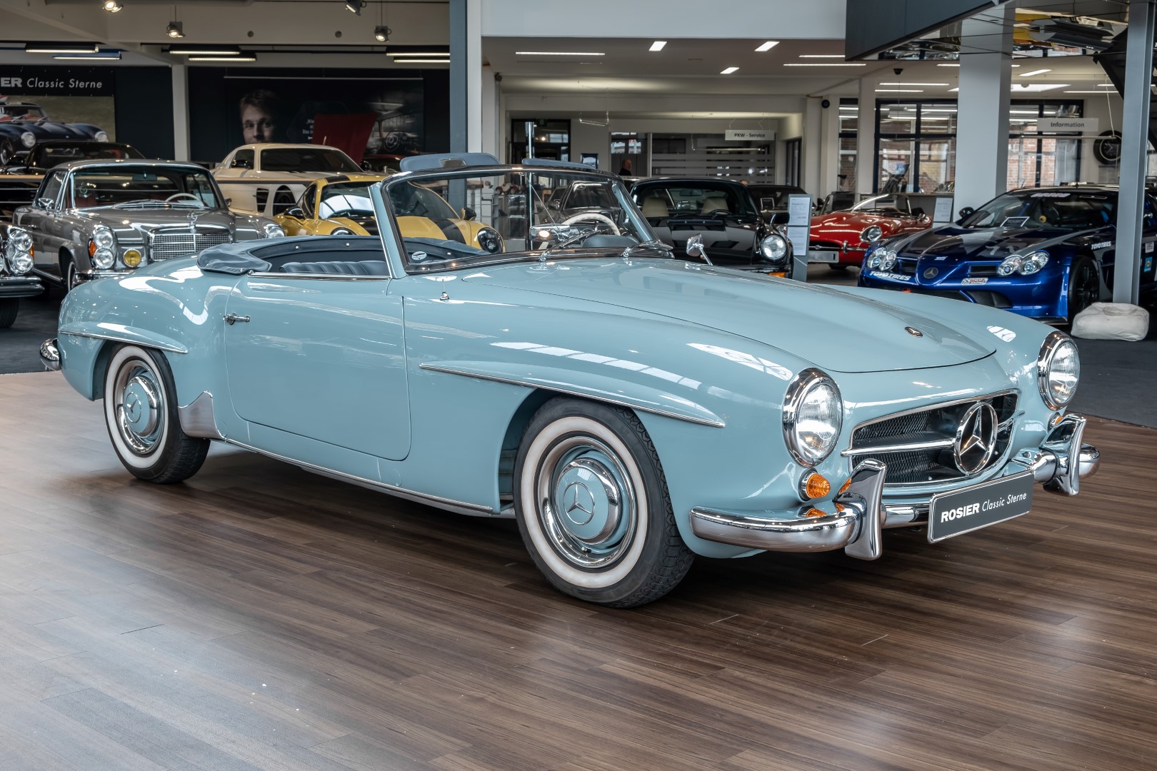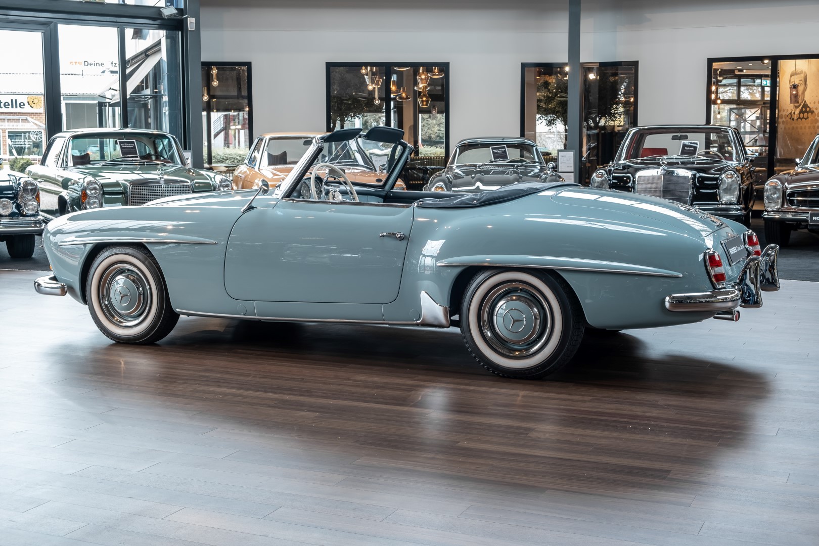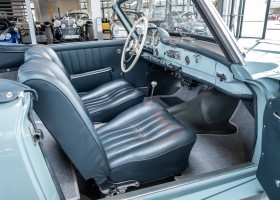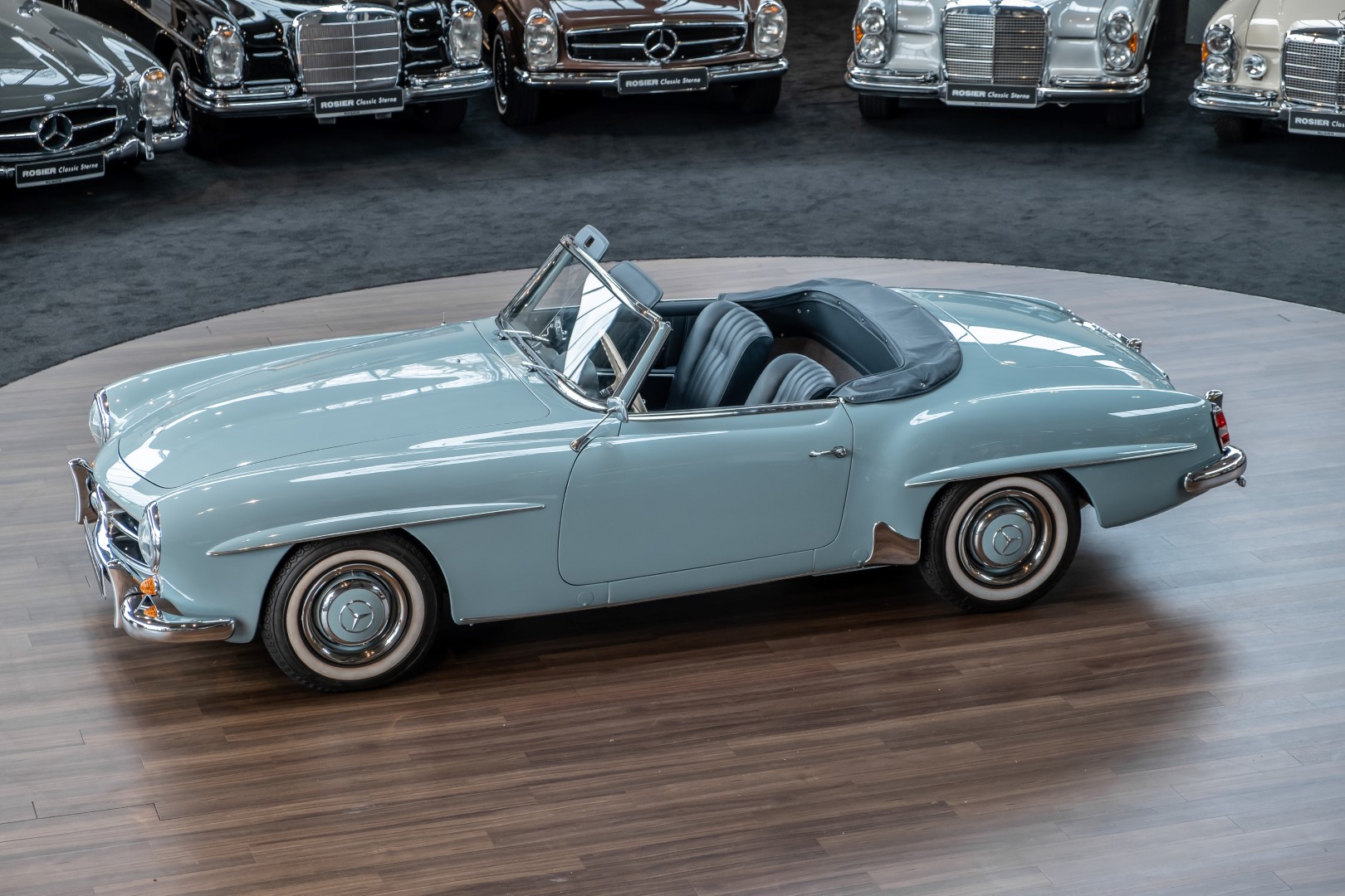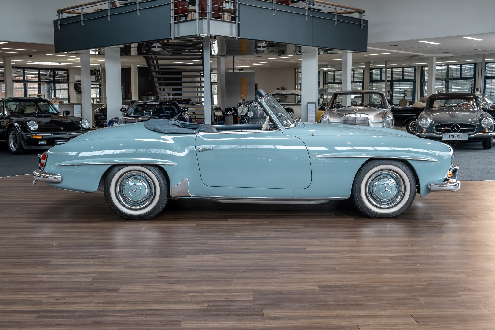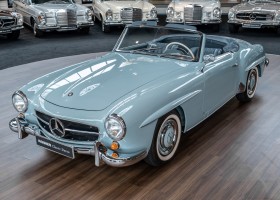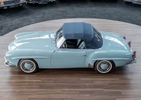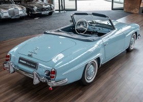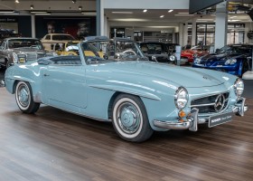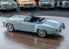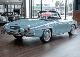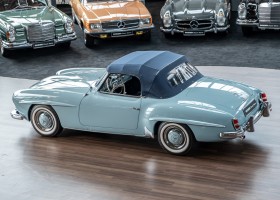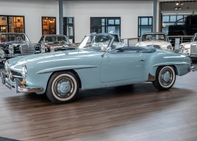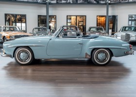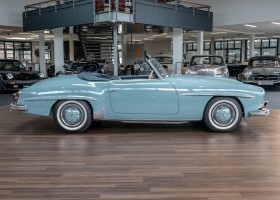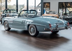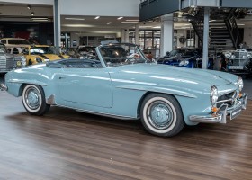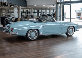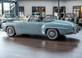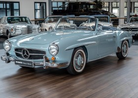 This dreamlike 190 SL of the W121 series was completed in 1962 and subsequently made it to sunny California. Over 40 years the vehicle remained in the sunshine state until the vehicle succeeded in 1997 back to Germany. Due to the dry and warm climate the basis for the restoration was ideal. The restoration was carried out by a renowned specialist company from the ground up and with a special degree of quality. The result is impressive: a flawless engine running, best driving characteristics and a dreamlike optical appearance - from the lacquer dress to the leather upholstery to the fabric top. A Mercedes enthusiast liked the classic roadster and spontaneously fell in love with the rare color combination of horizon blue with dark blue leather and soft top fabric. Lack of space is the reason why we are now able to offer you this vehicle from its exquisite collection. Experience this exception 190er. The next sunny days are sure to come.
