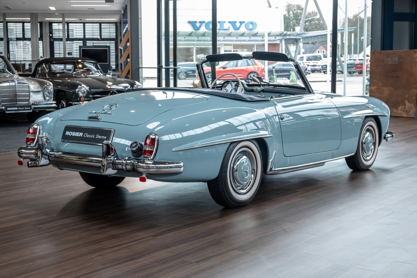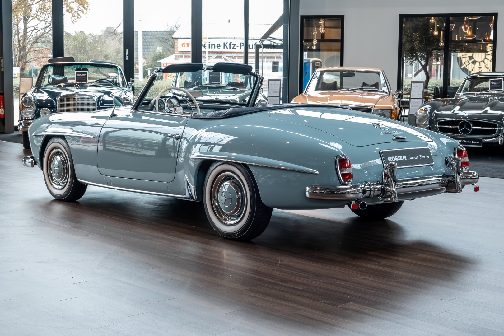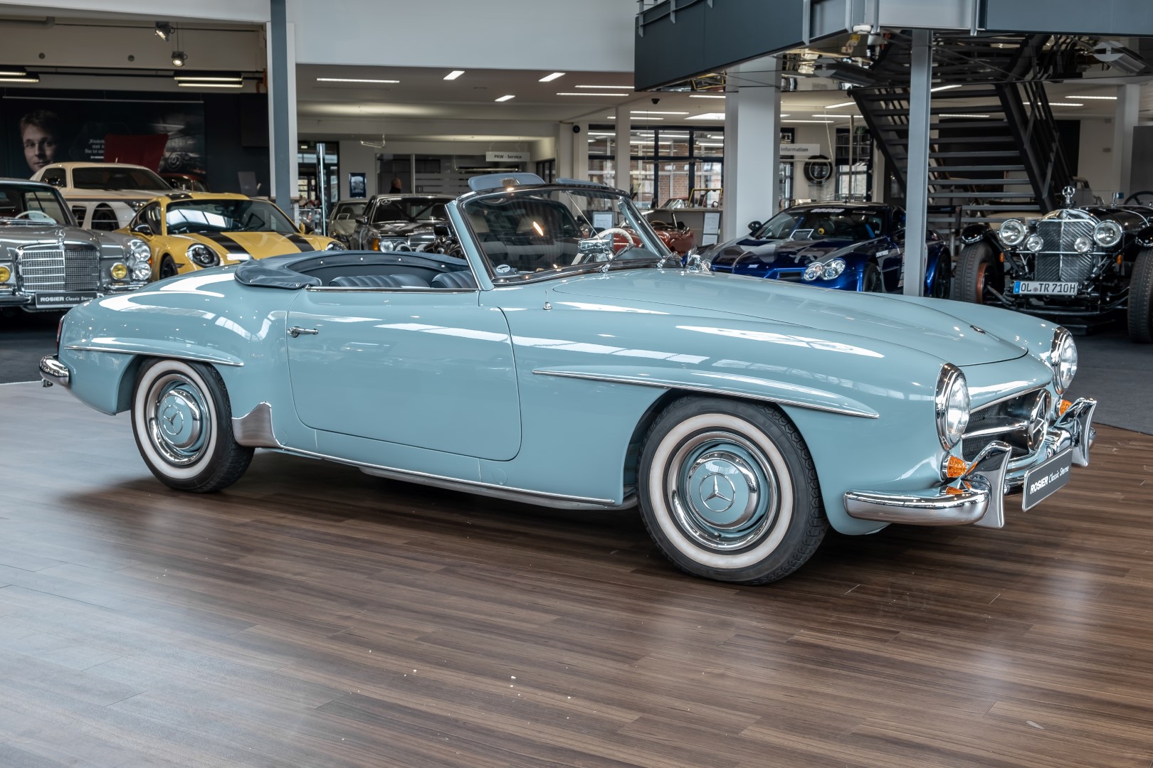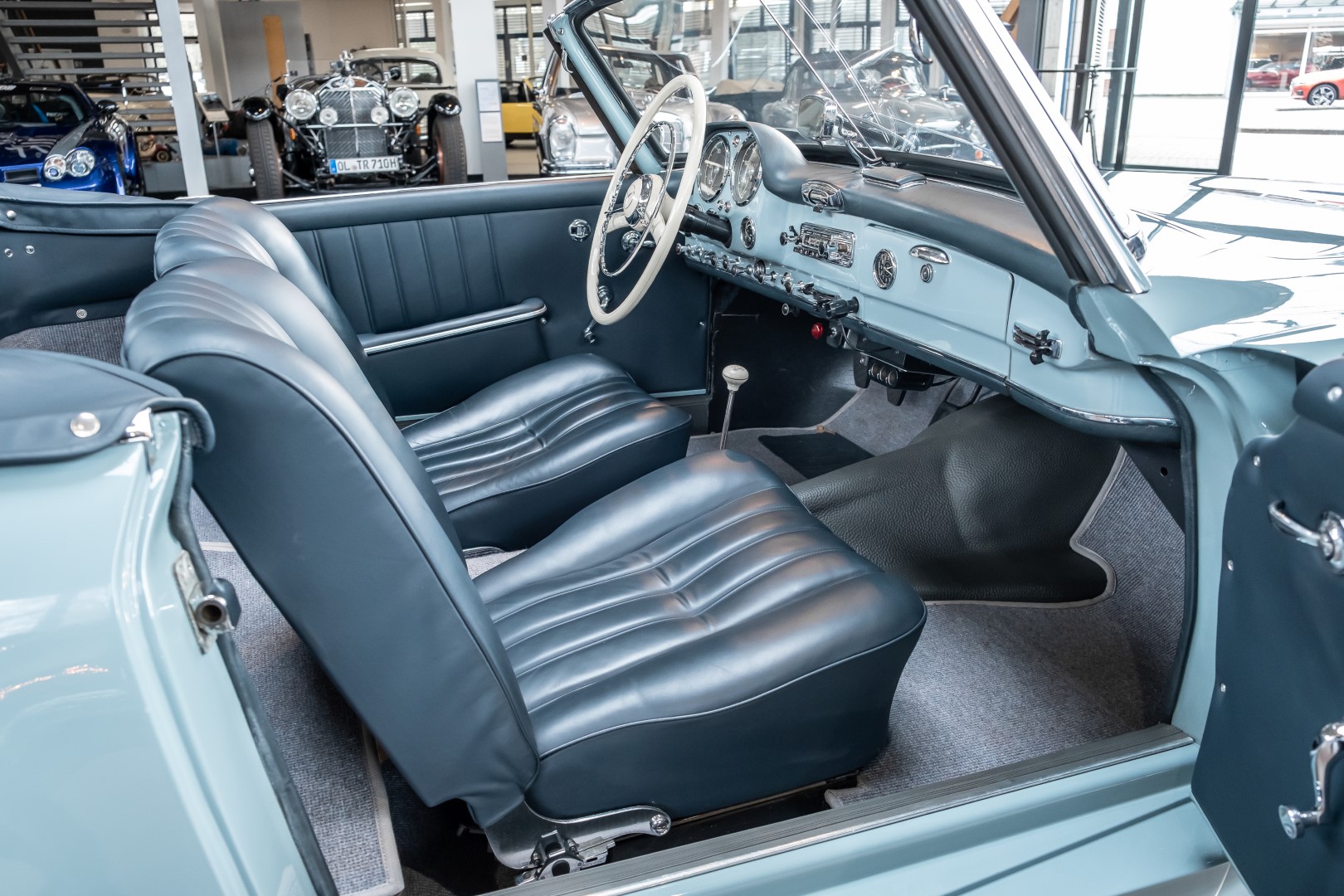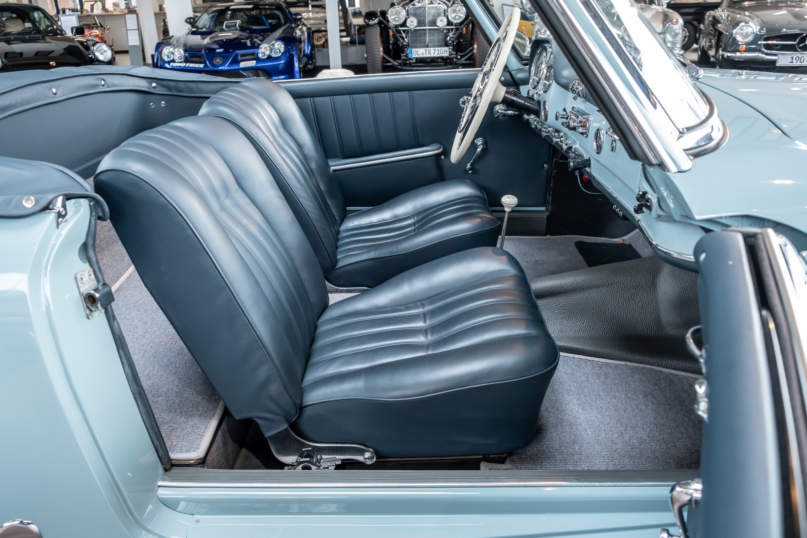 This dreamlike 190 SL of the W121 series was completed in 1962 and subsequently made it to sunny California. Over 40 years the vehicle remained in the sunshine state until the vehicle succeeded in 1997 back to Germany. Due to the dry and warm climate the basis for the restoration was ideal. The restoration was carried out by a renowned specialist company from the ground up and with a special degree of quality. The result is impressive: a flawless engine running, best driving characteristics and a dreamlike optical appearance - from the lacquer dress to the leather upholstery to the fabric top. A Mercedes enthusiast liked the classic roadster and spontaneously fell in love with the rare color combination of horizon blue with dark blue leather and soft top fabric. Lack of space is the reason why we are now able to offer you this vehicle from its exquisite collection. Experience this exception 190er. The next sunny days are sure to come.