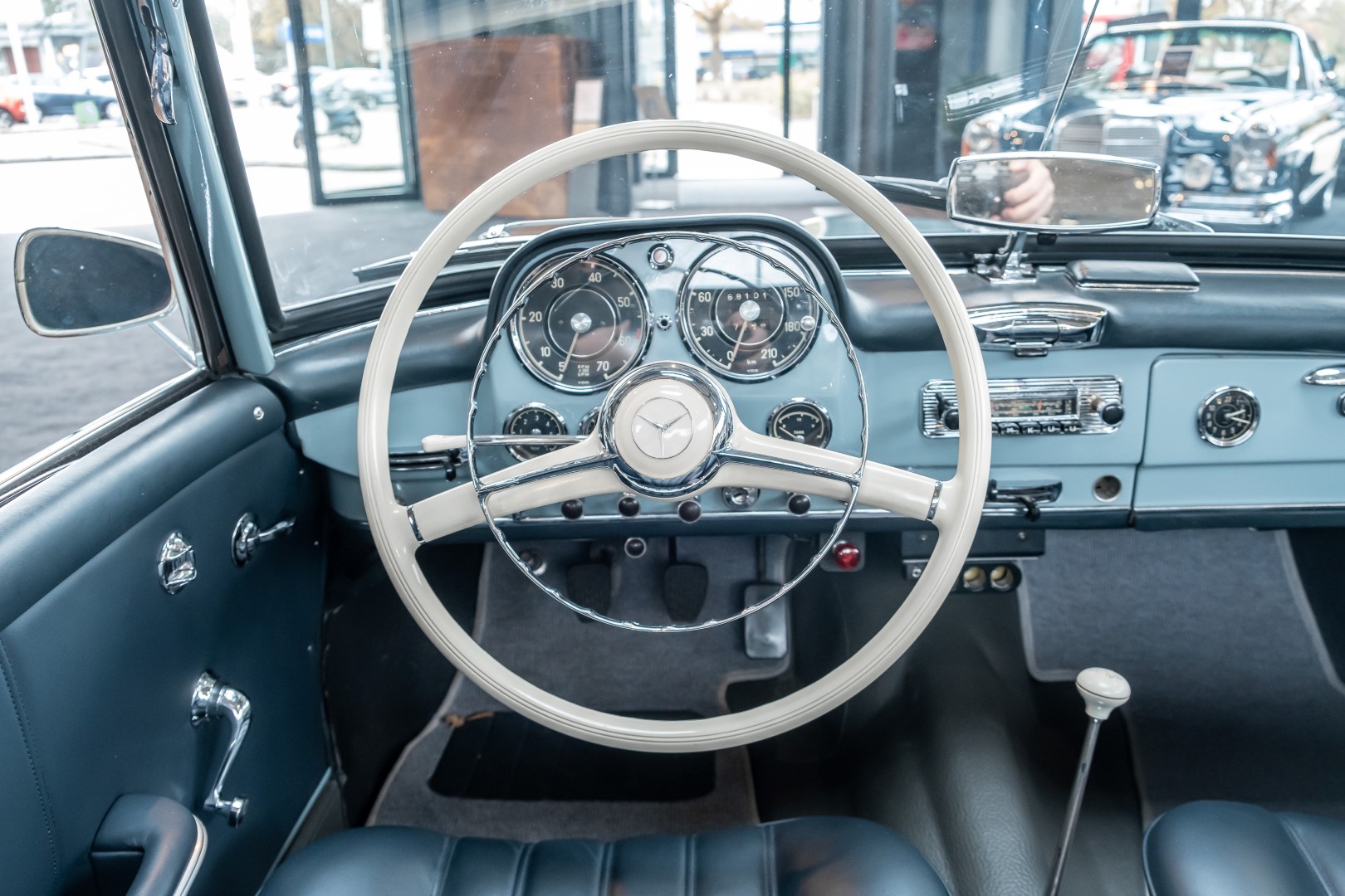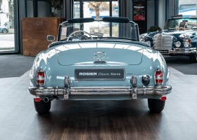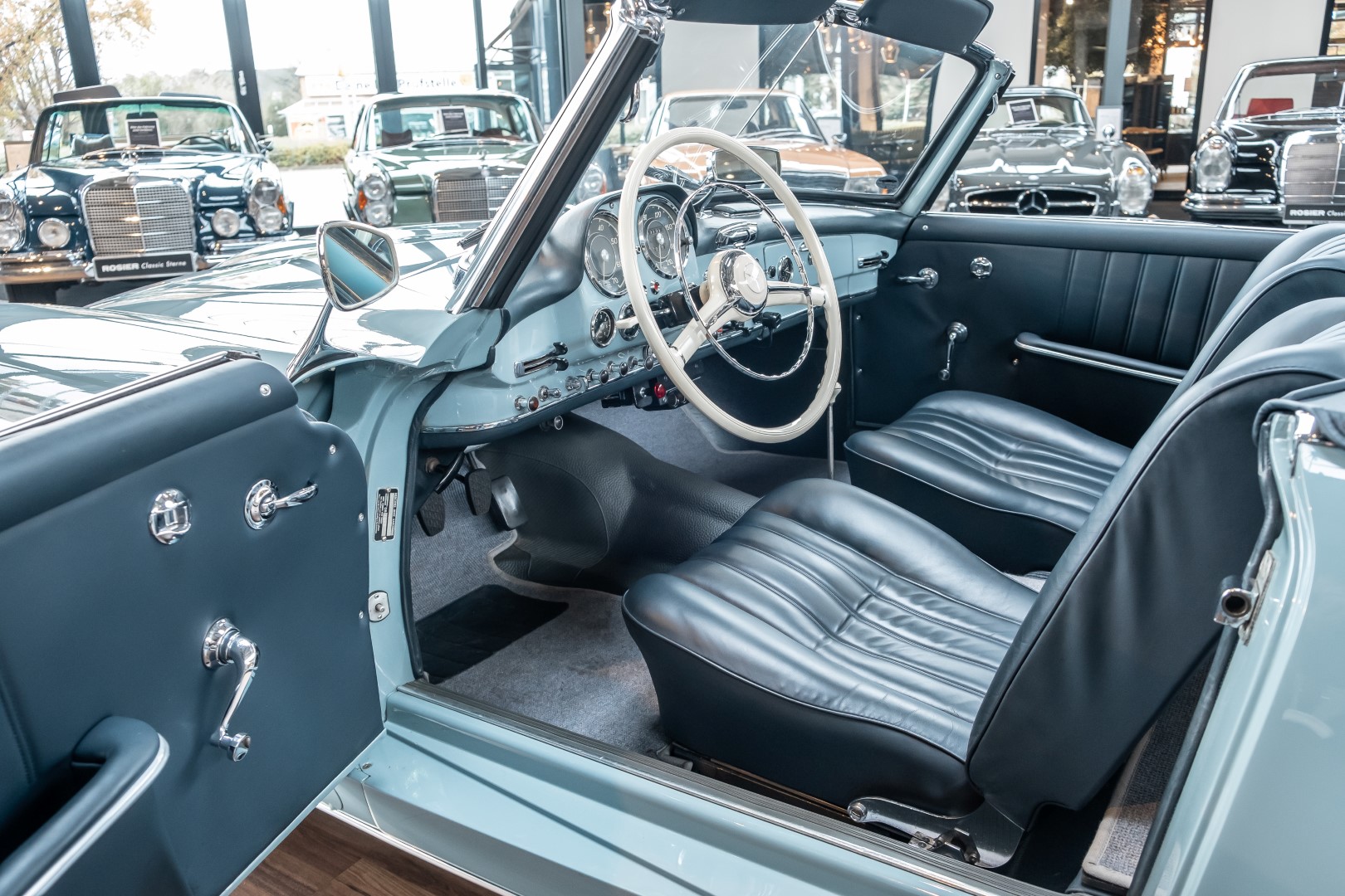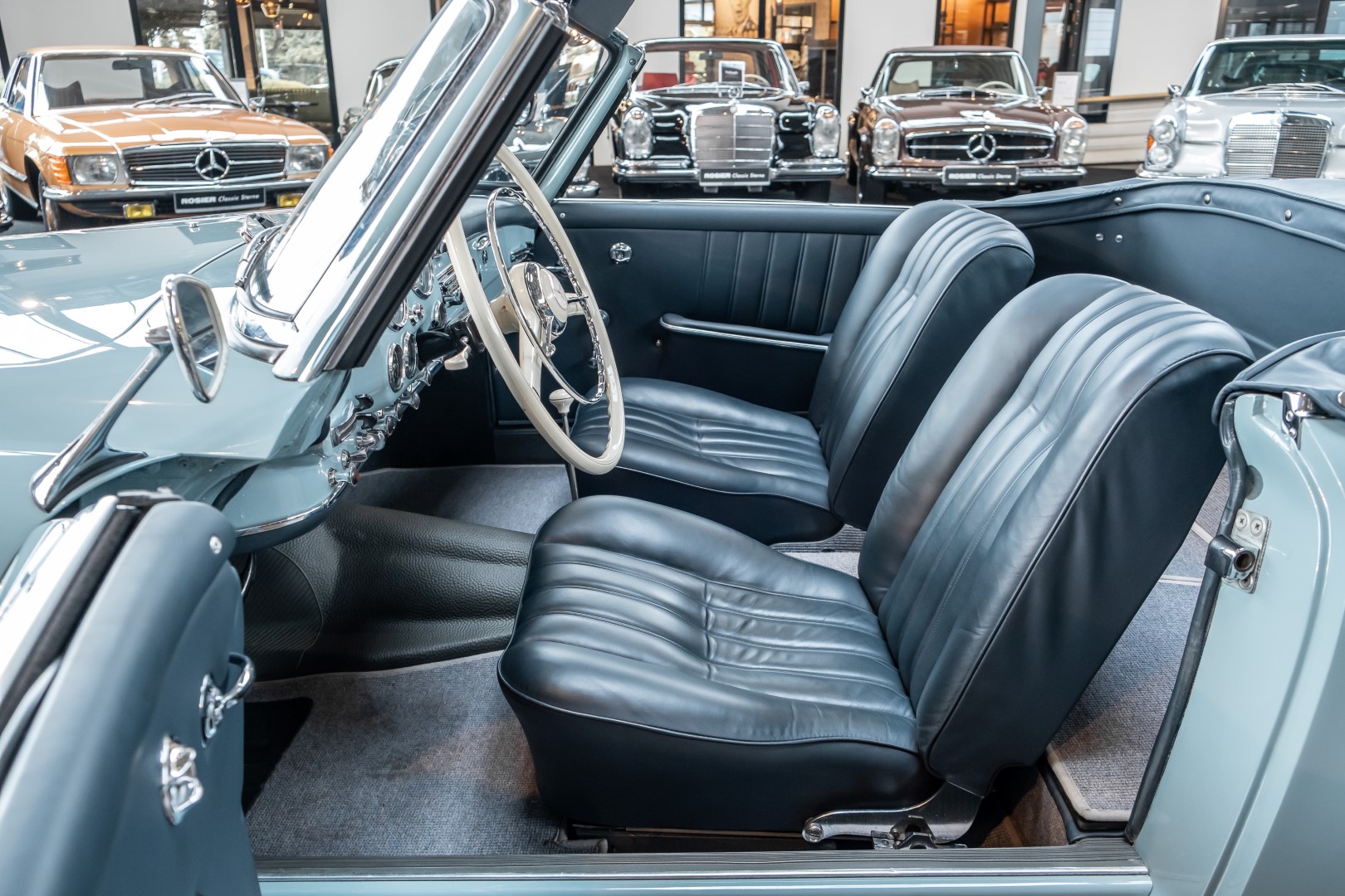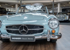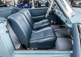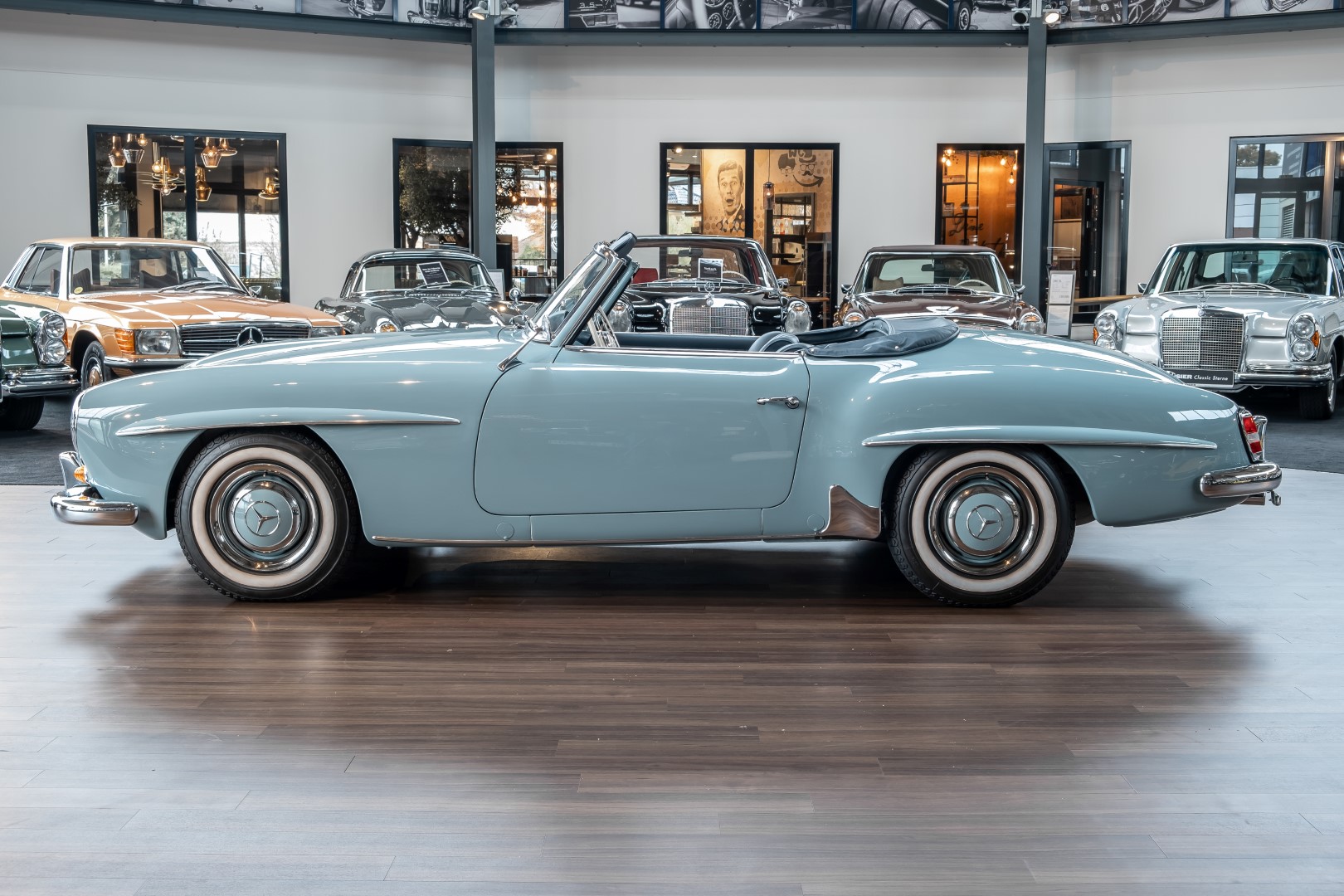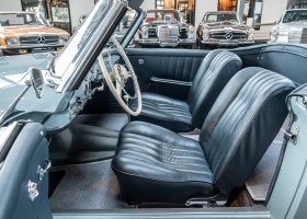 This dreamlike 190 SL of the W121 series was completed in 1962 and subsequently made it to sunny California. Over 40 years the vehicle remained in the sunshine state until the vehicle succeeded in 1997 back to Germany. Due to the dry and warm climate the basis for the restoration was ideal. The restoration was carried out by a renowned specialist company from the ground up and with a special degree of quality. The result is impressive: a flawless engine running, best driving characteristics and a dreamlike optical appearance - from the lacquer dress to the leather upholstery to the fabric top. A Mercedes enthusiast liked the classic roadster and spontaneously fell in love with the rare color combination of horizon blue with dark blue leather and soft top fabric. Lack of space is the reason why we are now able to offer you this vehicle from its exquisite collection. Experience this exception 190er. The next sunny days are sure to come.