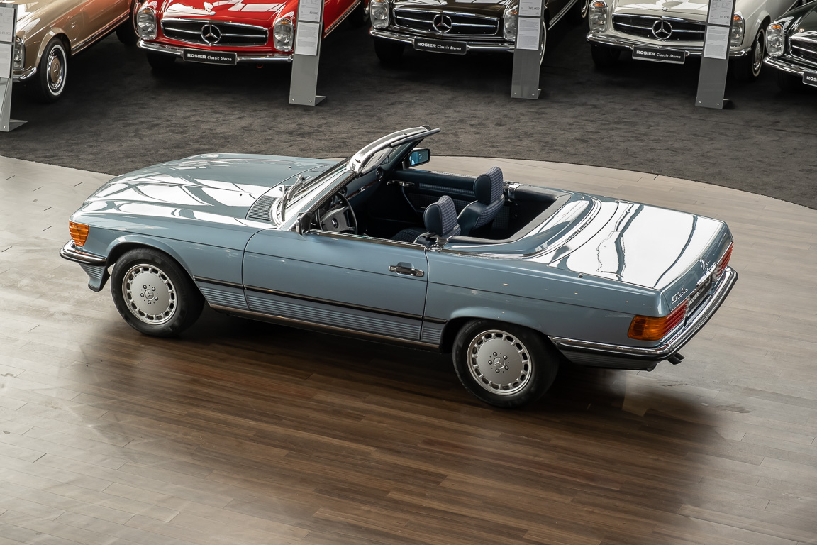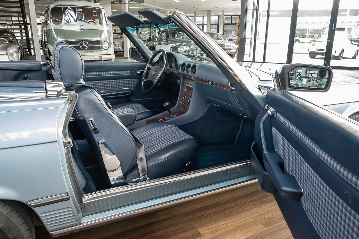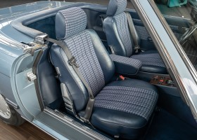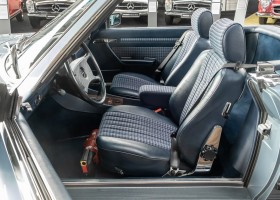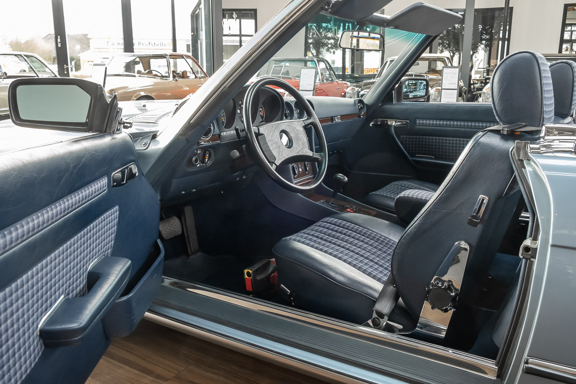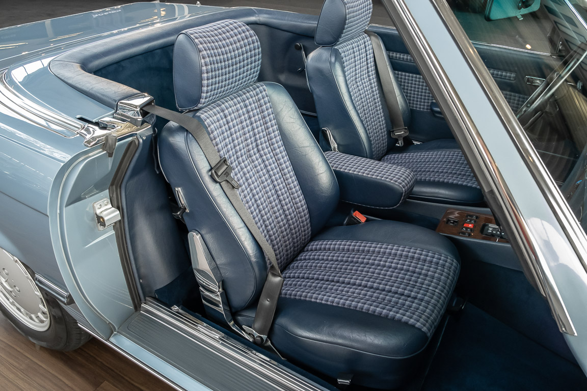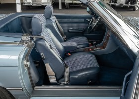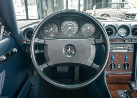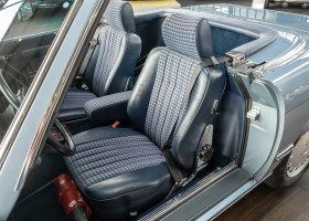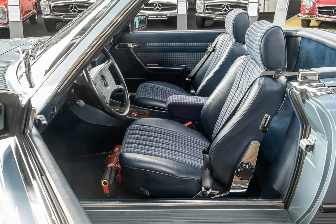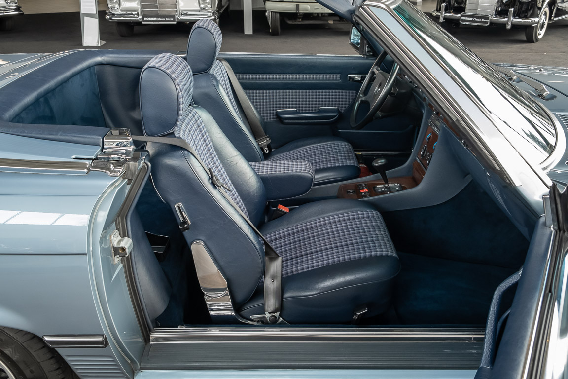 The present service booklet reveals an interesting history of this R107: On May 17, 1988, the vehicle was registered to a renowned hotel in the heart of Zurich. Probably the owner of the hotel fulfilled a long-cherished dream with this diamond-blue gem. Just a few weeks after delivery of the vehicle, in a Zurich suburb, the hotelier set off on a trip to Vigo, a picturesque town on the west coast of Spain. Judging by his Spanish family name, probably a visit to his homeland. It's hard to imagine the gorgeous roads that were traversed on the nearly 2,000-kilometer drive. Past Lake Geneva, through Lyon and Bordeaux, and through Spain's mountainous Basque country.