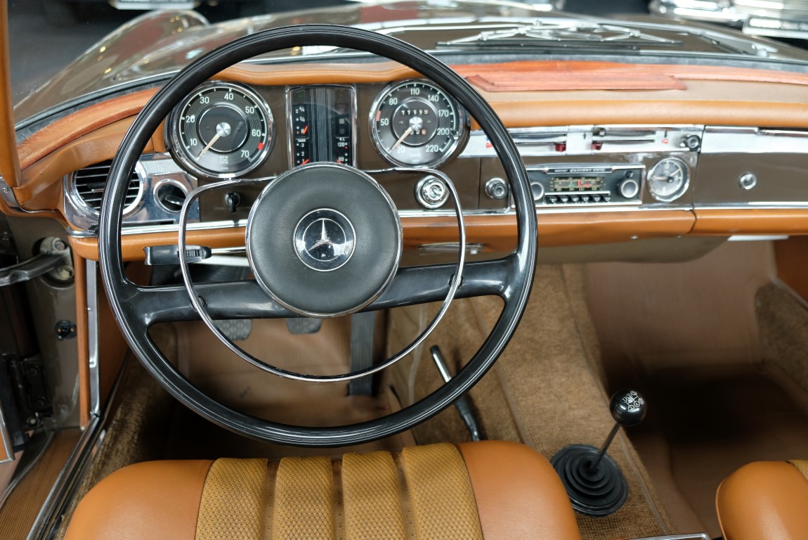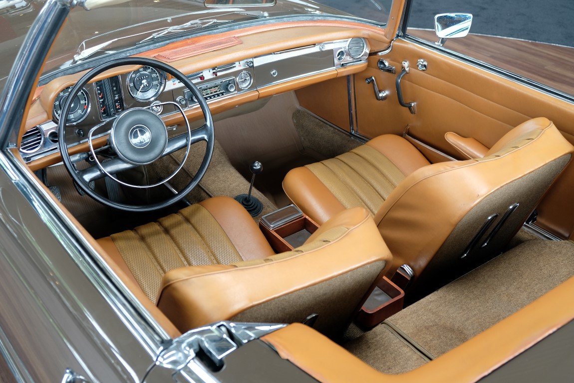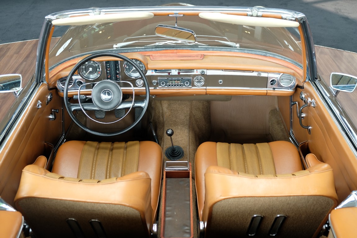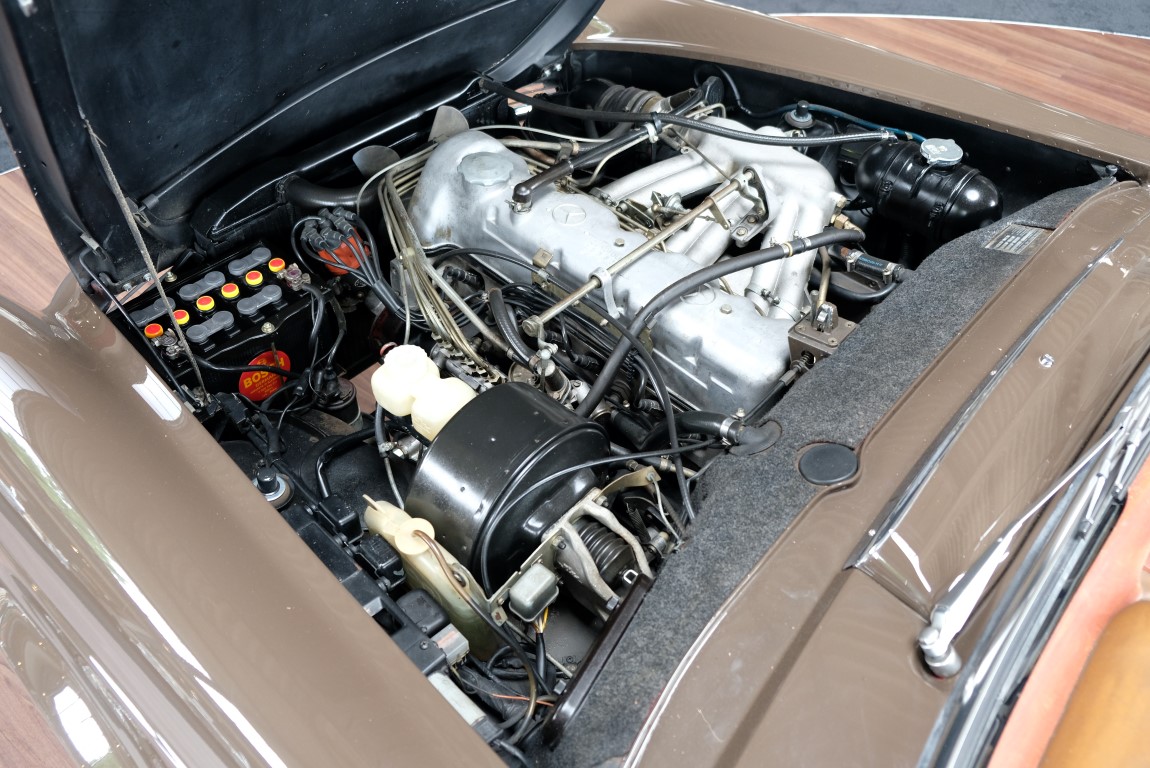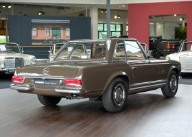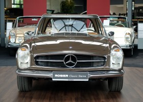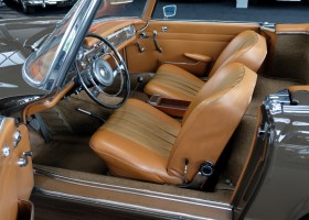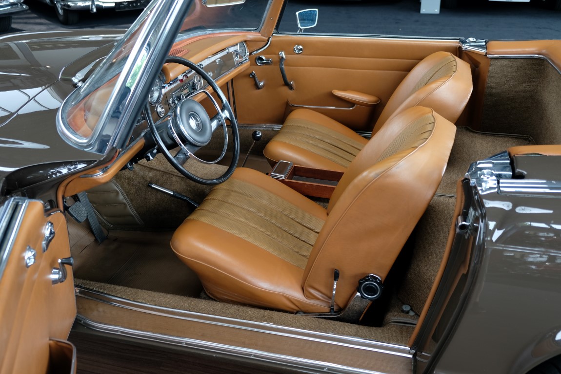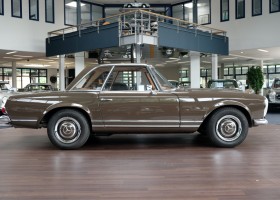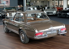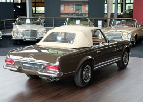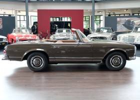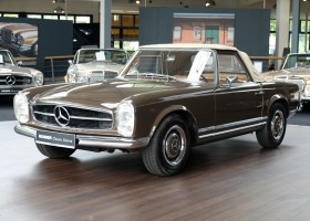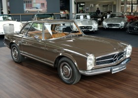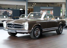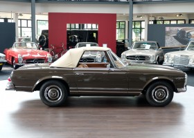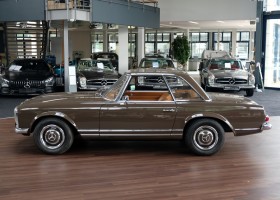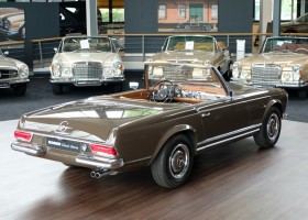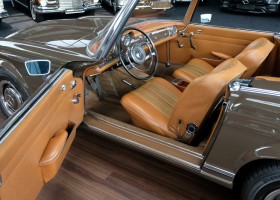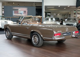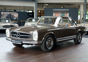 Die hier angebotene 250SL Pagode wurde am 02. August 1967 an einen erfolgreichen Goldschmid in Mailand/Italien durch die Mercedes-Benz Garage Genghini/Milano ausgeliefert. Die Auslieferungsfarbe war Havannabraun in Verbindung mit havannabraunem Coupé-Dach und cognacfarbenem Leder. An Eleganz kaum zu übertreffen war diese Farbkombination. Die Ausstattung umfasste das damals sehr teure 5-Gang-Getriebe, das bis heute original erhalten ist, ebenso wie der originale Motor. Der Wagen verblieb lange Jahre im sonnigen Italien und kam im Oktober 2013 in den Besitz eines Arztes in Genf/Schweiz. In 2016 erwarb die Pagode ein Mercedes-Benz Partner aus Deutschland und holte ihn in sein Geburtsland zurück. Hier unterzog er die Pagode einer aufwändigen, fachmännischen Restaurierung und versetzte den Wagen in seinen heutigen Superzustand. Eine Pagode direkt zum Losfahren und Fahrfreude genießen.