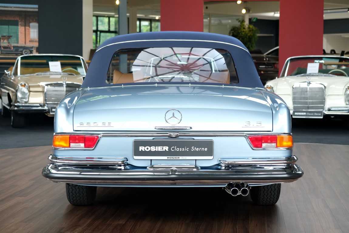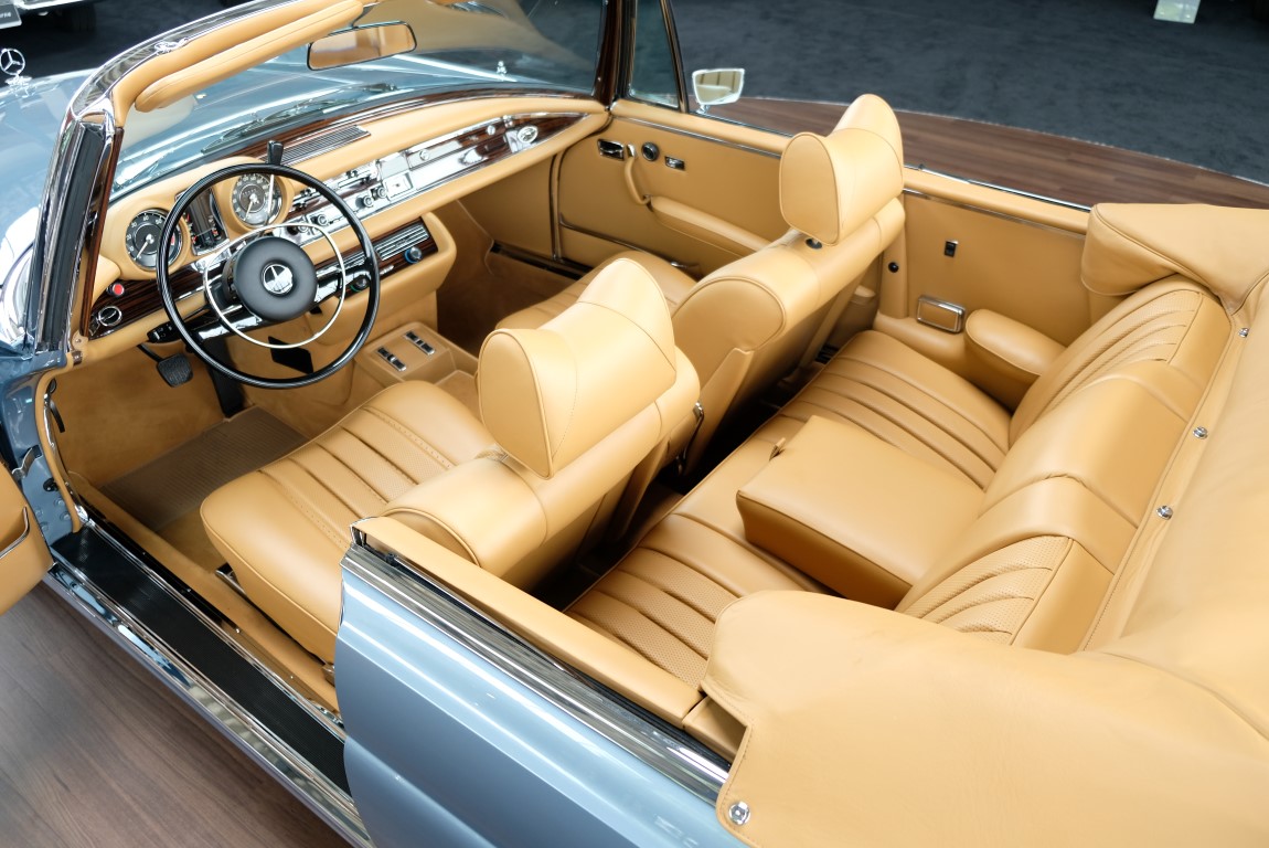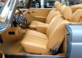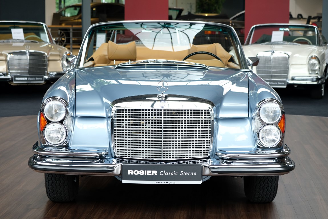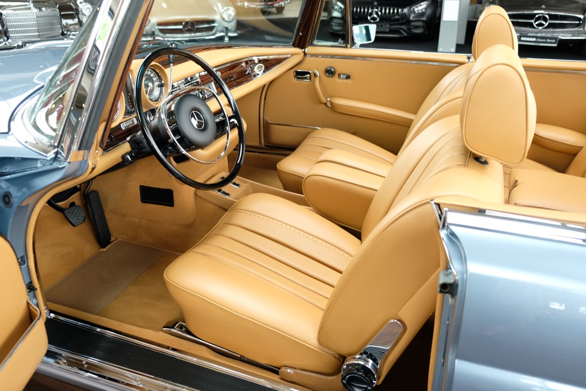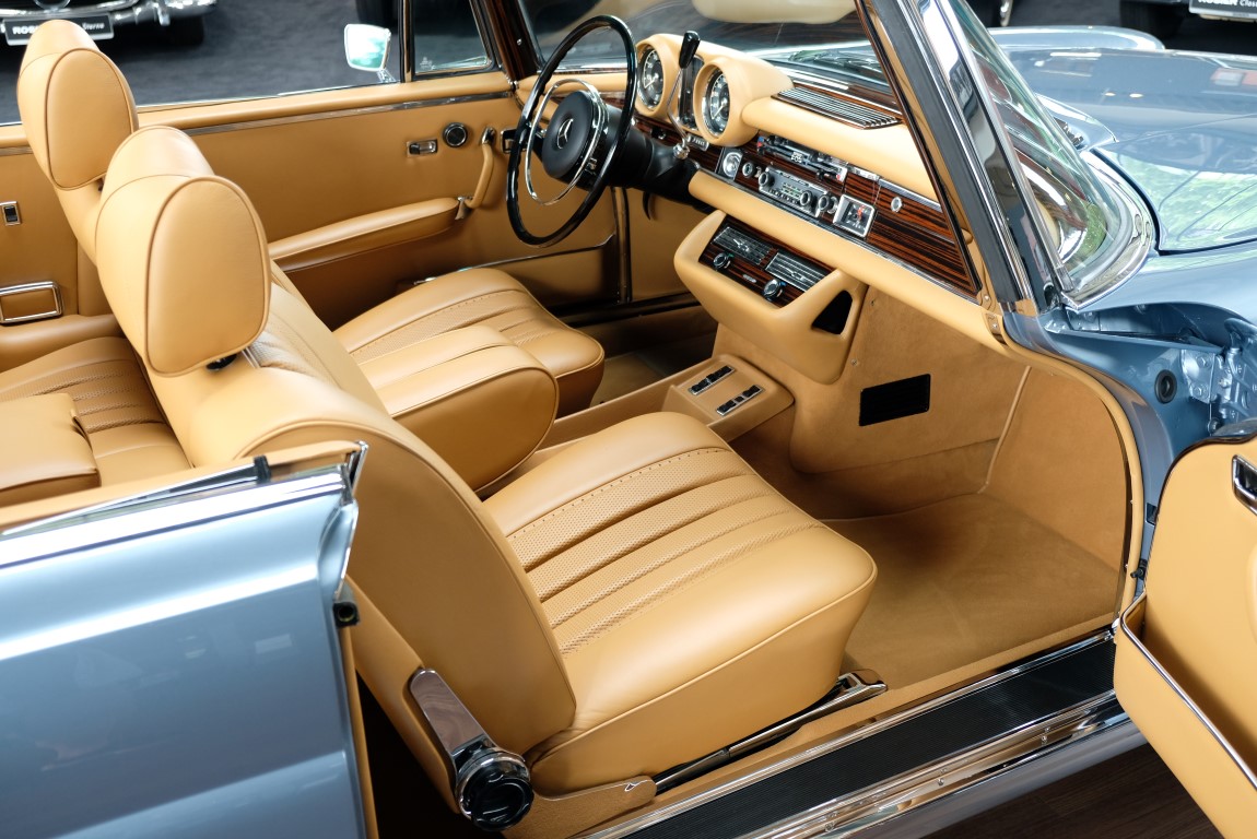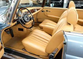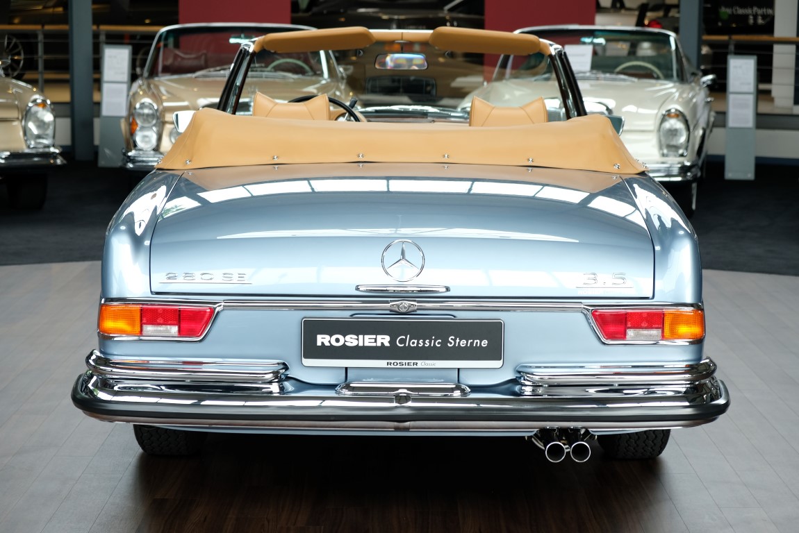 Er hatte für damalige Verhältnisse nahezu eine Vollausstattung. Von der wertvollen Original Behr Klimaanlage über Mittelarmlehnen, Becker Radio, elektrischen Fensterhebern bis zur üppigen, wohlriechenden Lederausstattung, alles war vorhanden. Nachdem der Wagen lange Jahre im Sunshine State Florida, in einer pompösen Villa in Naples bester Gegend zu Hause war, wurde er in 2014 nach Deutschland verkauft und kam in den Besitz der Rosier Classic-Sterne in Oldenburg. Ein Kunde erwarb das Cabriolet und beauftragte Rosier Classic-Sterne mit einer Qualitätsrestaurierung. Er wollte den Wagen mindestens in Neuwagenauslieferungszustand haben. In über 3 jähriger Arbeit wurde der Wagen bis auf die Rohkarosse zerlegt, die alte Lackierung entfernt und ein neuer Lackaufbau im Originalfarbton 906 vorgenommen. Der Chromzierrat wurde erneuert oder wo sinnvoll überarbeitet. Die Achsen wurden überholt, ebenso wie der V8 Motor und das Automatik-Getriebe. Es würde eine ultra lange Beschreibung, wenn wir hier den gesamten Umfang aufführen würden. Am Ende erhielt der Wagen nach Kundenwunsch eine komplett neue Lederausstattung mit kopfgefärbtem Leder im originalen Mercedes Farbton Cognac.