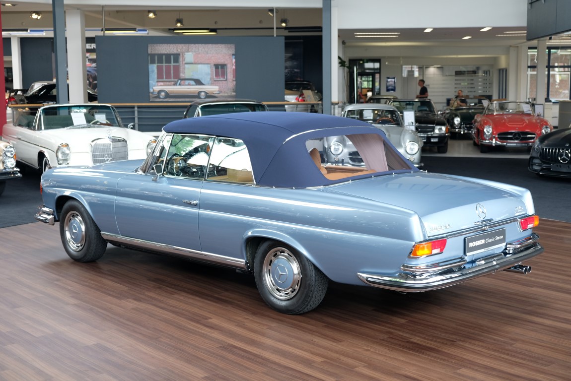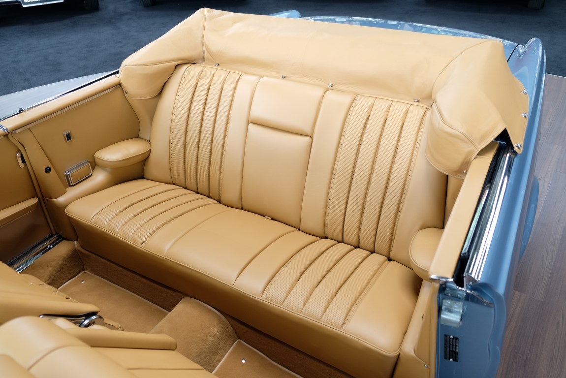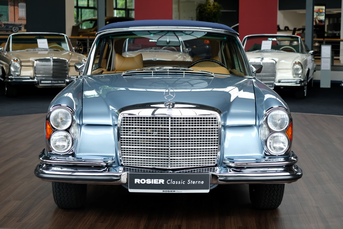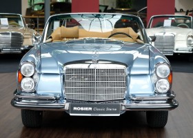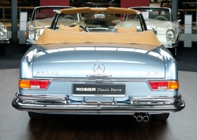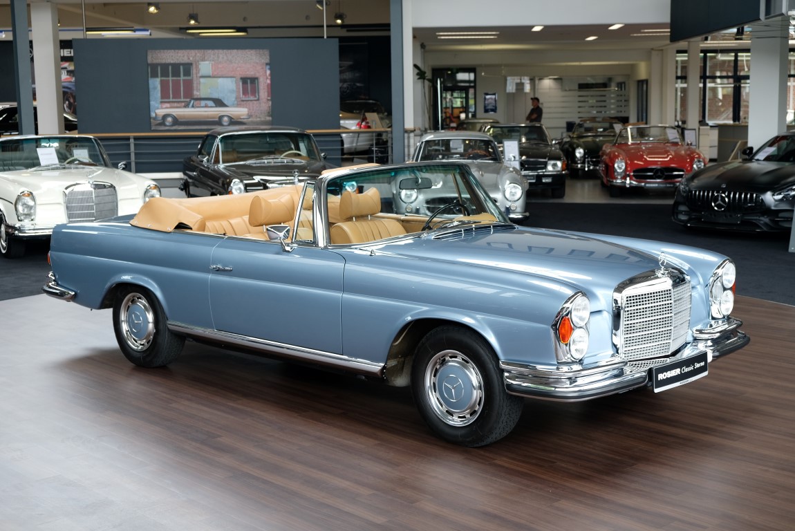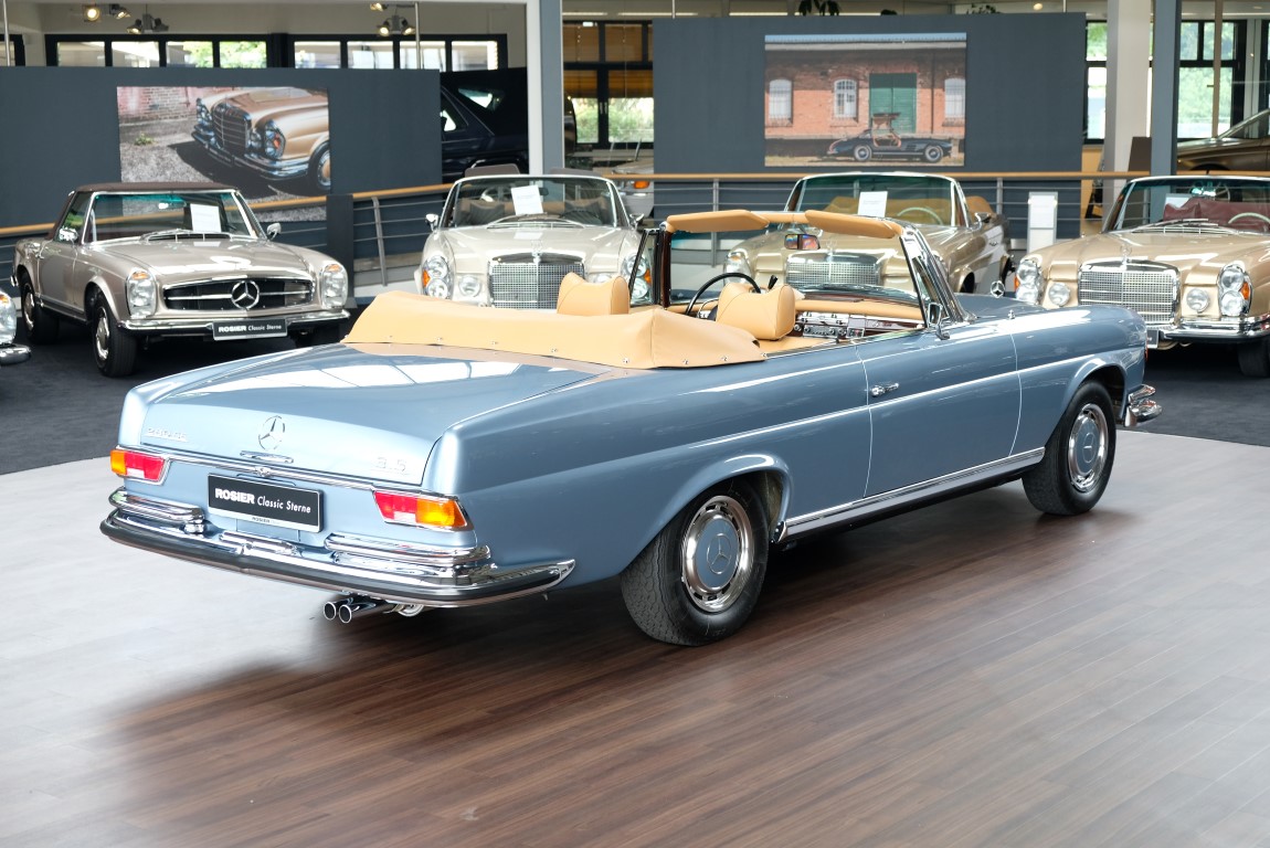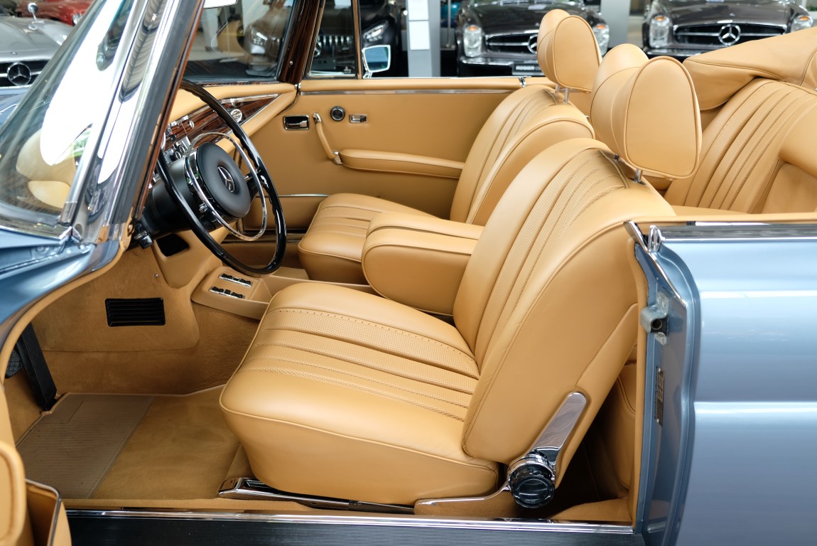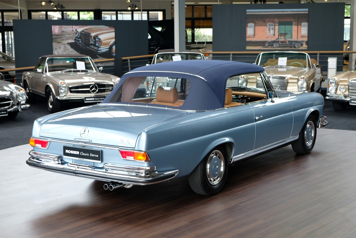 Er hatte für damalige Verhältnisse nahezu eine Vollausstattung. Von der wertvollen Original Behr Klimaanlage über Mittelarmlehnen, Becker Radio, elektrischen Fensterhebern bis zur üppigen, wohlriechenden Lederausstattung, alles war vorhanden. Nachdem der Wagen lange Jahre im Sunshine State Florida, in einer pompösen Villa in Naples bester Gegend zu Hause war, wurde er in 2014 nach Deutschland verkauft und kam in den Besitz der Rosier Classic-Sterne in Oldenburg. Ein Kunde erwarb das Cabriolet und beauftragte Rosier Classic-Sterne mit einer Qualitätsrestaurierung. Er wollte den Wagen mindestens in Neuwagenauslieferungszustand haben. In über 3 jähriger Arbeit wurde der Wagen bis auf die Rohkarosse zerlegt, die alte Lackierung entfernt und ein neuer Lackaufbau im Originalfarbton 906 vorgenommen. Der Chromzierrat wurde erneuert oder wo sinnvoll überarbeitet. Die Achsen wurden überholt, ebenso wie der V8 Motor und das Automatik-Getriebe. Es würde eine ultra lange Beschreibung, wenn wir hier den gesamten Umfang aufführen würden. Am Ende erhielt der Wagen nach Kundenwunsch eine komplett neue Lederausstattung mit kopfgefärbtem Leder im originalen Mercedes Farbton Cognac.