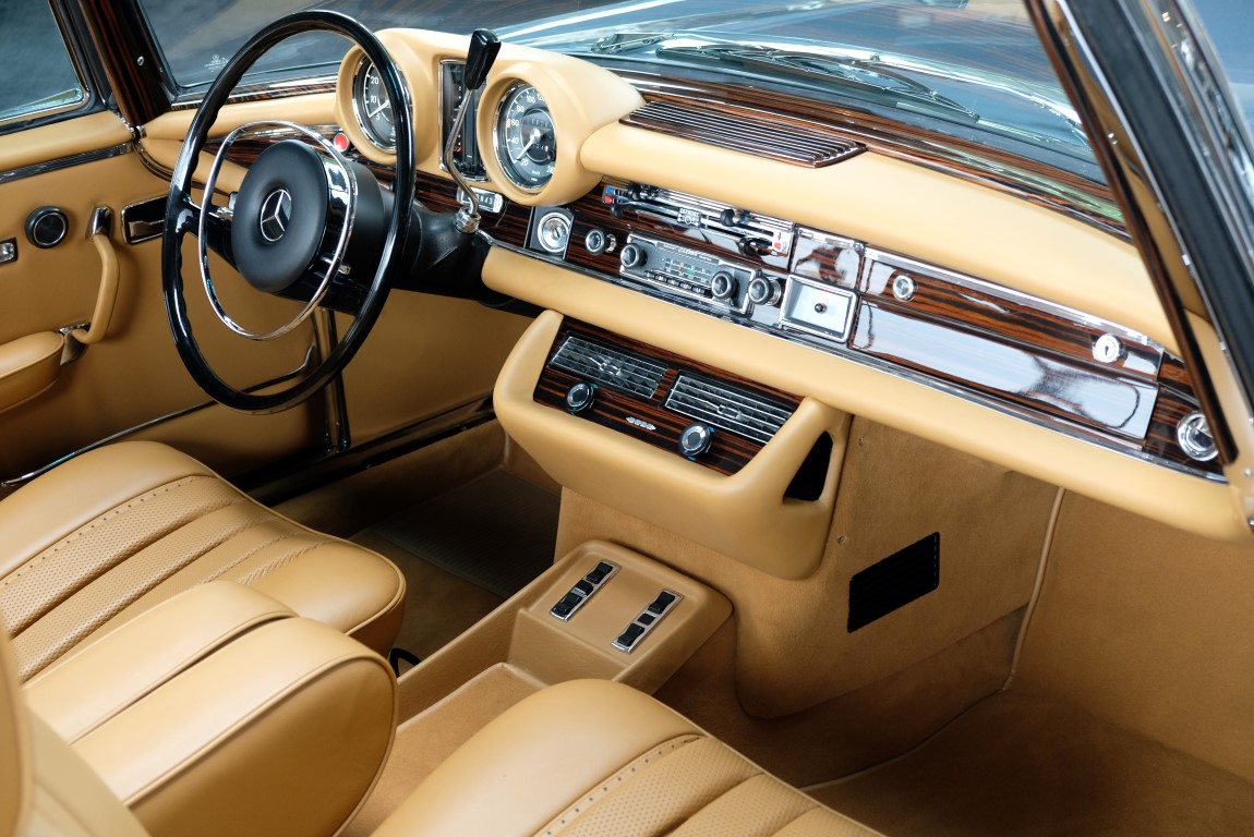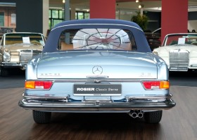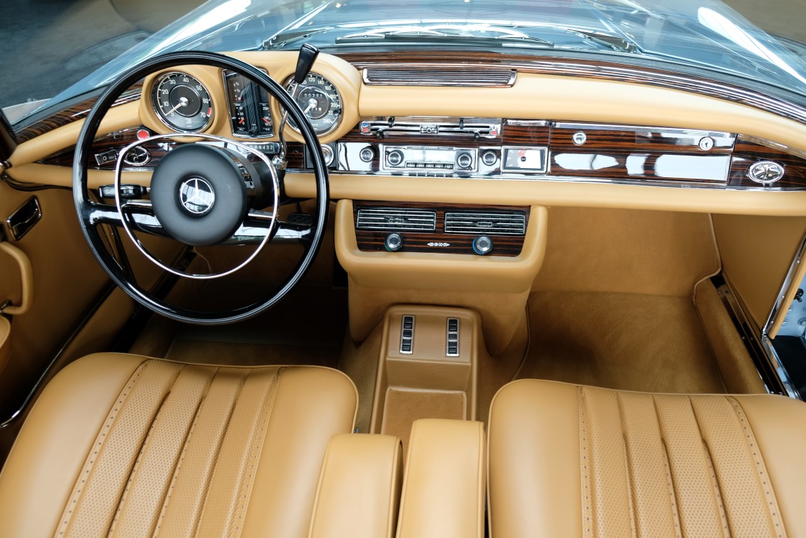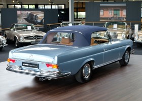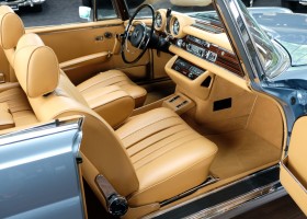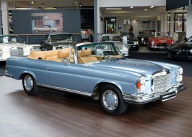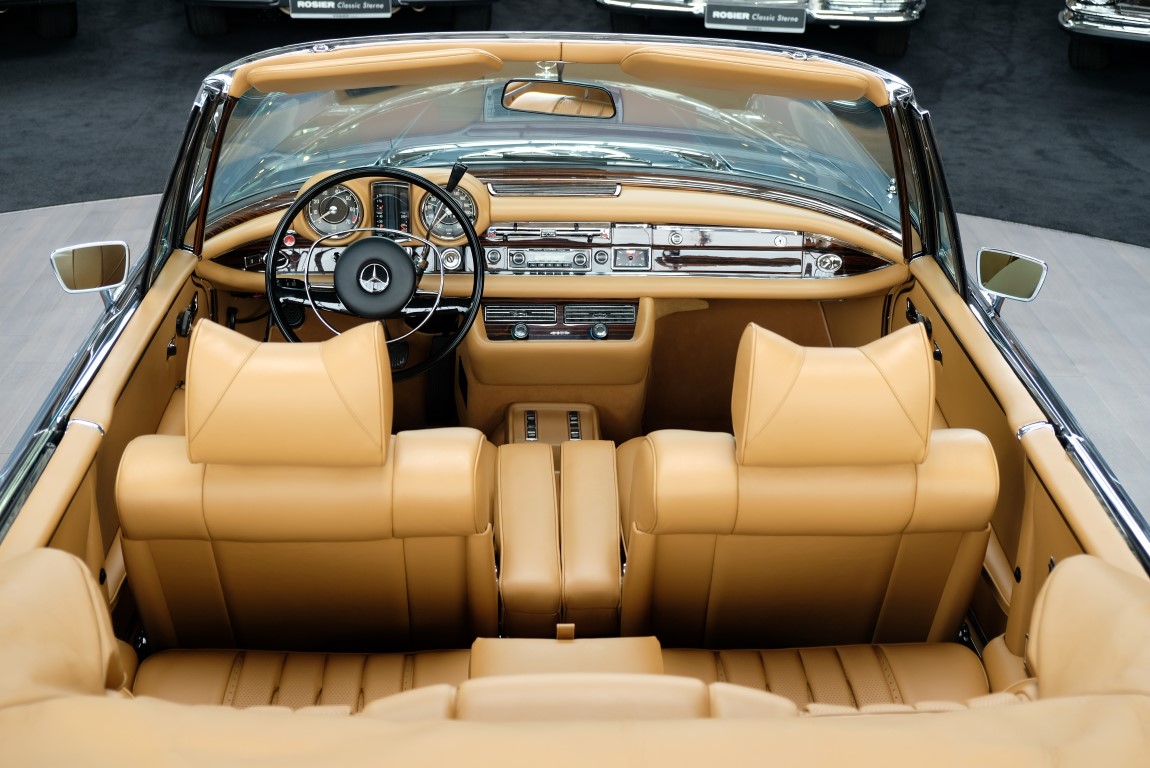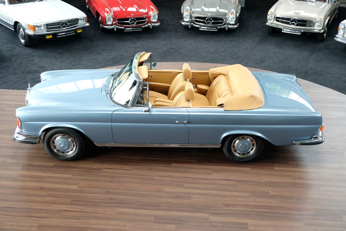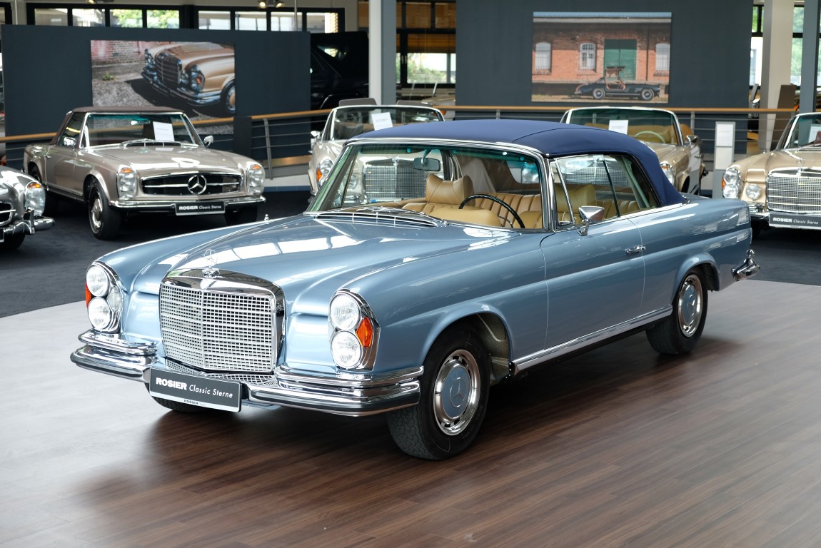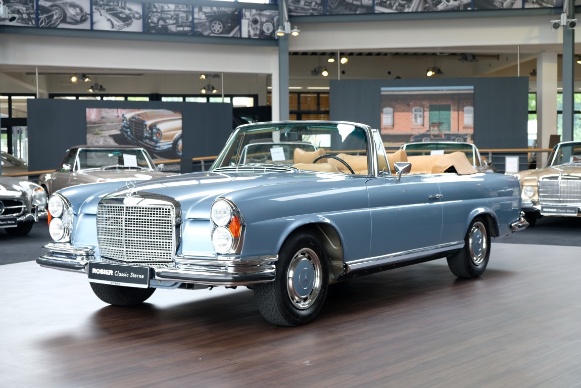 Er hatte für damalige Verhältnisse nahezu eine Vollausstattung. Von der wertvollen Original Behr Klimaanlage über Mittelarmlehnen, Becker Radio, elektrischen Fensterhebern bis zur üppigen, wohlriechenden Lederausstattung, alles war vorhanden. Nachdem der Wagen lange Jahre im Sunshine State Florida, in einer pompösen Villa in Naples bester Gegend zu Hause war, wurde er in 2014 nach Deutschland verkauft und kam in den Besitz der Rosier Classic-Sterne in Oldenburg. Ein Kunde erwarb das Cabriolet und beauftragte Rosier Classic-Sterne mit einer Qualitätsrestaurierung. Er wollte den Wagen mindestens in Neuwagenauslieferungszustand haben. In über 3 jähriger Arbeit wurde der Wagen bis auf die Rohkarosse zerlegt, die alte Lackierung entfernt und ein neuer Lackaufbau im Originalfarbton 906 vorgenommen. Der Chromzierrat wurde erneuert oder wo sinnvoll überarbeitet. Die Achsen wurden überholt, ebenso wie der V8 Motor und das Automatik-Getriebe. Es würde eine ultra lange Beschreibung, wenn wir hier den gesamten Umfang aufführen würden. Am Ende erhielt der Wagen nach Kundenwunsch eine komplett neue Lederausstattung mit kopfgefärbtem Leder im originalen Mercedes Farbton Cognac.
