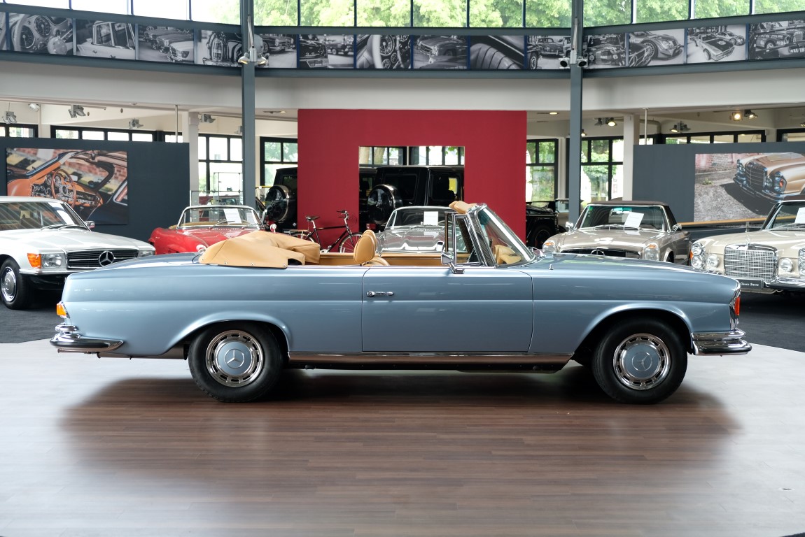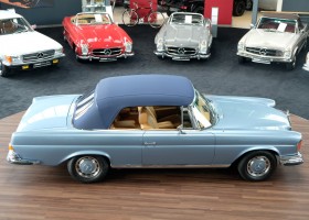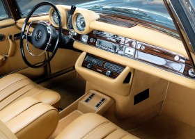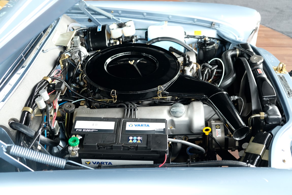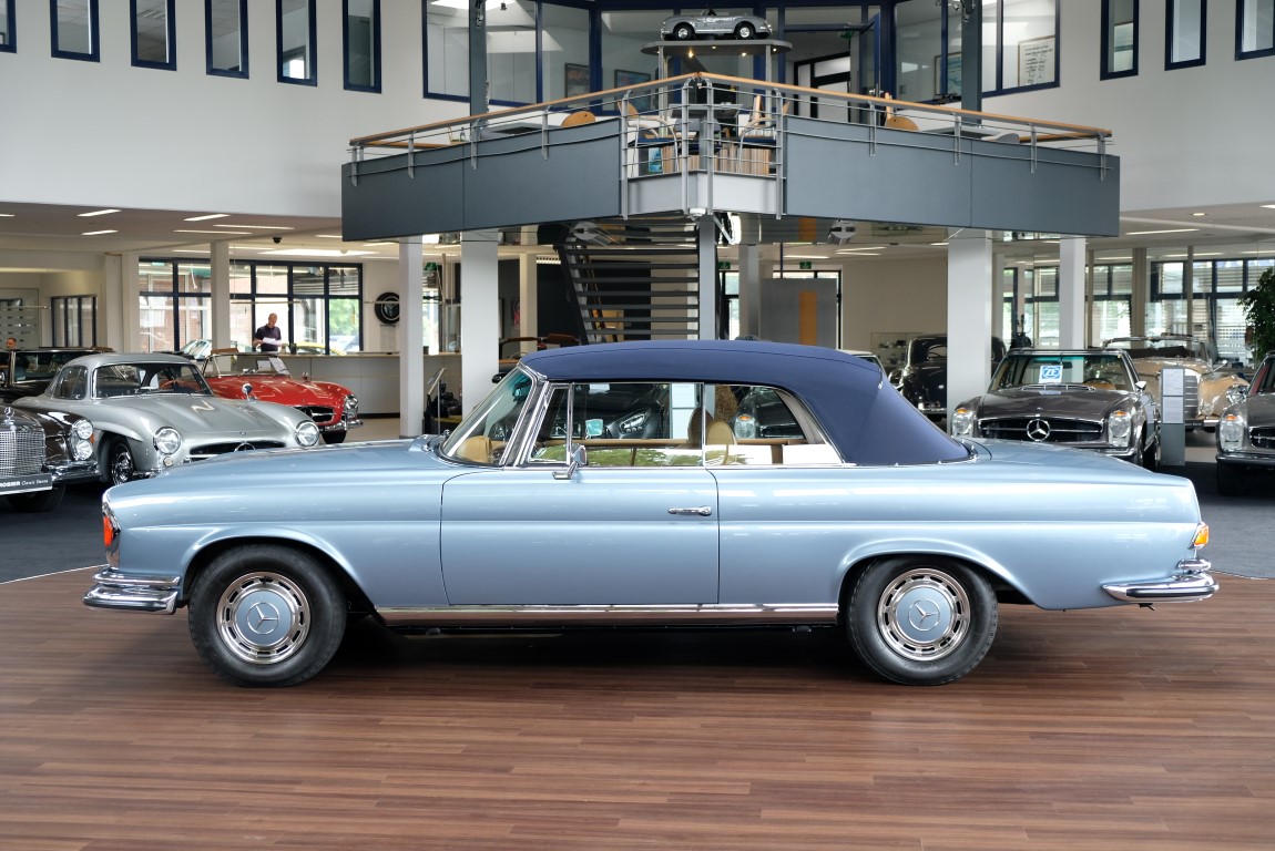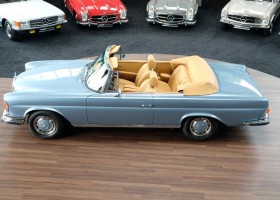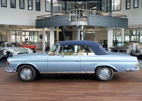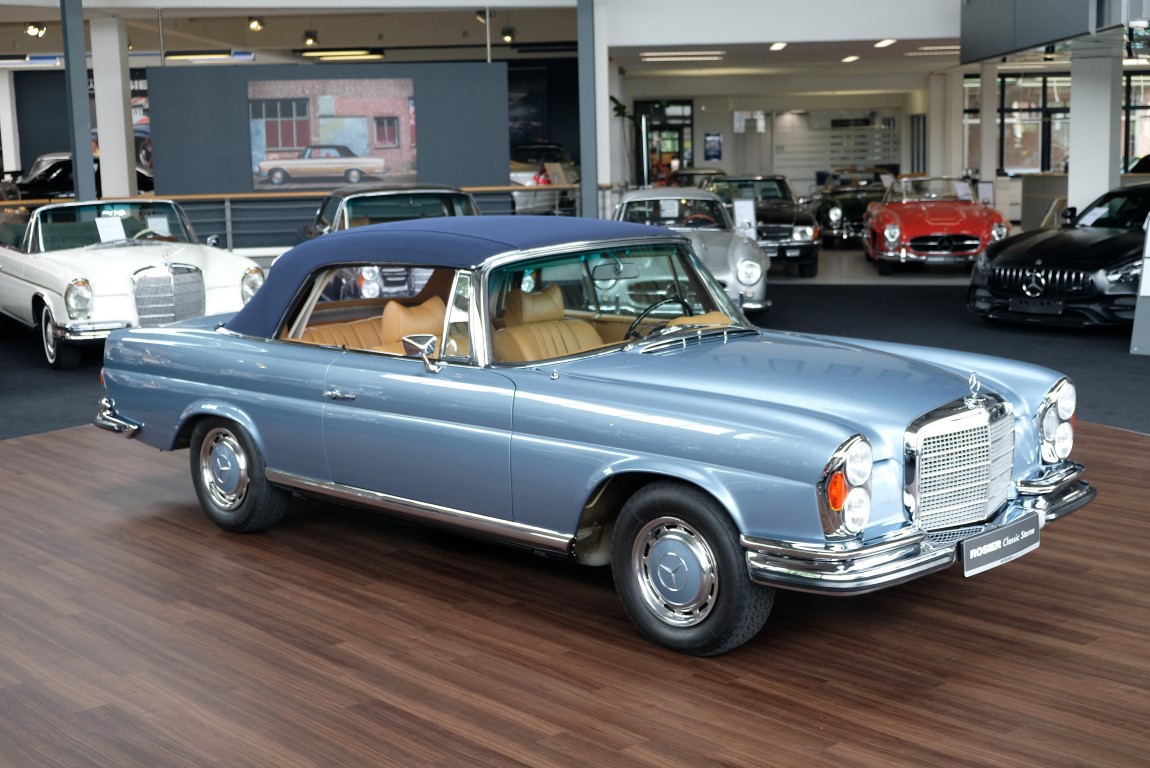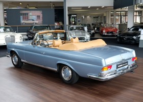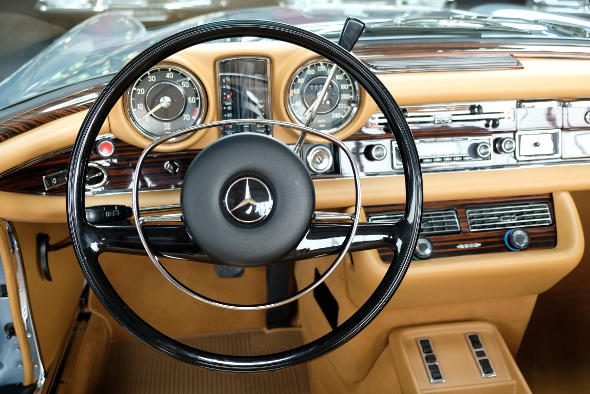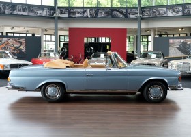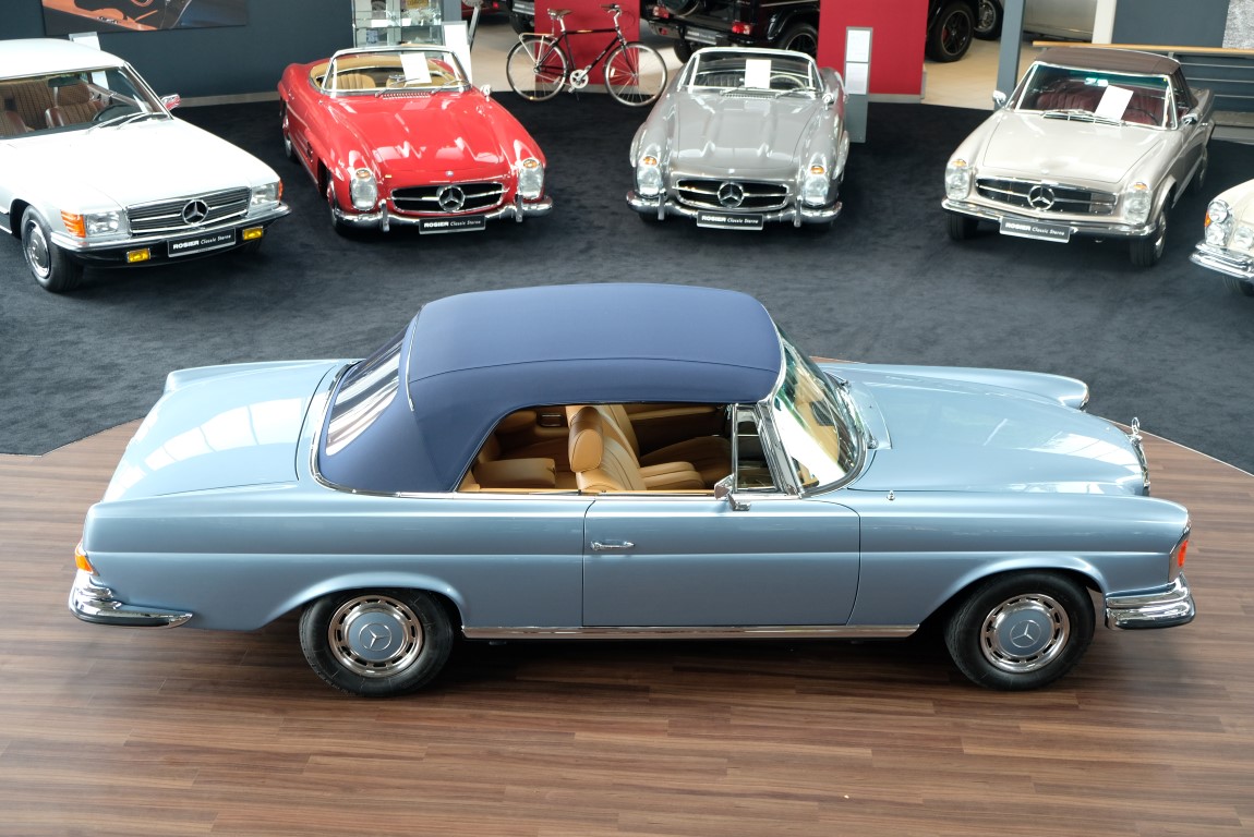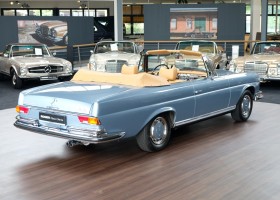 Er hatte für damalige Verhältnisse nahezu eine Vollausstattung. Von der wertvollen Original Behr Klimaanlage über Mittelarmlehnen, Becker Radio, elektrischen Fensterhebern bis zur üppigen, wohlriechenden Lederausstattung, alles war vorhanden. Nachdem der Wagen lange Jahre im Sunshine State Florida, in einer pompösen Villa in Naples bester Gegend zu Hause war, wurde er in 2014 nach Deutschland verkauft und kam in den Besitz der Rosier Classic-Sterne in Oldenburg. Ein Kunde erwarb das Cabriolet und beauftragte Rosier Classic-Sterne mit einer Qualitätsrestaurierung. Er wollte den Wagen mindestens in Neuwagenauslieferungszustand haben. In über 3 jähriger Arbeit wurde der Wagen bis auf die Rohkarosse zerlegt, die alte Lackierung entfernt und ein neuer Lackaufbau im Originalfarbton 906 vorgenommen. Der Chromzierrat wurde erneuert oder wo sinnvoll überarbeitet. Die Achsen wurden überholt, ebenso wie der V8 Motor und das Automatik-Getriebe. Es würde eine ultra lange Beschreibung, wenn wir hier den gesamten Umfang aufführen würden. Am Ende erhielt der Wagen nach Kundenwunsch eine komplett neue Lederausstattung mit kopfgefärbtem Leder im originalen Mercedes Farbton Cognac.