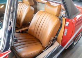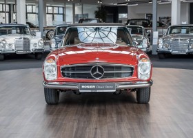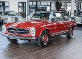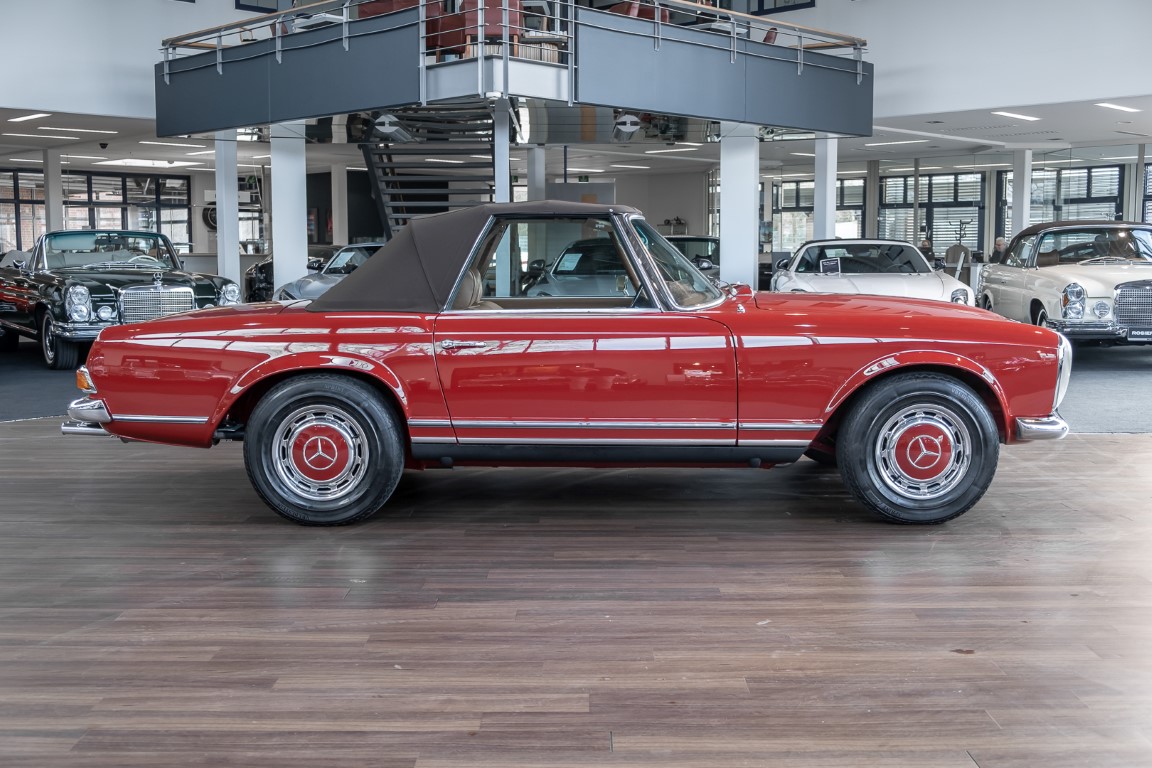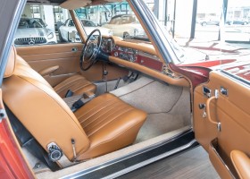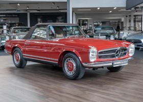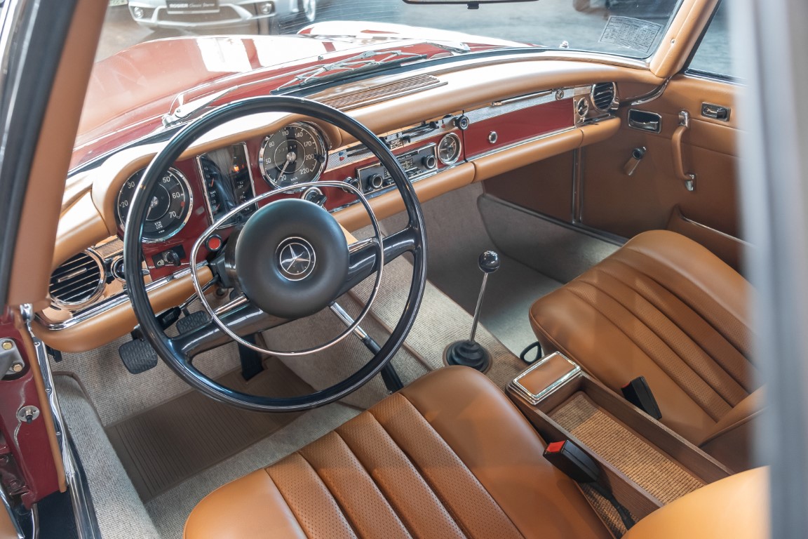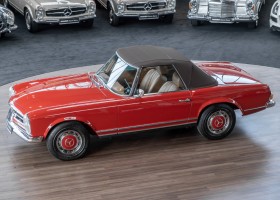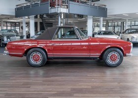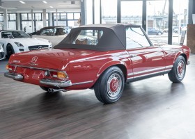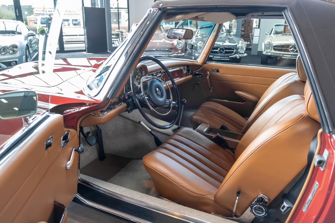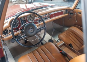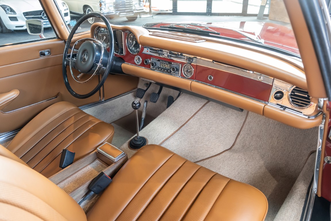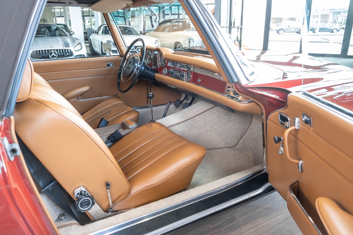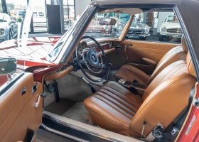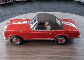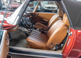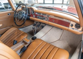 Eine interessante Pagode mit nachvollziehbarer Historie, die sofort startklar auch für ausgedehnte Ausflüge gewesen wäre. Unsere Pläne für das Fahrzeug jedoch waren andere. Unter unserer Regie wurde der Wagen einer umfangrewichen Restaurierung unterzoigen. Die Aufgabe war eine Qualitätsrestaurierung auf höchstem handwerklichen Niveau zu erreichen. Sehen Sie selbst, das Zielwurd eexzellent erreicht. Die Karosserie wurde aufwändig überarbeitet und neu lackiert, Achsen und Getriebe sind revidiert worden, der Motor geprüft und nach bestandener Druckverlustprüfung fein eingestellt. Ein kraftvoller Lauf und ein sauberes Kompressionsbild unterstreichen das Ergebnis. Um das Interior aufzuwerten und der Gesamtoptik den letzten Schliff zu geben, entschieden wir uns das Interior mit feinem Leder in Cognac anstatt des originalen MB-Tex aufzuwerten. Ein Verdeck in dunkelbraun macht diese Pagode zu einem echten Hingucker. Alles in allem eine besondere Pagode, die durch einmaligen Charme zu überzeugen weiß und mit Handschaltung zu begeistern weiß. Steigen Sie ein und erfahren Sie diese Traum-Pagode mit allen Sinnen.