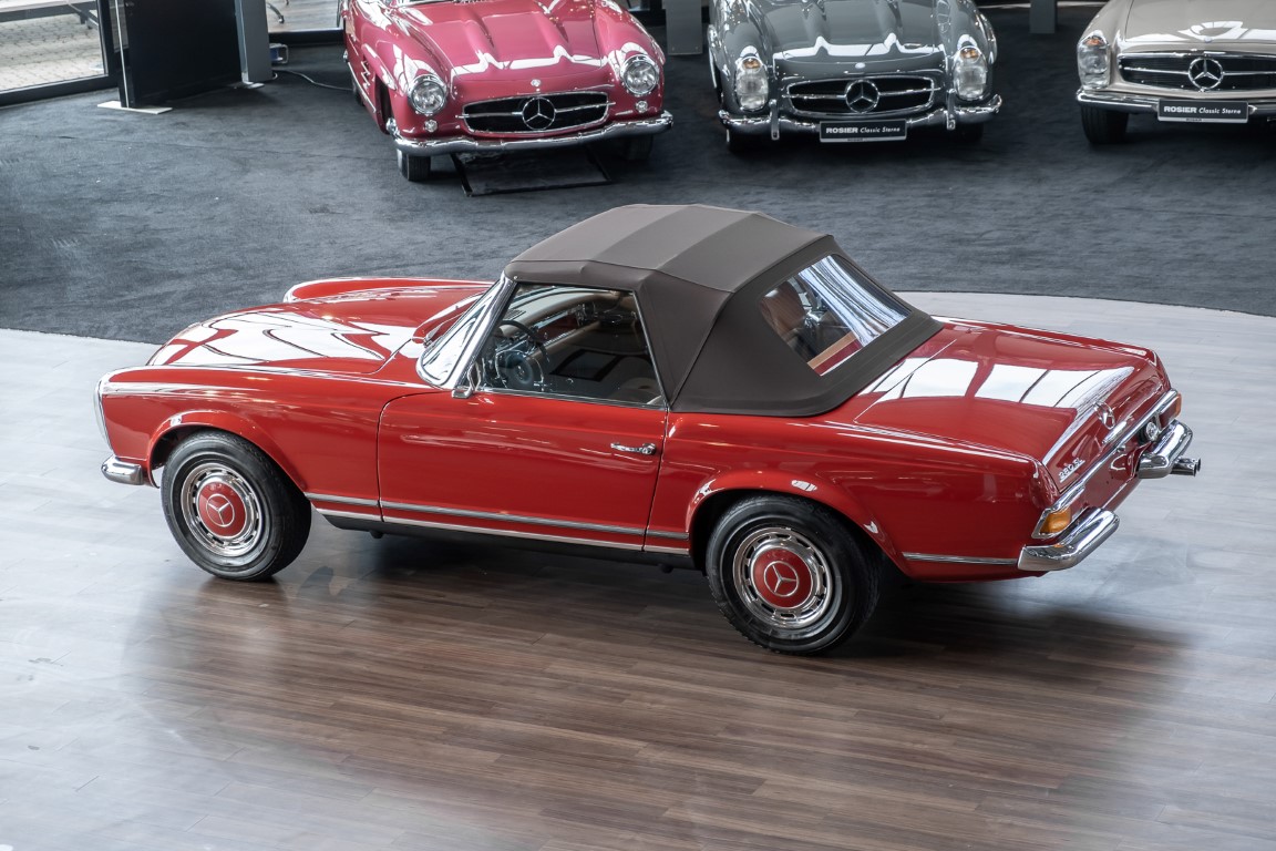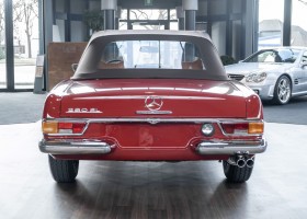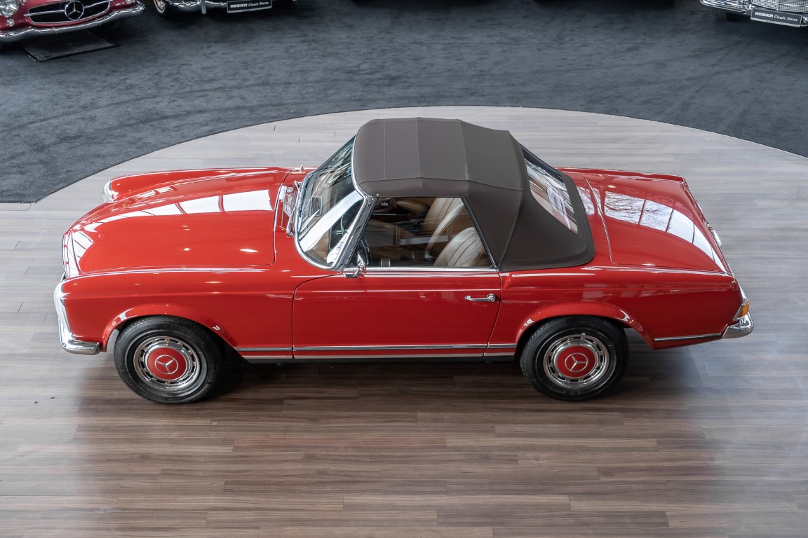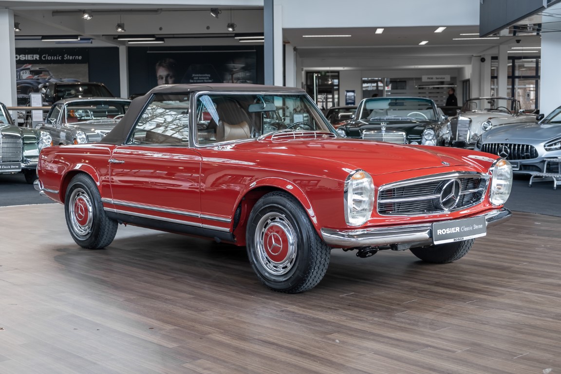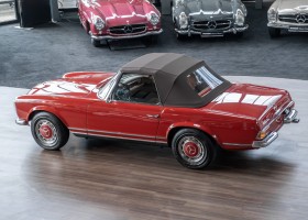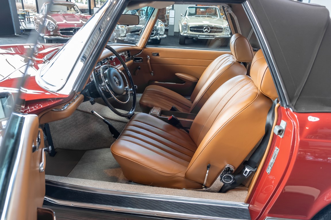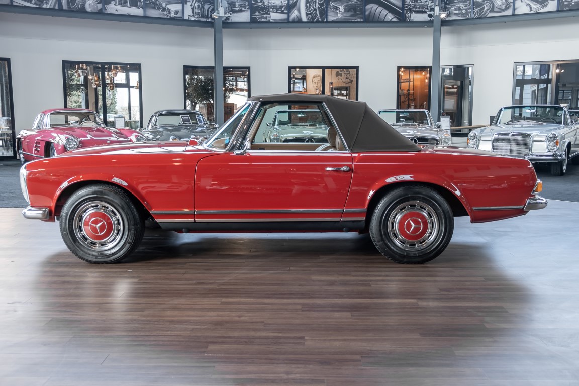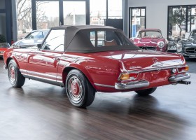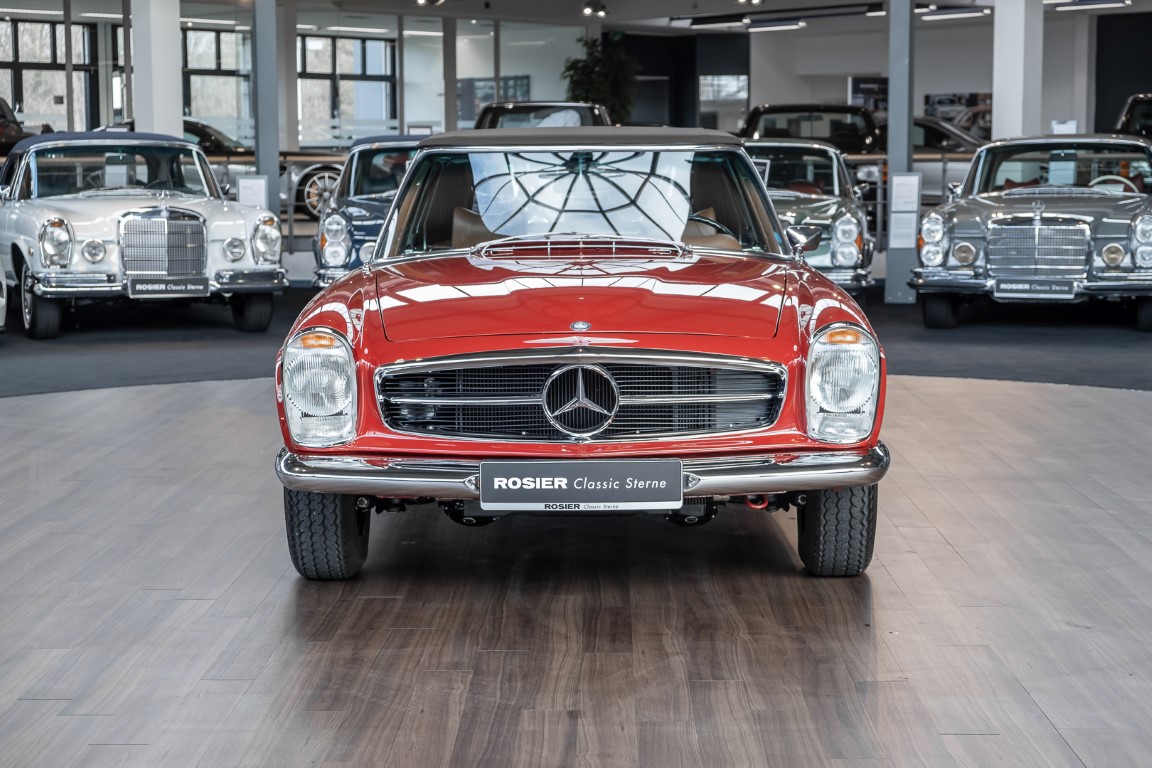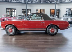 Eine interessante Pagode mit nachvollziehbarer Historie, die sofort startklar auch für ausgedehnte Ausflüge gewesen wäre. Unsere Pläne für das Fahrzeug jedoch waren andere. Unter unserer Regie wurde der Wagen einer umfangrewichen Restaurierung unterzoigen. Die Aufgabe war eine Qualitätsrestaurierung auf höchstem handwerklichen Niveau zu erreichen. Sehen Sie selbst, das Zielwurd eexzellent erreicht. Die Karosserie wurde aufwändig überarbeitet und neu lackiert, Achsen und Getriebe sind revidiert worden, der Motor geprüft und nach bestandener Druckverlustprüfung fein eingestellt. Ein kraftvoller Lauf und ein sauberes Kompressionsbild unterstreichen das Ergebnis. Um das Interior aufzuwerten und der Gesamtoptik den letzten Schliff zu geben, entschieden wir uns das Interior mit feinem Leder in Cognac anstatt des originalen MB-Tex aufzuwerten. Ein Verdeck in dunkelbraun macht diese Pagode zu einem echten Hingucker. Alles in allem eine besondere Pagode, die durch einmaligen Charme zu überzeugen weiß und mit Handschaltung zu begeistern weiß. Steigen Sie ein und erfahren Sie diese Traum-Pagode mit allen Sinnen.
