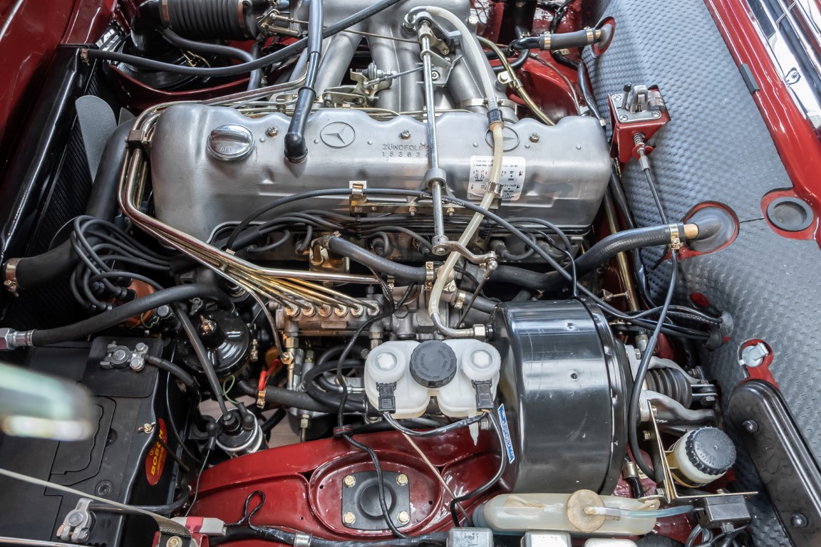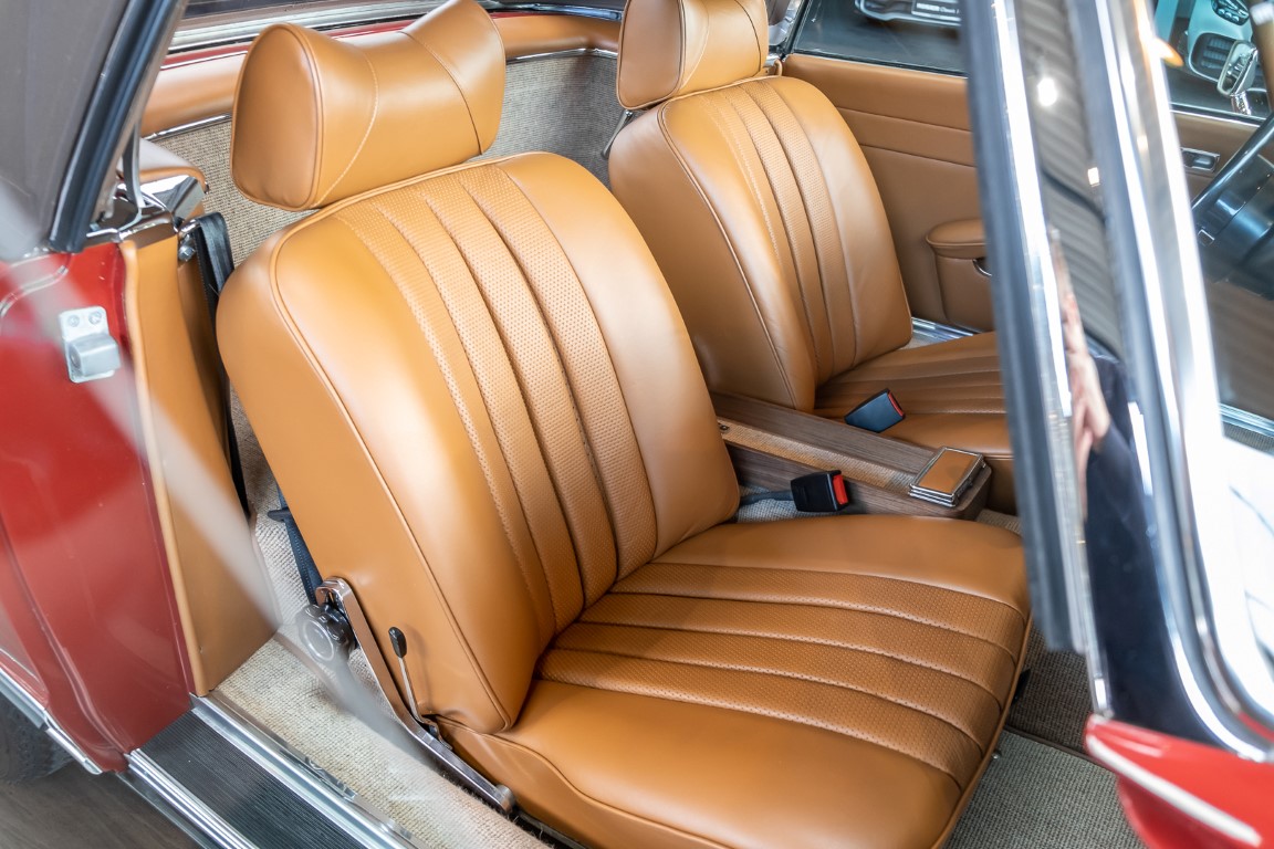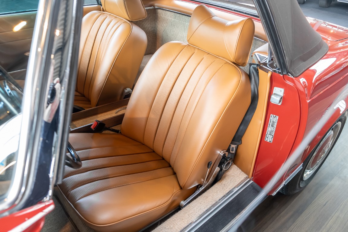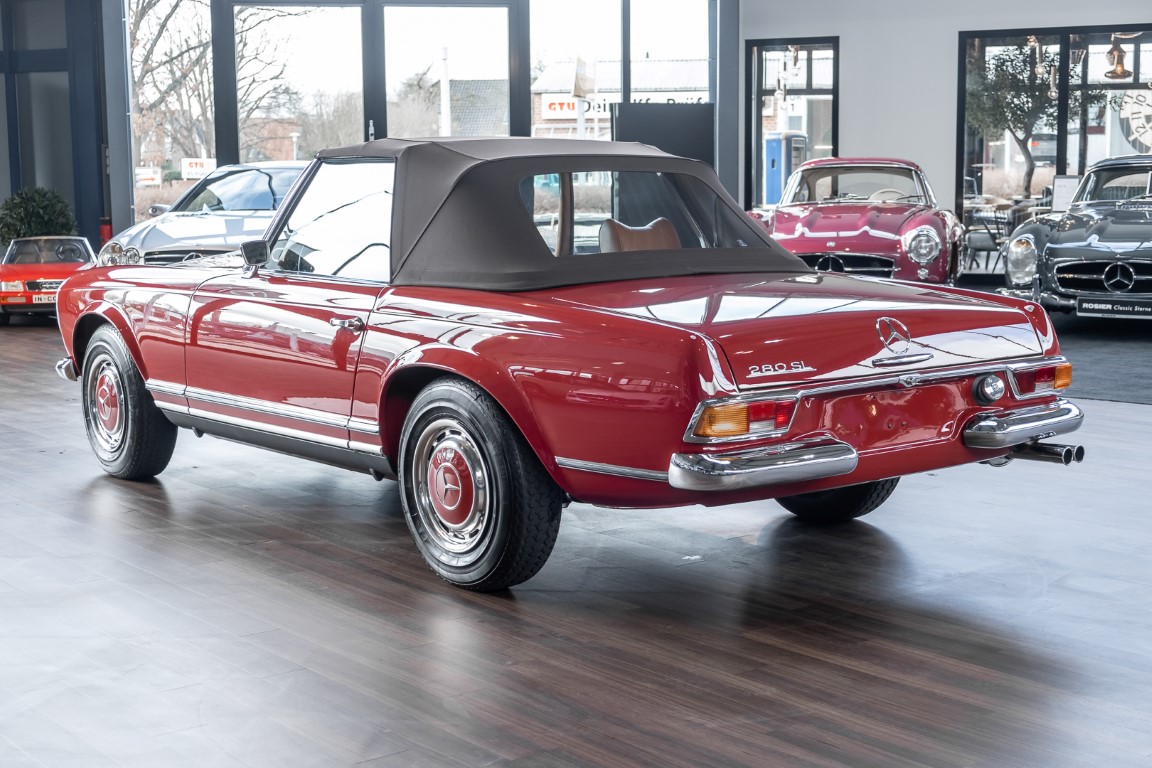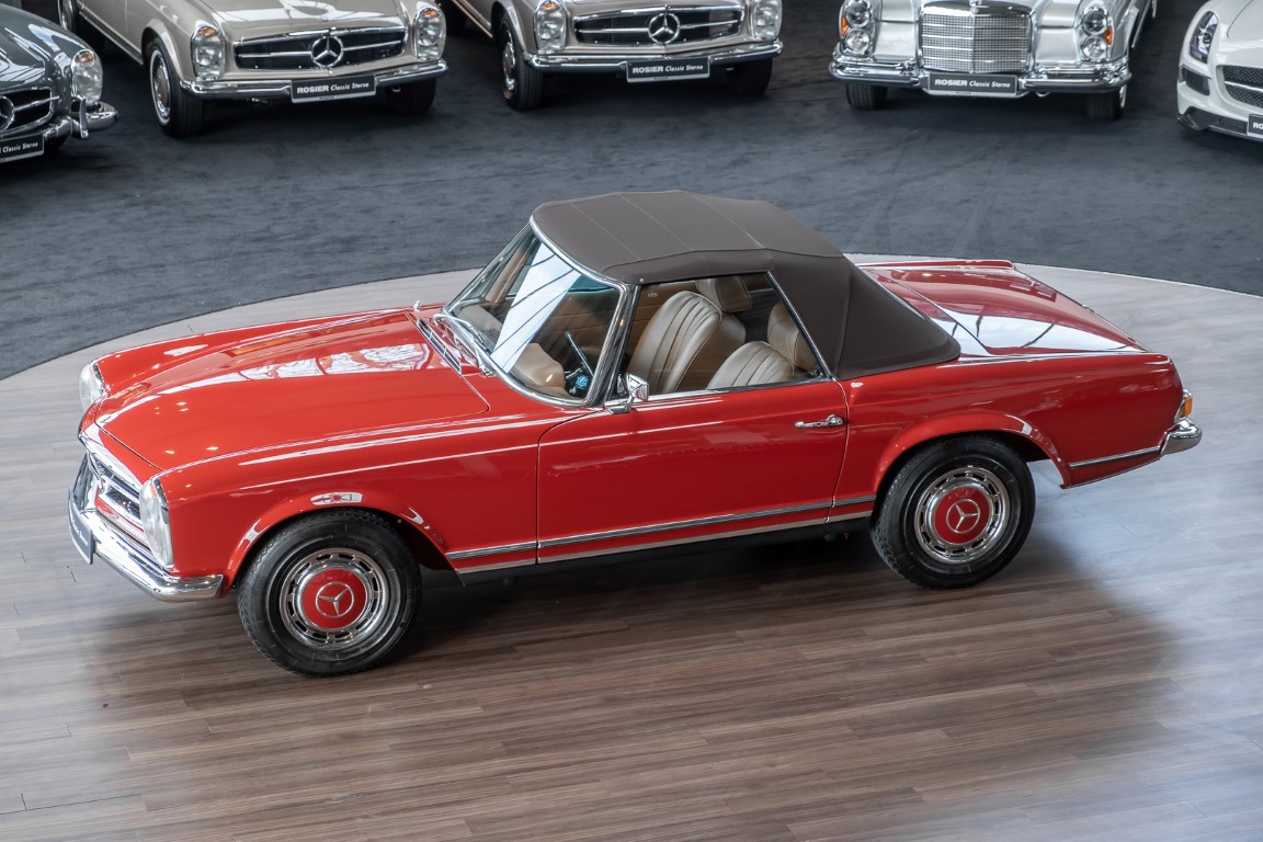 Eine interessante Pagode mit nachvollziehbarer Historie, die sofort startklar auch für ausgedehnte Ausflüge gewesen wäre. Unsere Pläne für das Fahrzeug jedoch waren andere. Unter unserer Regie wurde der Wagen einer umfangrewichen Restaurierung unterzoigen. Die Aufgabe war eine Qualitätsrestaurierung auf höchstem handwerklichen Niveau zu erreichen. Sehen Sie selbst, das Zielwurd eexzellent erreicht. Die Karosserie wurde aufwändig überarbeitet und neu lackiert, Achsen und Getriebe sind revidiert worden, der Motor geprüft und nach bestandener Druckverlustprüfung fein eingestellt. Ein kraftvoller Lauf und ein sauberes Kompressionsbild unterstreichen das Ergebnis. Um das Interior aufzuwerten und der Gesamtoptik den letzten Schliff zu geben, entschieden wir uns das Interior mit feinem Leder in Cognac anstatt des originalen MB-Tex aufzuwerten. Ein Verdeck in dunkelbraun macht diese Pagode zu einem echten Hingucker. Alles in allem eine besondere Pagode, die durch einmaligen Charme zu überzeugen weiß und mit Handschaltung zu begeistern weiß. Steigen Sie ein und erfahren Sie diese Traum-Pagode mit allen Sinnen.