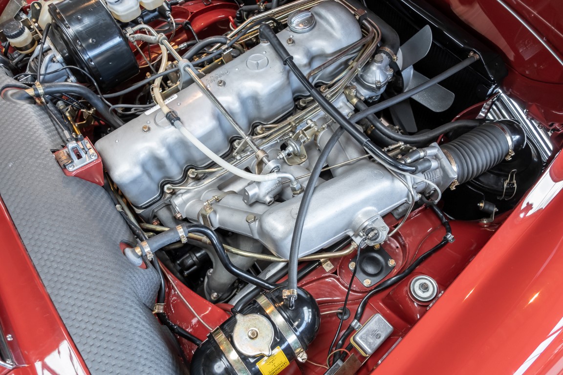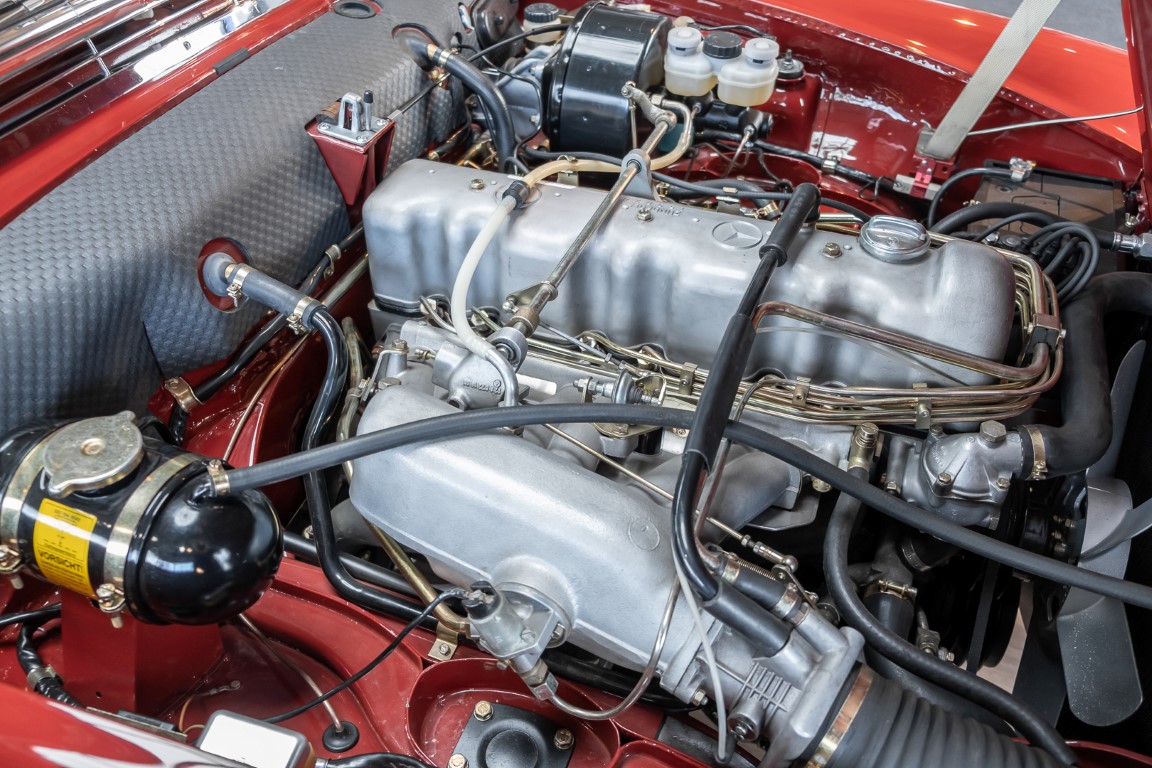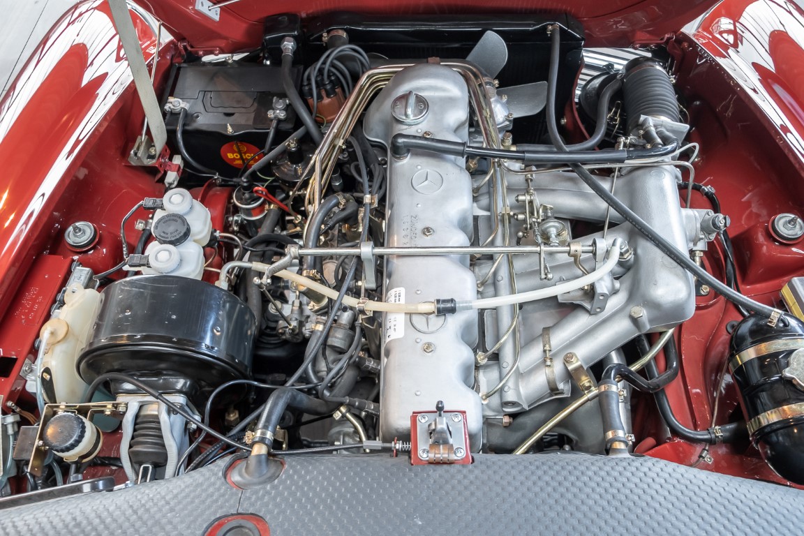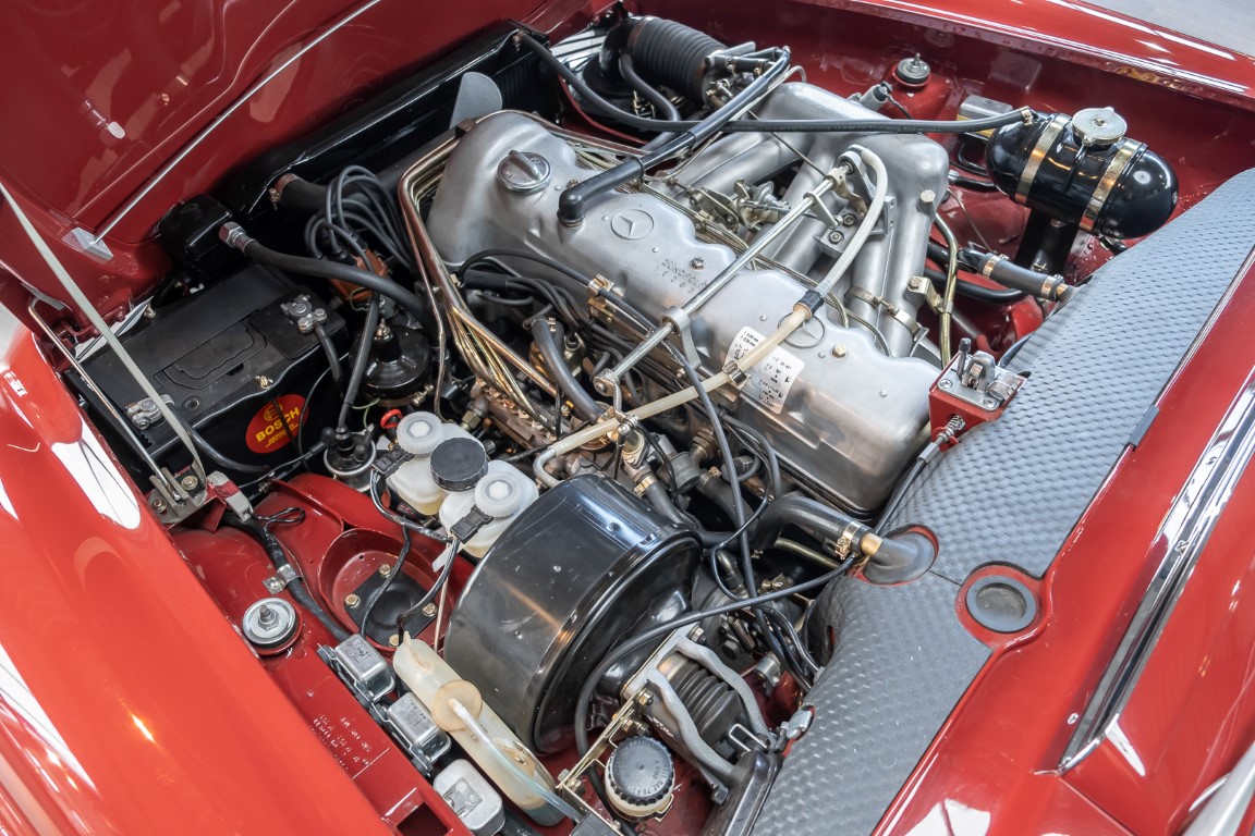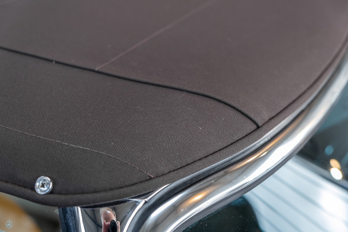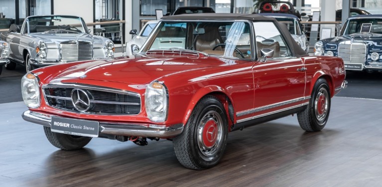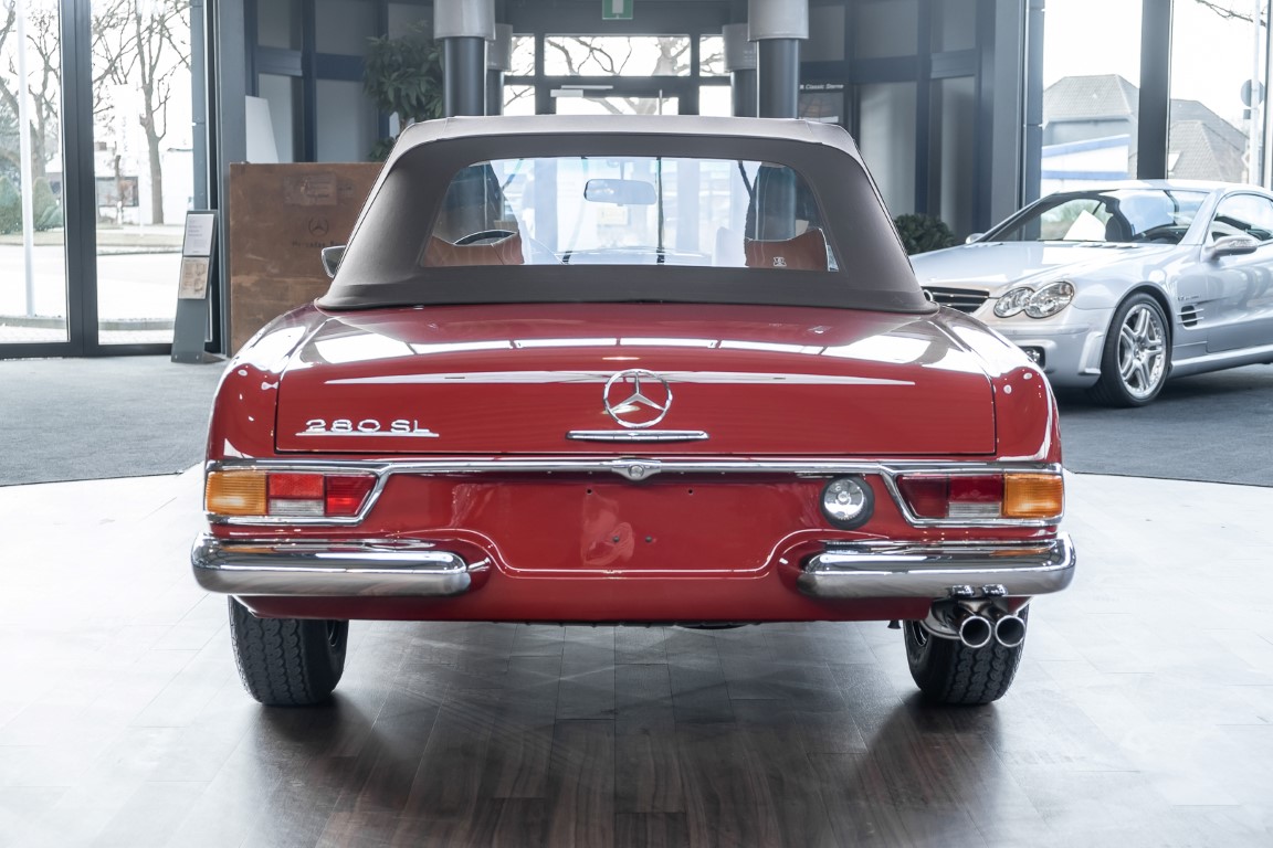Eine interessante Pagode mit nachvollziehbarer Historie, die sofort startklar auch für ausgedehnte Ausflüge gewesen wäre. Unsere Pläne für das Fahrzeug jedoch waren andere. Unter unserer Regie wurde der Wagen einer umfangrewichen Restaurierung unterzoigen. Die Aufgabe war eine Qualitätsrestaurierung auf höchstem handwerklichen Niveau zu erreichen. Sehen Sie selbst, das Zielwurd eexzellent erreicht. Die Karosserie wurde aufwändig überarbeitet und neu lackiert, Achsen und Getriebe sind revidiert worden, der Motor geprüft und nach bestandener Druckverlustprüfung fein eingestellt. Ein kraftvoller Lauf und ein sauberes Kompressionsbild unterstreichen das Ergebnis. Um das Interior aufzuwerten und der Gesamtoptik den letzten Schliff zu geben, entschieden wir uns das Interior mit feinem Leder in Cognac anstatt des originalen MB-Tex aufzuwerten. Ein Verdeck in dunkelbraun macht diese Pagode zu einem echten Hingucker. Alles in allem eine besondere Pagode, die durch einmaligen Charme zu überzeugen weiß und mit Handschaltung zu begeistern weiß. Steigen Sie ein und erfahren Sie diese Traum-Pagode mit allen Sinnen.