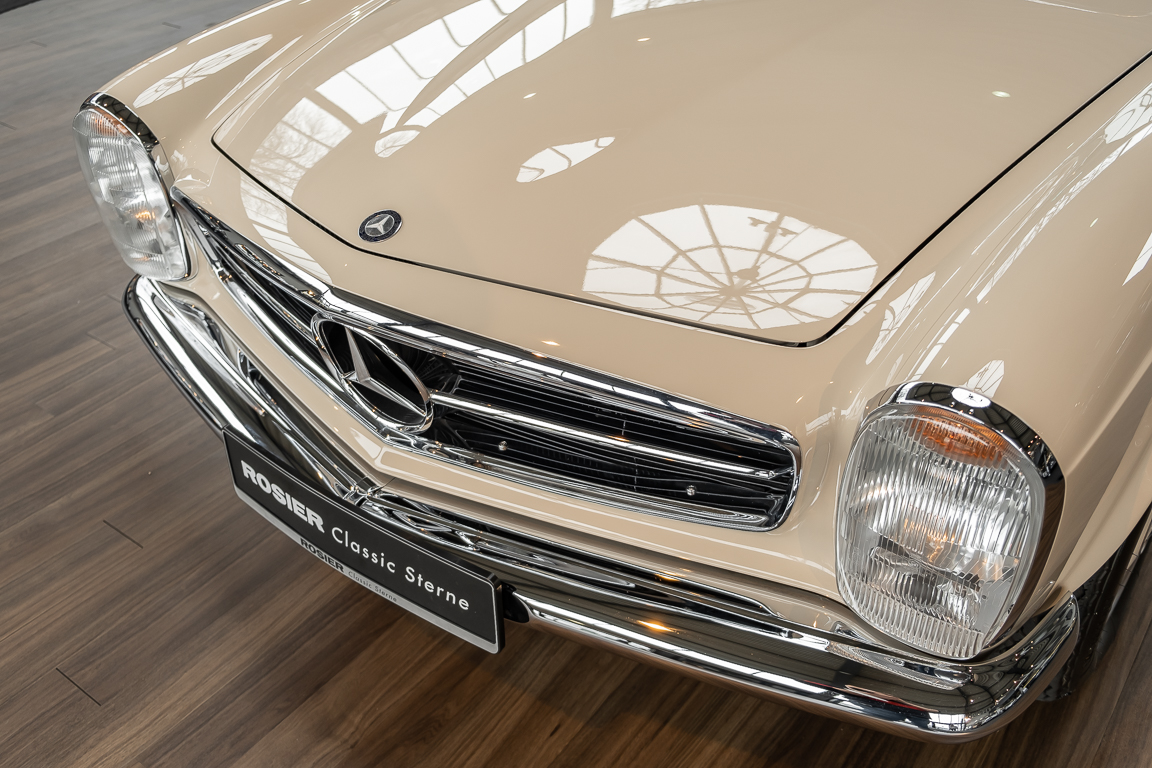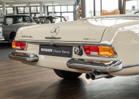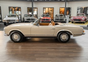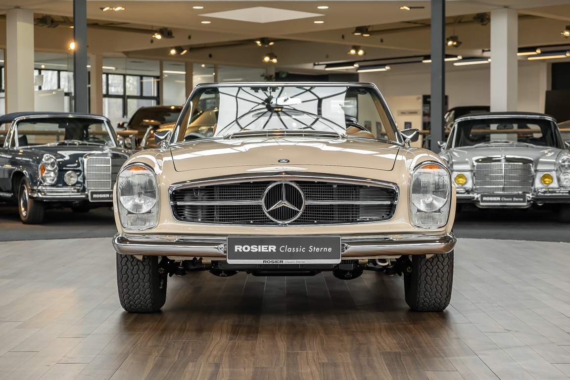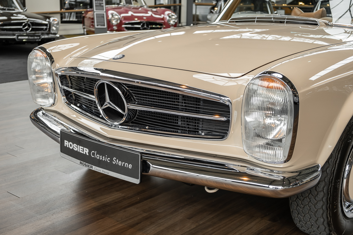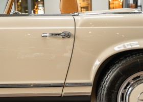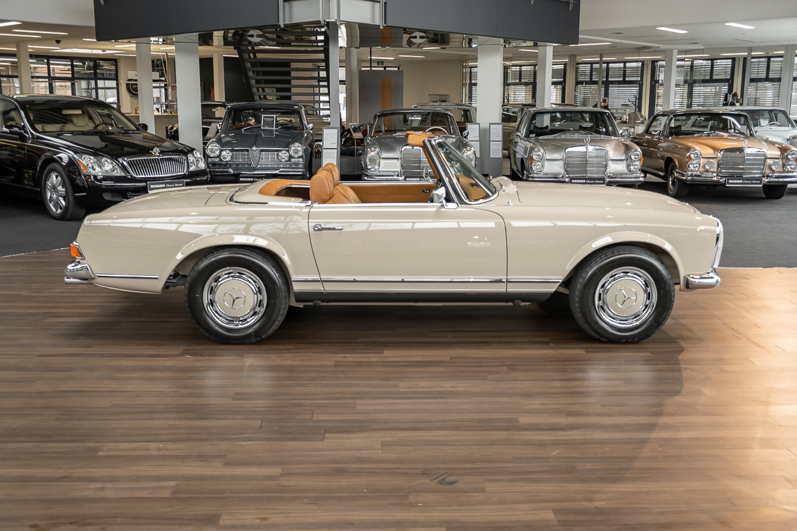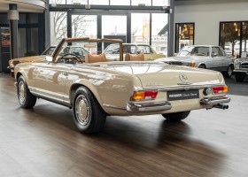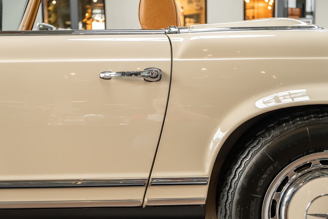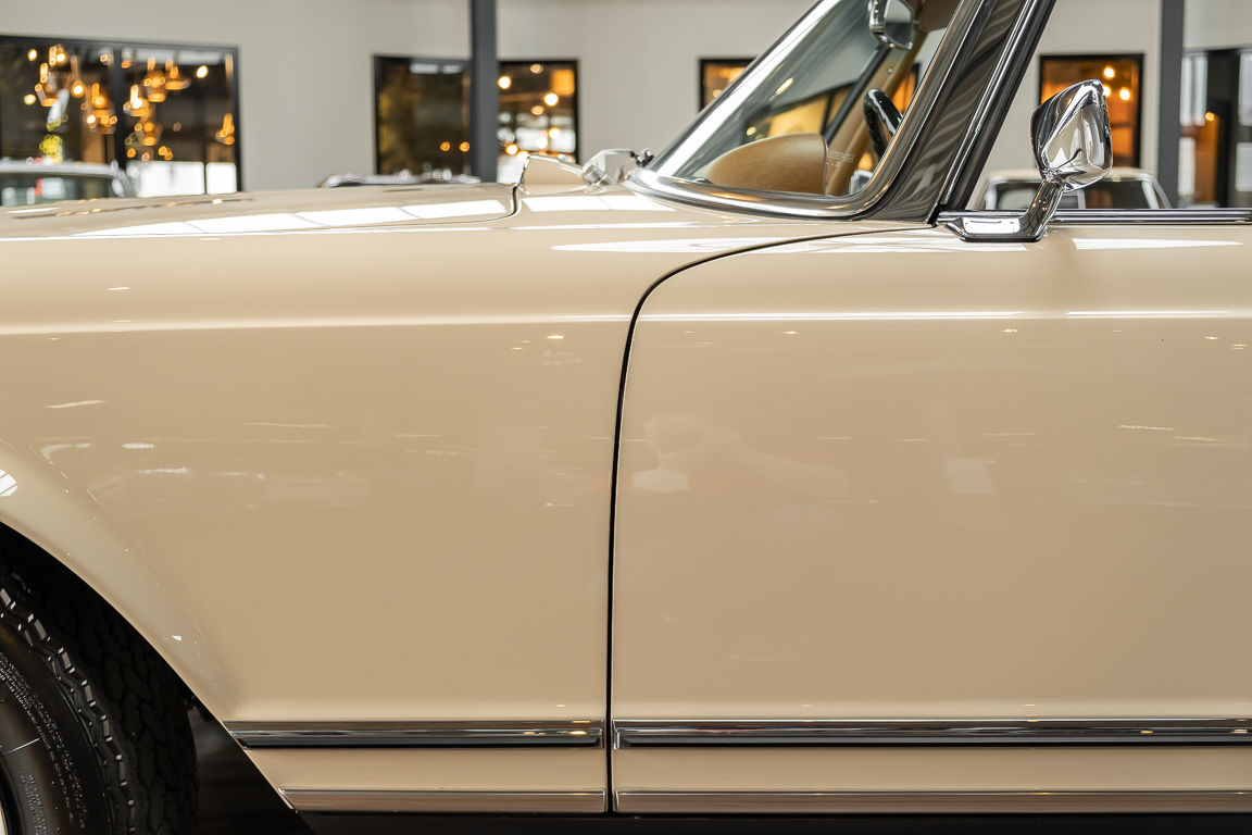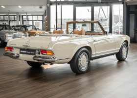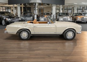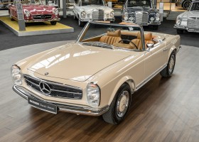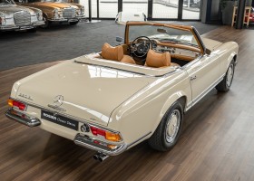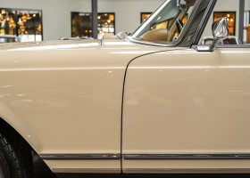 Eine Pagode auf höchstem Niveau im Hause BRABUS restauriert. Originalgetreu nach Datenkarte, mit viel Liebe zum Detail als 6 Sterne Restaurierung neu aufgebaut. Es wurden unzählig viele Neuteile verwendet. Für eine solch aufwändige Restaurierung werden gerne zwischen 5 und 6.000 Arbeitsstunden benötigt. Dafür ist am Ende eine Qualität von einmaliger Güte erreicht. Alle Komponenten wurden geprüft, bearbeitet oder ausgetauscht und in Bestzustand versetzt. Die Karosserie wurde nach modernstem Verfahren sorgfältig vom Lack befreit und ein neuer Lackauftrag vorgenommen.