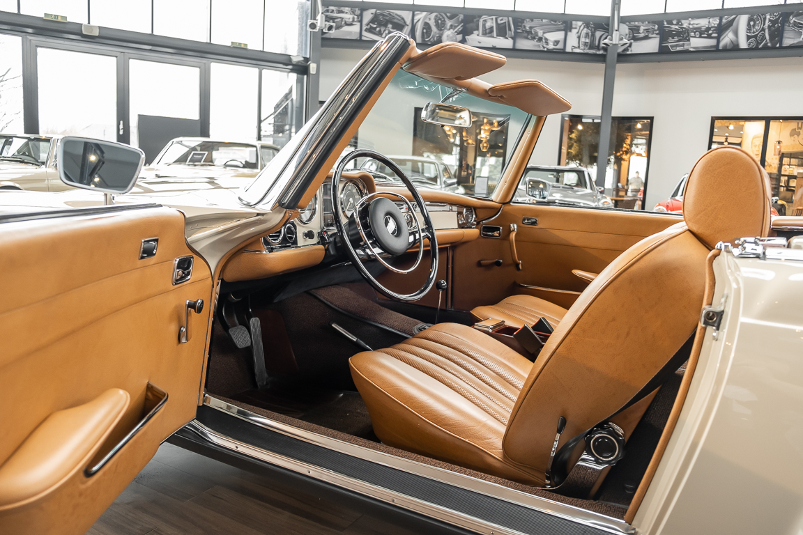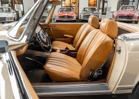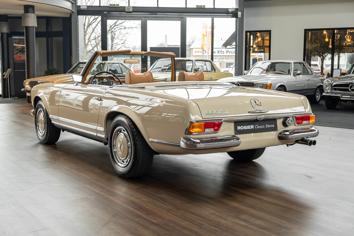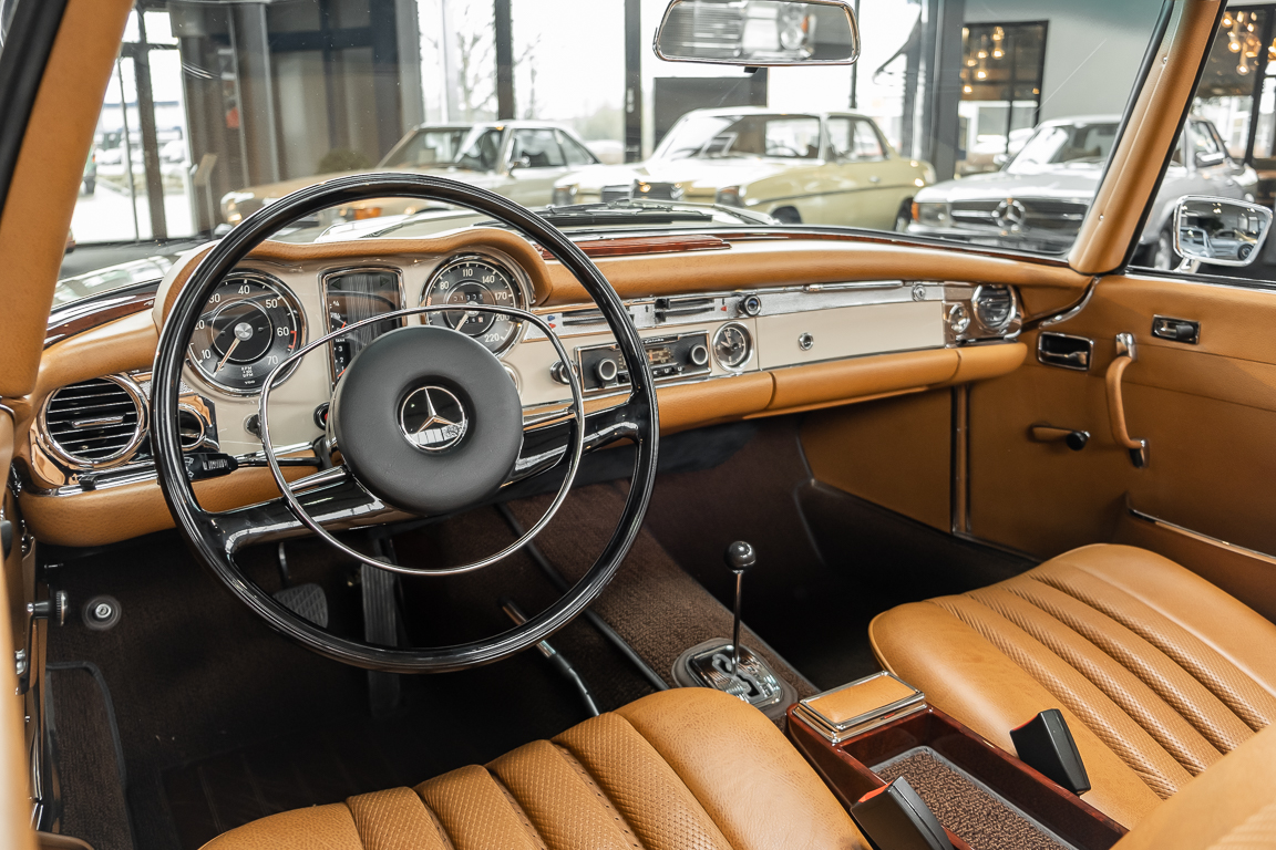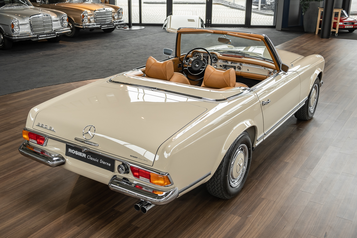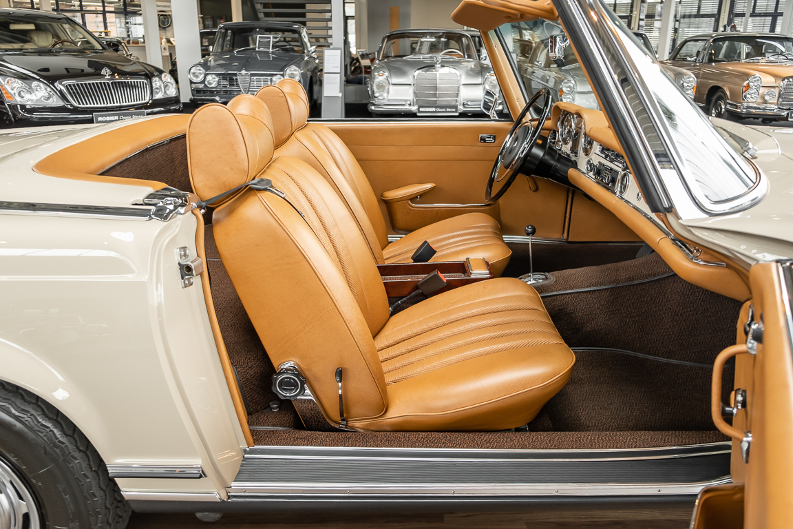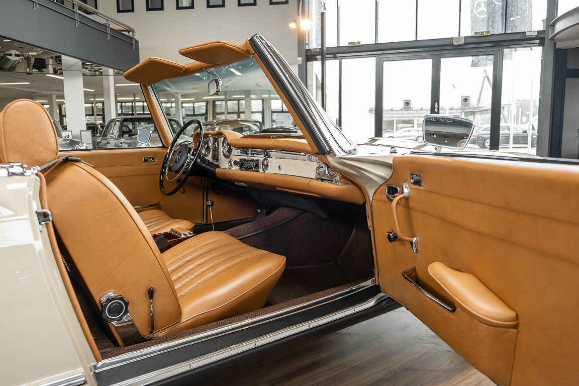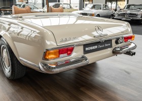 Eine Pagode auf höchstem Niveau im Hause BRABUS restauriert. Originalgetreu nach Datenkarte, mit viel Liebe zum Detail als 6 Sterne Restaurierung neu aufgebaut. Es wurden unzählig viele Neuteile verwendet. Für eine solch aufwändige Restaurierung werden gerne zwischen 5 und 6.000 Arbeitsstunden benötigt. Dafür ist am Ende eine Qualität von einmaliger Güte erreicht. Alle Komponenten wurden geprüft, bearbeitet oder ausgetauscht und in Bestzustand versetzt. Die Karosserie wurde nach modernstem Verfahren sorgfältig vom Lack befreit und ein neuer Lackauftrag vorgenommen.