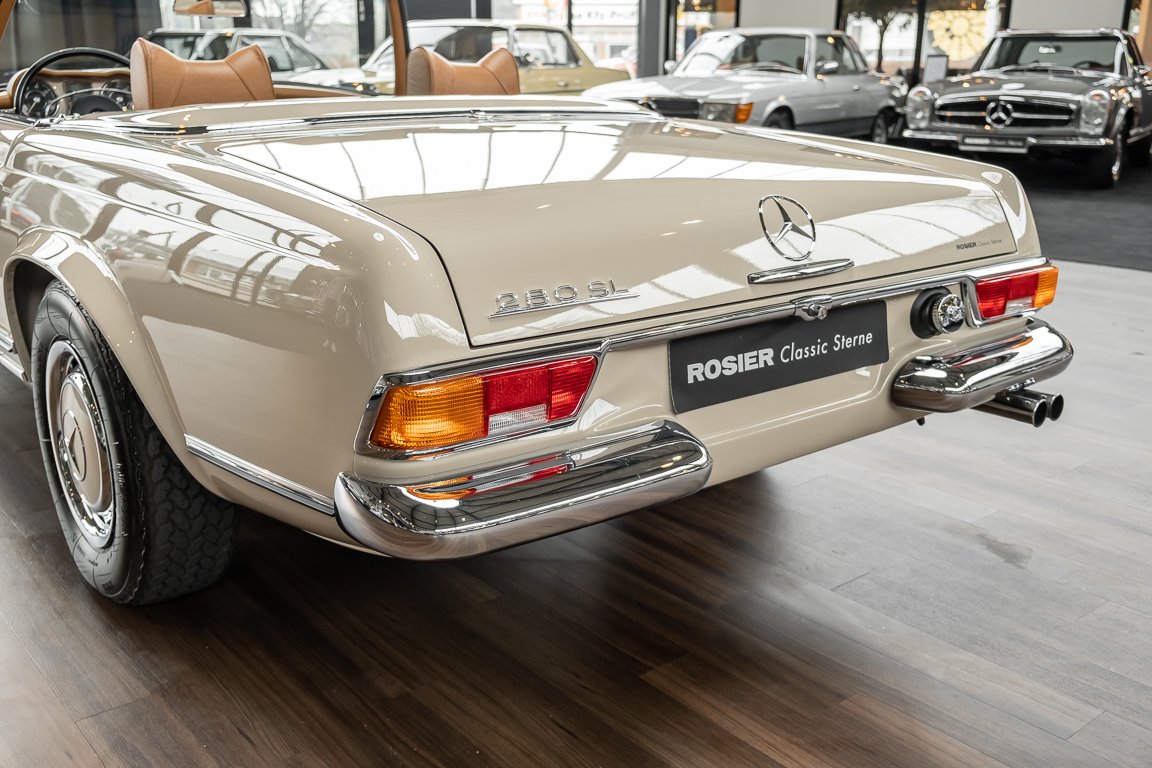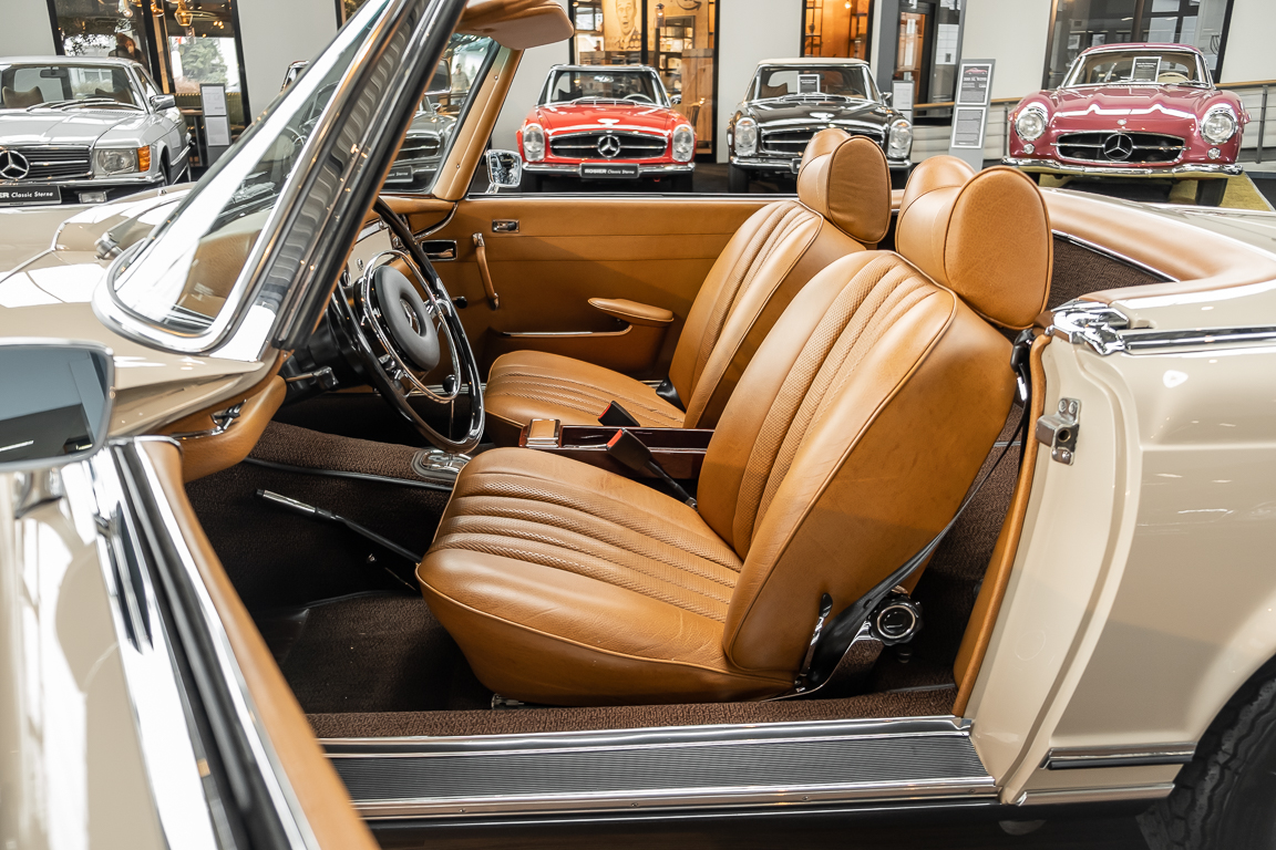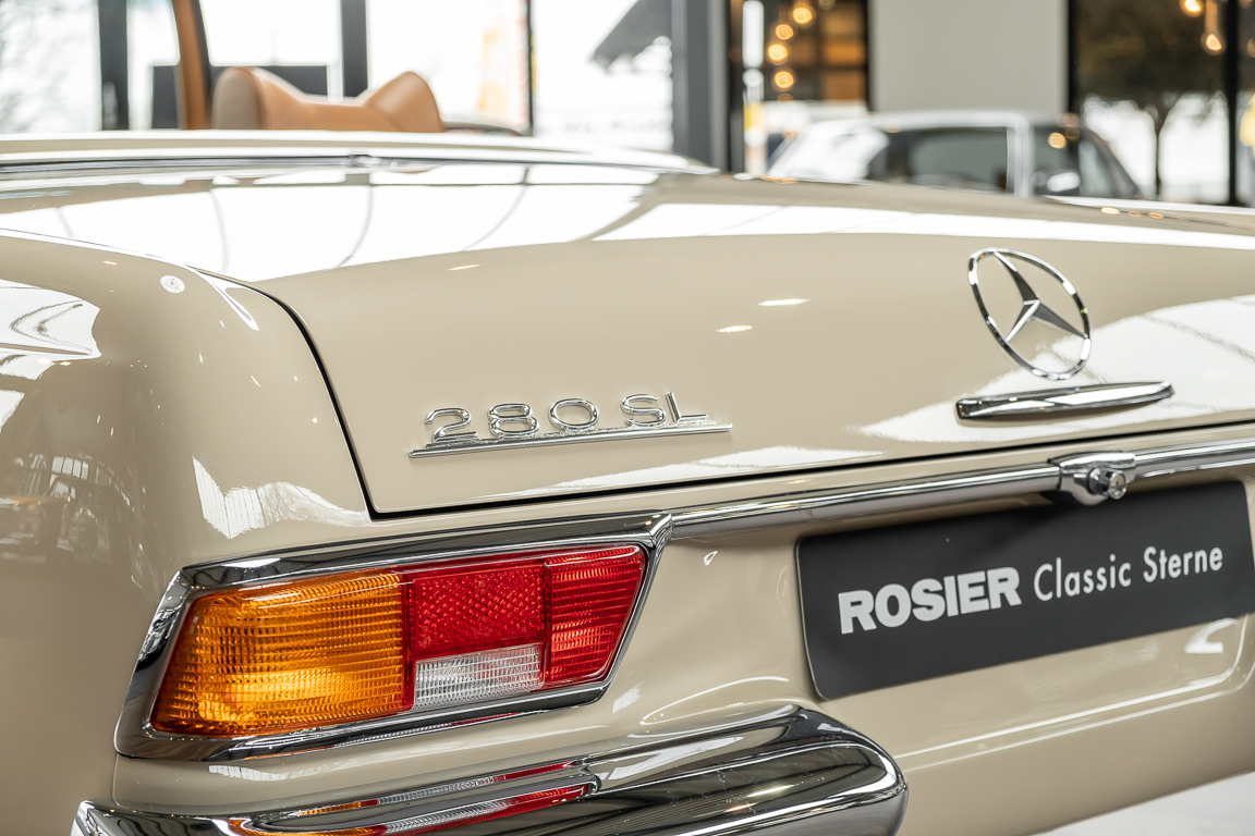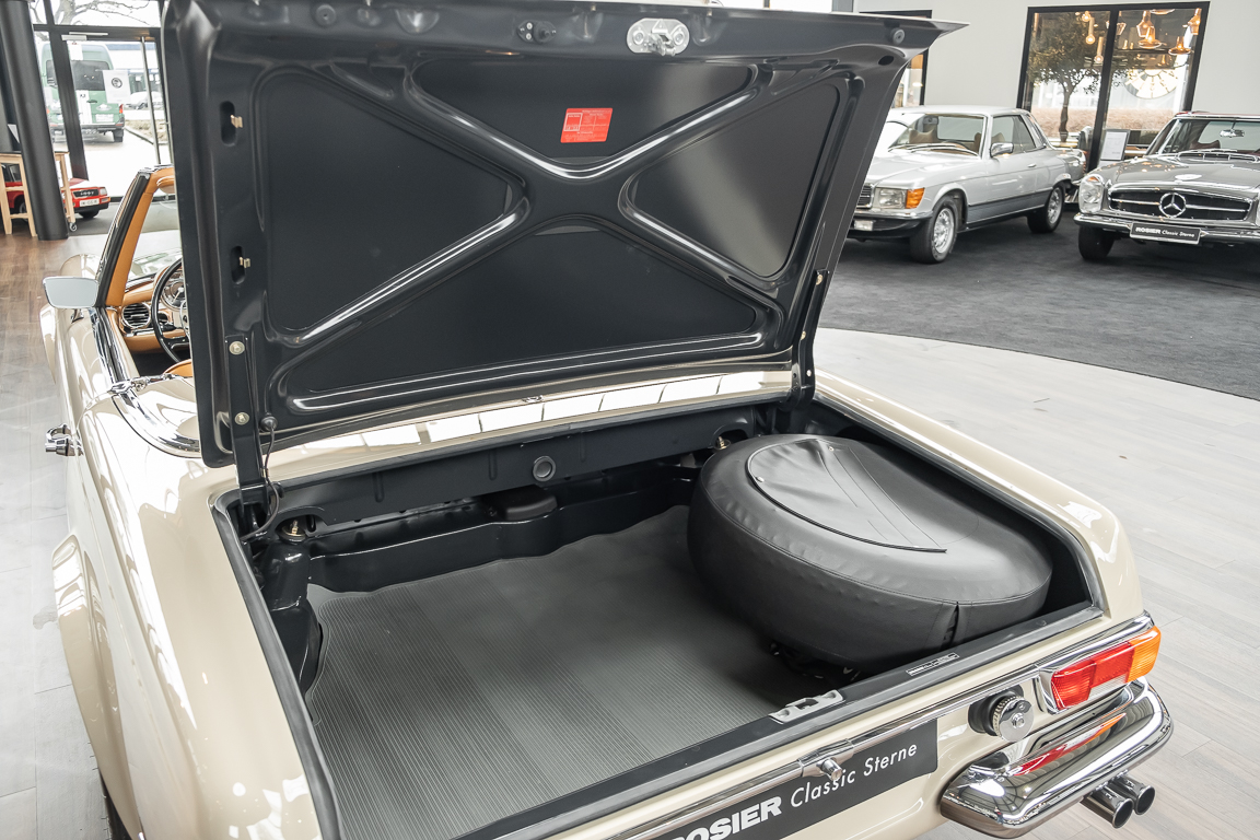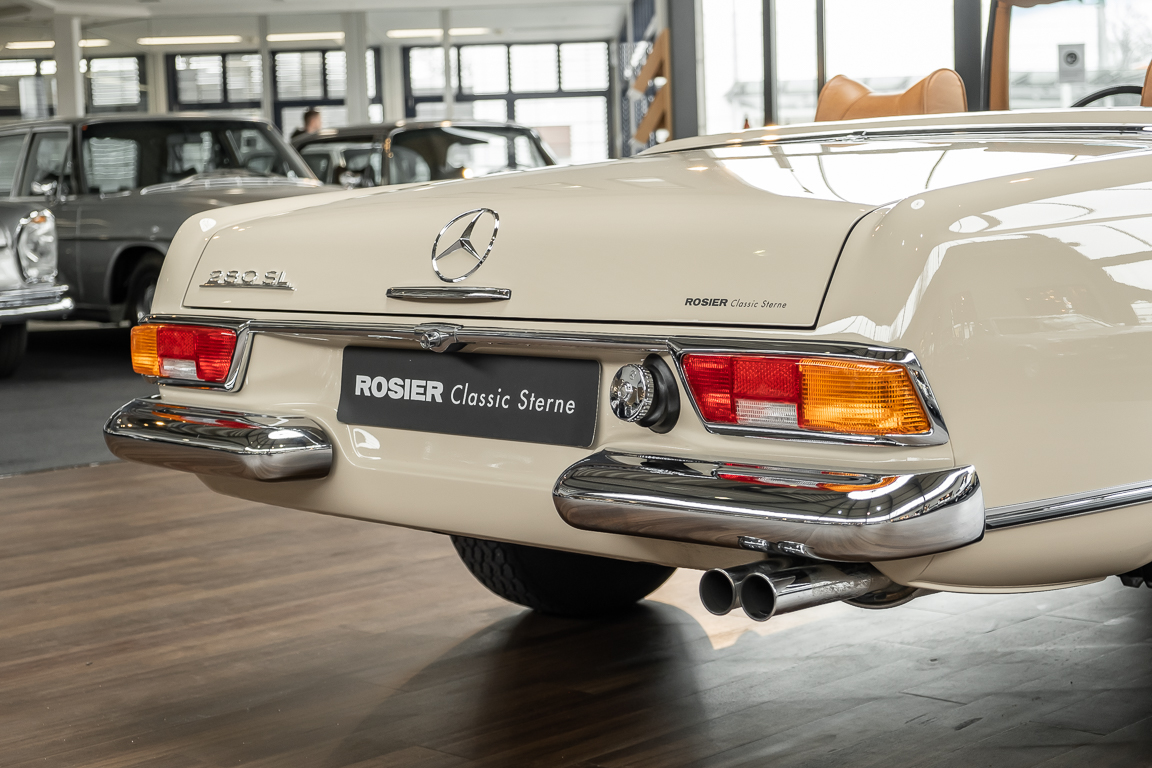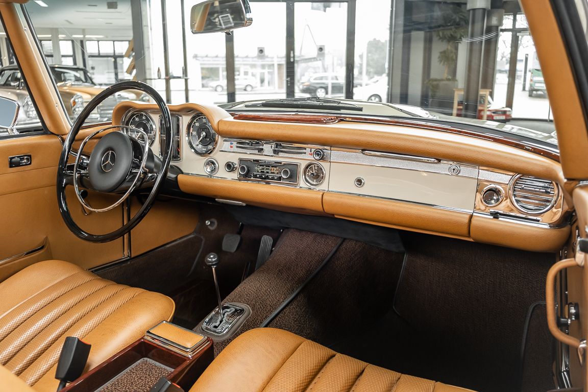Eine Pagode auf höchstem Niveau im Hause BRABUS restauriert. Originalgetreu nach Datenkarte, mit viel Liebe zum Detail als 6 Sterne Restaurierung neu aufgebaut. Es wurden unzählig viele Neuteile verwendet. Für eine solch aufwändige Restaurierung werden gerne zwischen 5 und 6.000 Arbeitsstunden benötigt. Dafür ist am Ende eine Qualität von einmaliger Güte erreicht. Alle Komponenten wurden geprüft, bearbeitet oder ausgetauscht und in Bestzustand versetzt. Die Karosserie wurde nach modernstem Verfahren sorgfältig vom Lack befreit und ein neuer Lackauftrag vorgenommen.