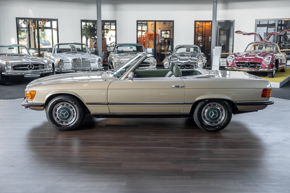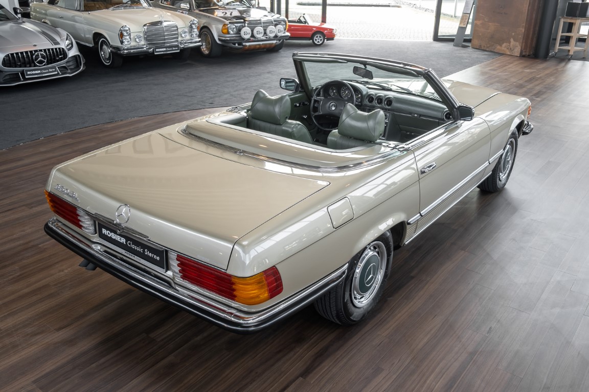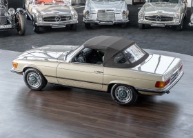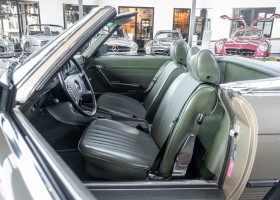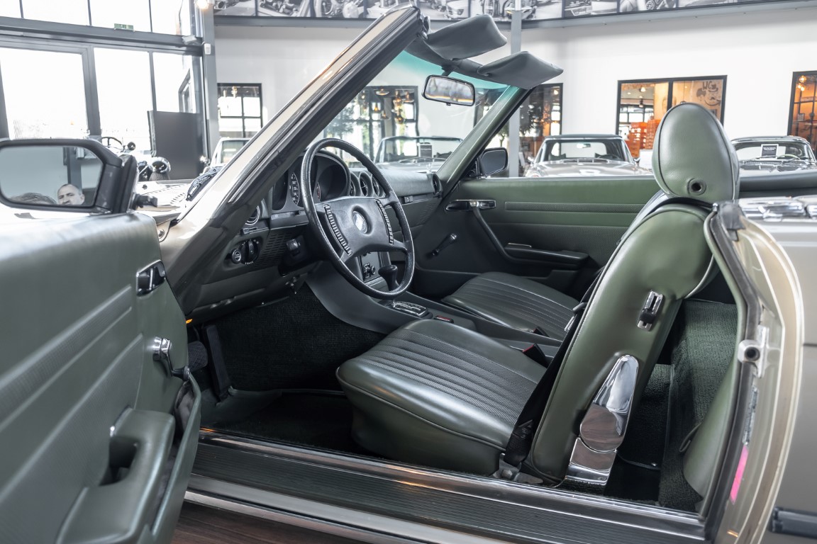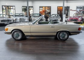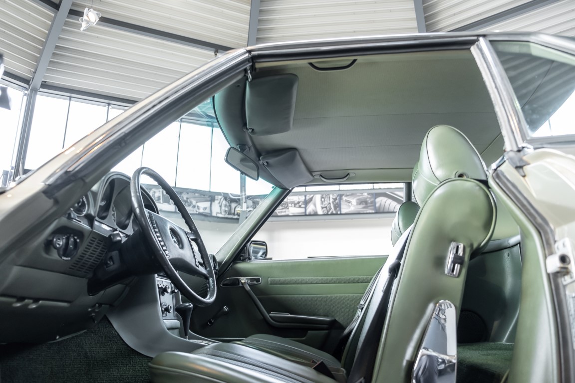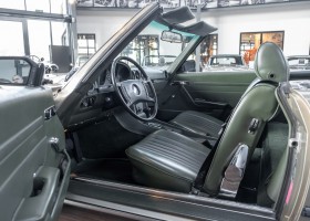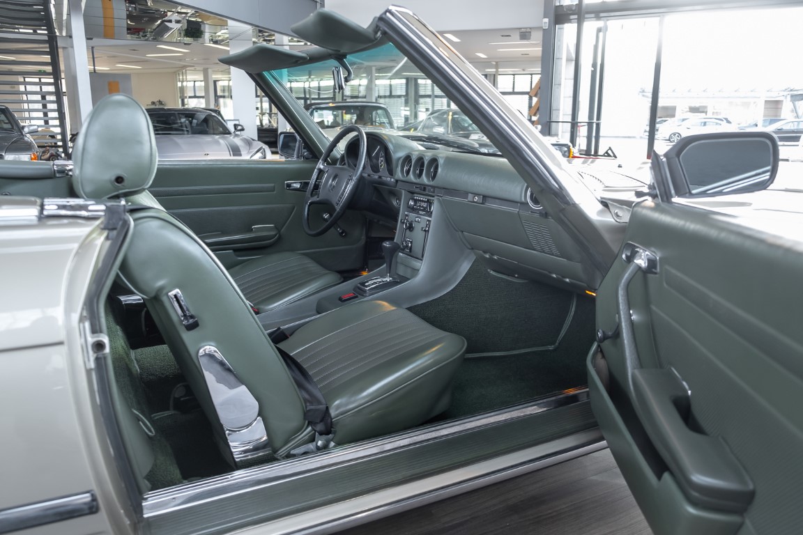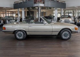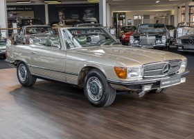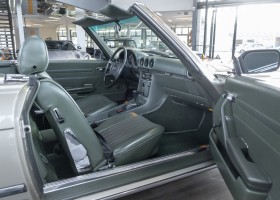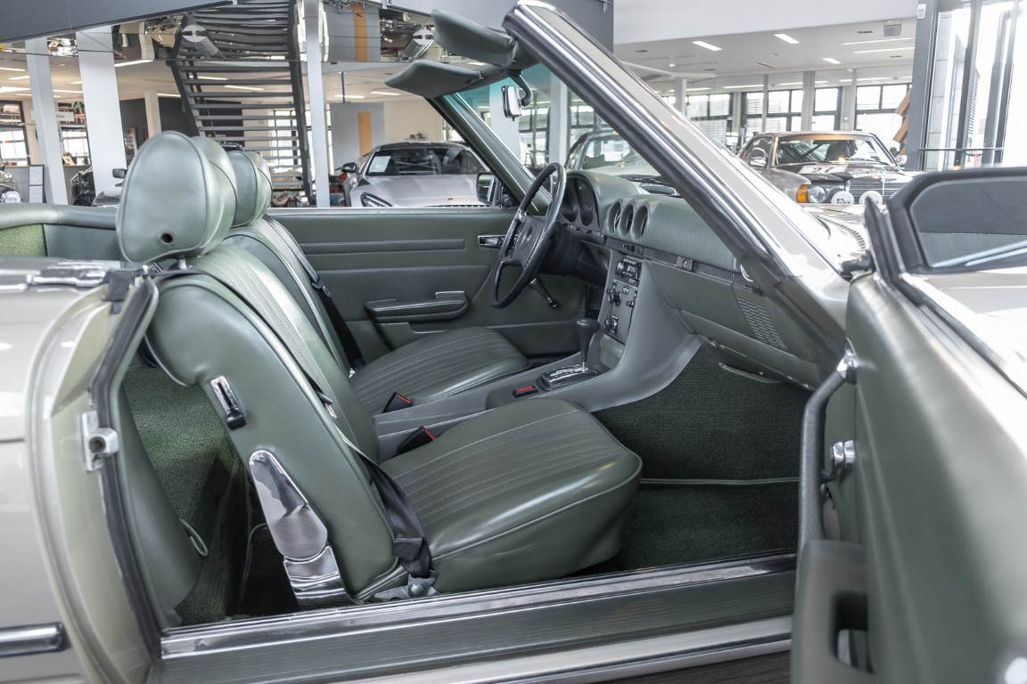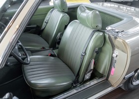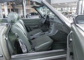 Die Serienproduktion des Mercedes-Benz 350SL Roadsters begann im April 1971 im Werk Sindelfingen. Der hier angebotene Roadster wurde am 25. Oktober 1971 fertiggestellt und in die USA geliefert. Es handelt sich somit um ein ganz frühes Modell und ist für Sammler höchst interessant. Er wurde im Januar 1972 auf den Erstbesitzer zugelassen und verblieb all die Jahre in den USA. Aus der ländlichen ca. 7.000 Einwohner-Gemeinde Sutherlin in Oregon/USA, nur etwa 1 Stunde entfernt von der Winchester Bay am Nord Pacific wurde das Fahrzeug nach Deutschland eingeführt. Der Zustand des Wagens ist sehr original, die unverwüstliche MB-Tex Ausstattung in Olivgrün (166) befindet sich bis heute in einem sehr guten Zustand, die Lackierung wurde offensichtlich vor Jahren erneuert. Der Gesamtzustand des Wagens ist höchst erfreulich, der Unterboden wurde Trockeneisgestrahlt und befindet sich in sauberem und ordentlichen Zustand. Der Motor läuft kraftvoll und weich, das Getriebe wurde erst kürzlich von unseren Spezialisten überholt und schaltet wie man es von einem Mercedes erwartet. Ein rundum toller 107er, der mit seinem starken V8 Motor und einer besonders stilsicheren Farbkombination zu überzeugen weiß. Steigen Sie ein und erfahren Sie es selbst.