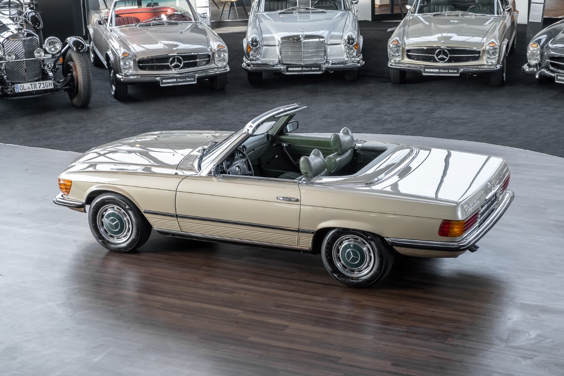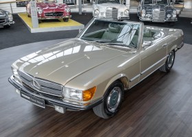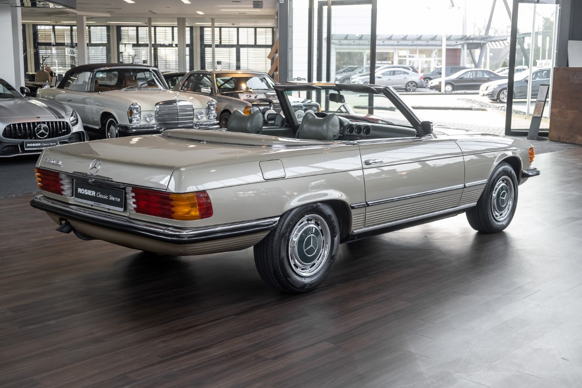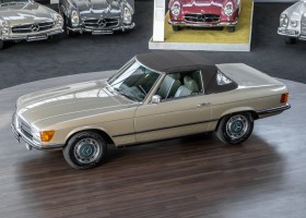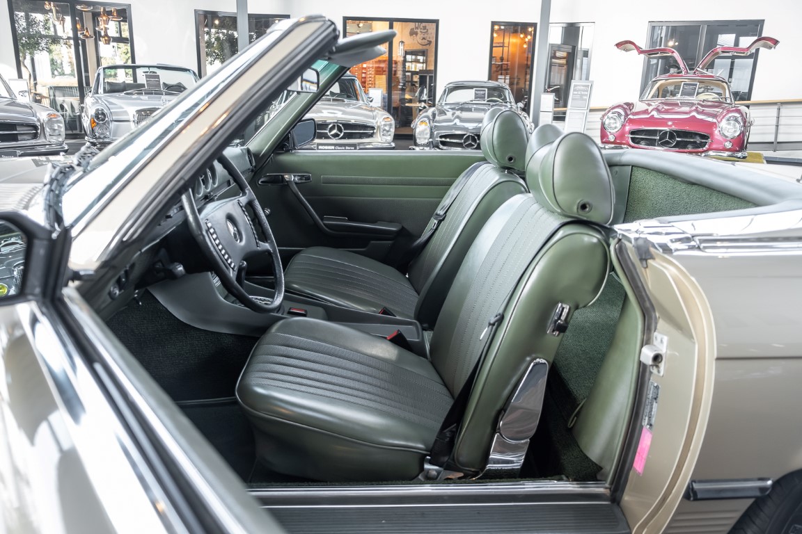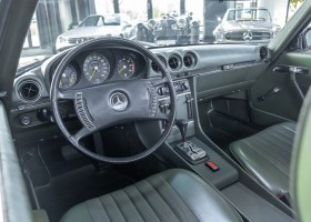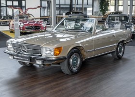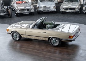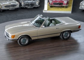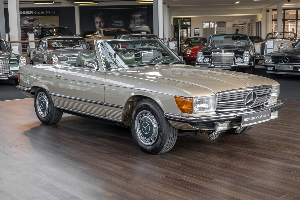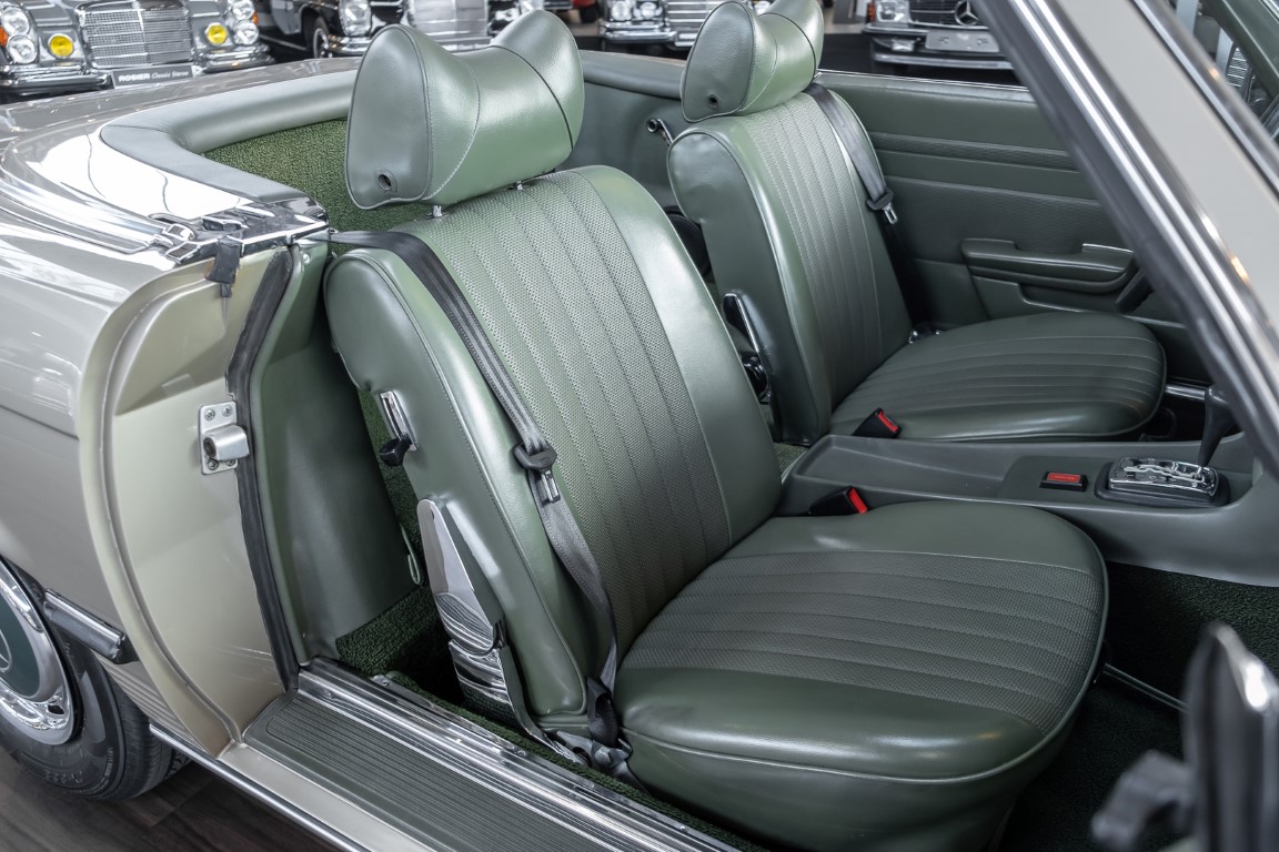 Die Serienproduktion des Mercedes-Benz 350SL Roadsters begann im April 1971 im Werk Sindelfingen. Der hier angebotene Roadster wurde am 25. Oktober 1971 fertiggestellt und in die USA geliefert. Es handelt sich somit um ein ganz frühes Modell und ist für Sammler höchst interessant. Er wurde im Januar 1972 auf den Erstbesitzer zugelassen und verblieb all die Jahre in den USA. Aus der ländlichen ca. 7.000 Einwohner-Gemeinde Sutherlin in Oregon/USA, nur etwa 1 Stunde entfernt von der Winchester Bay am Nord Pacific wurde das Fahrzeug nach Deutschland eingeführt. Der Zustand des Wagens ist sehr original, die unverwüstliche MB-Tex Ausstattung in Olivgrün (166) befindet sich bis heute in einem sehr guten Zustand, die Lackierung wurde offensichtlich vor Jahren erneuert. Der Gesamtzustand des Wagens ist höchst erfreulich, der Unterboden wurde Trockeneisgestrahlt und befindet sich in sauberem und ordentlichen Zustand. Der Motor läuft kraftvoll und weich, das Getriebe wurde erst kürzlich von unseren Spezialisten überholt und schaltet wie man es von einem Mercedes erwartet. Ein rundum toller 107er, der mit seinem starken V8 Motor und einer besonders stilsicheren Farbkombination zu überzeugen weiß. Steigen Sie ein und erfahren Sie es selbst.