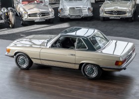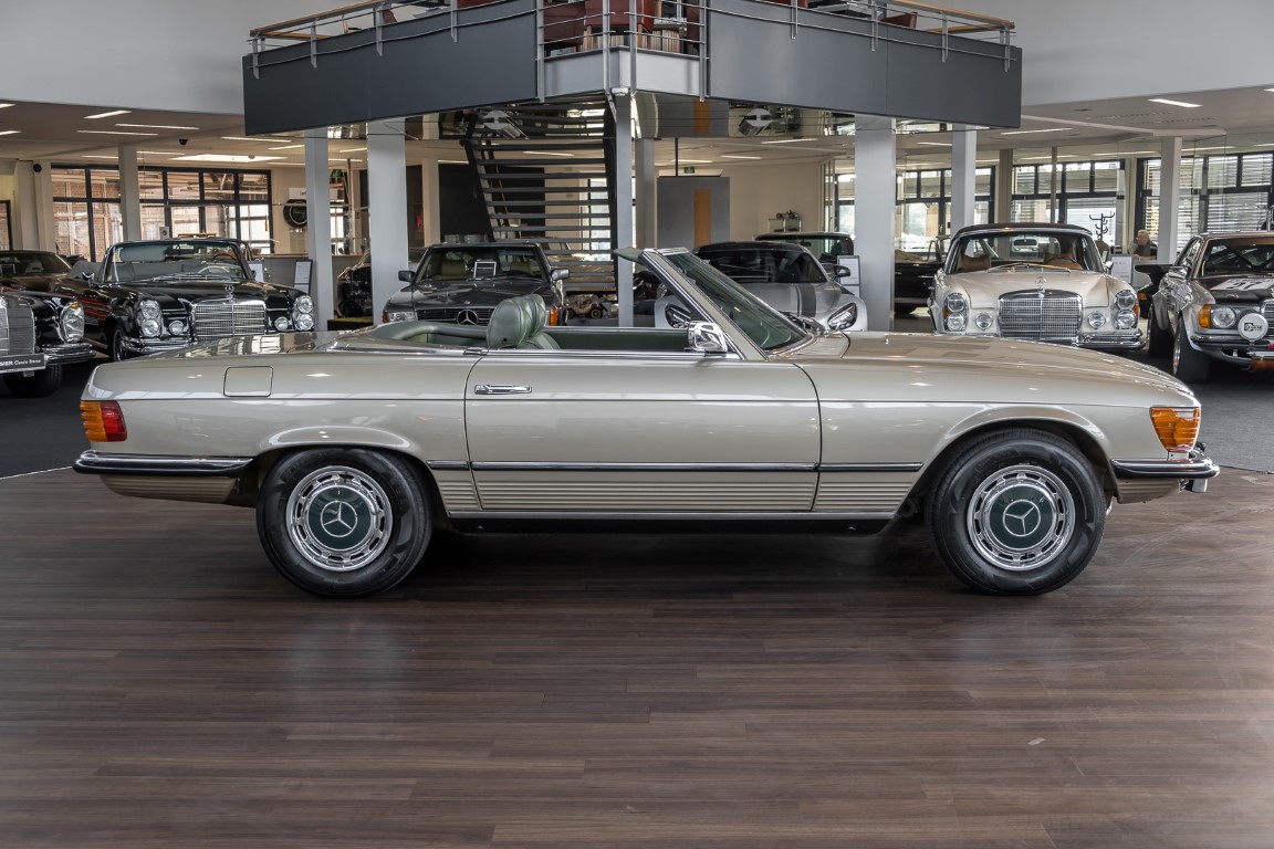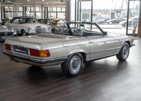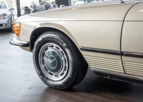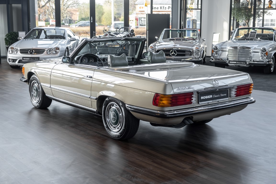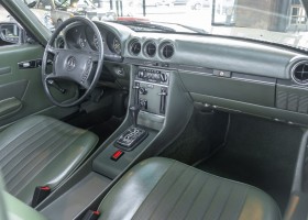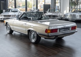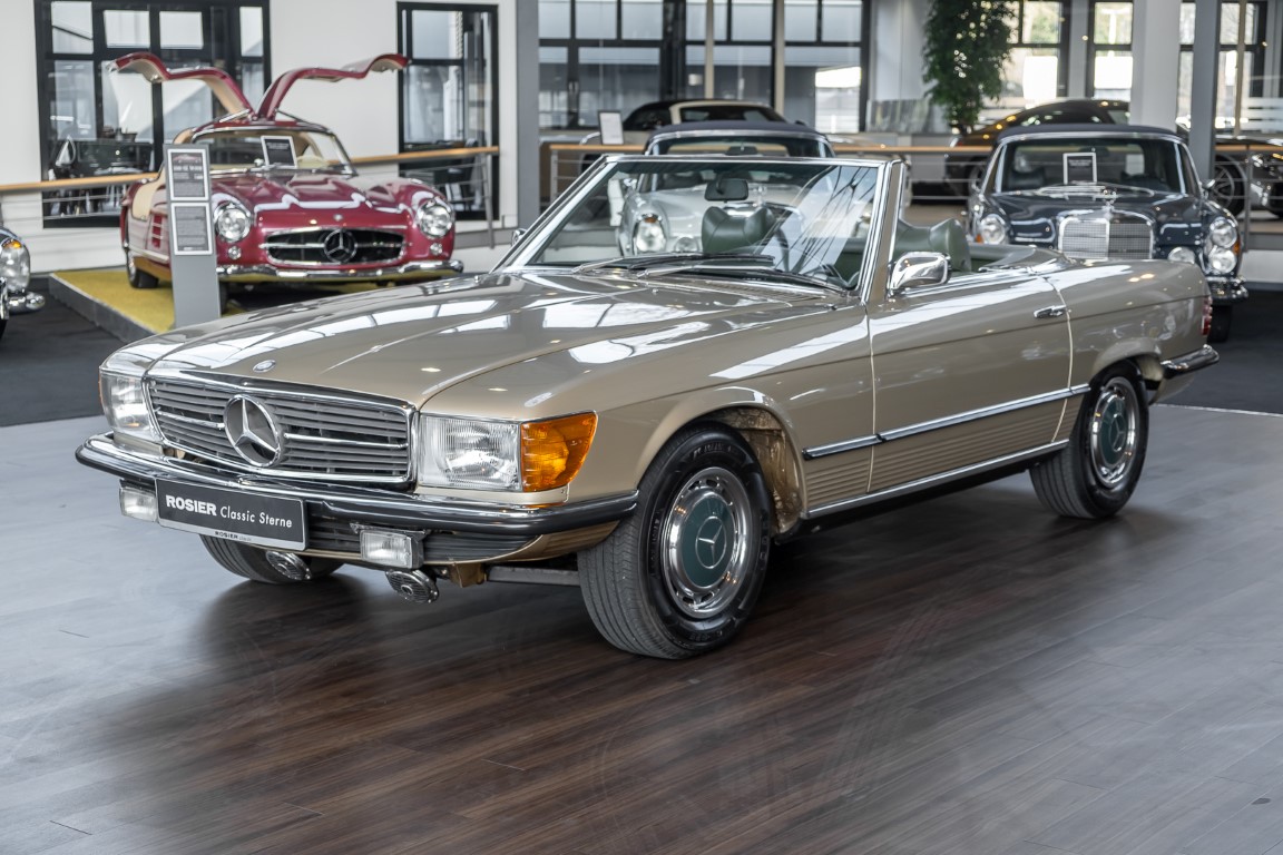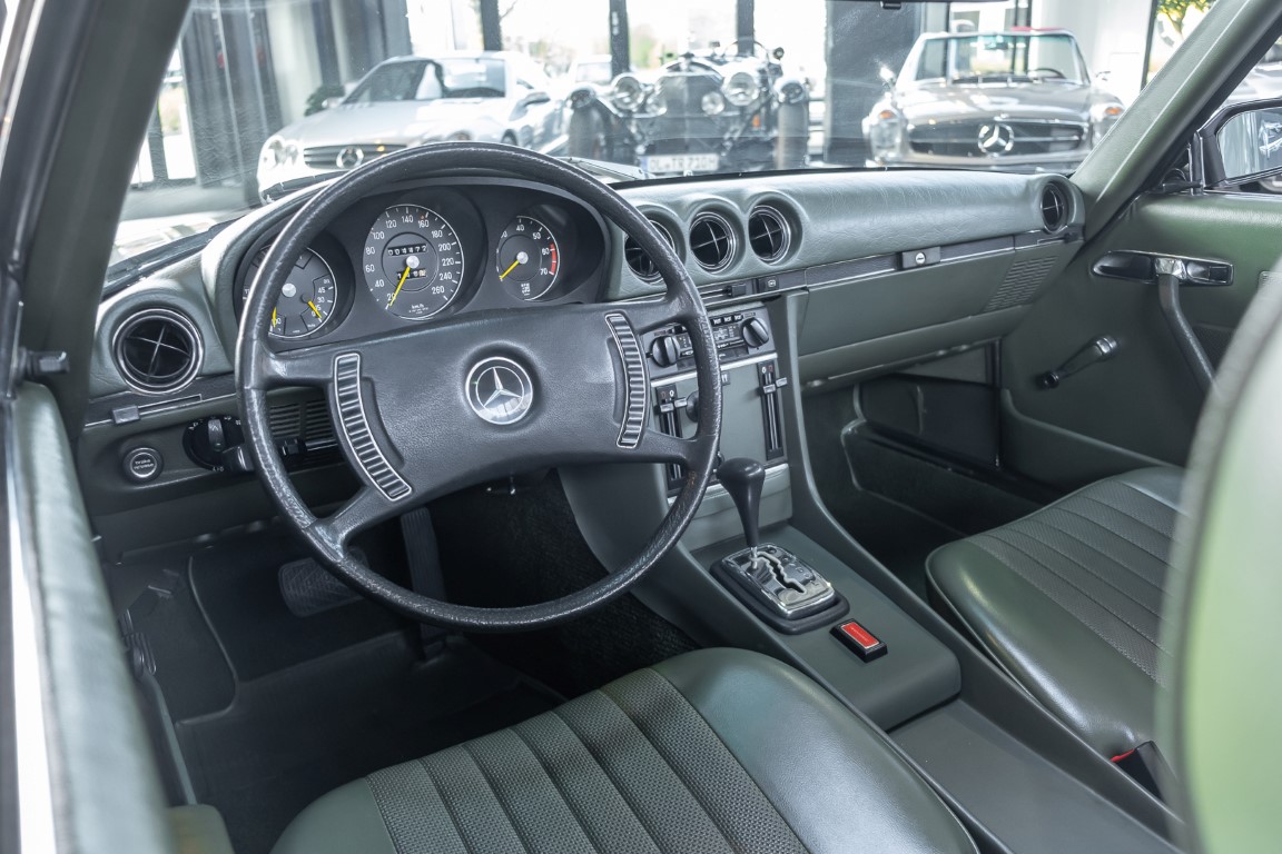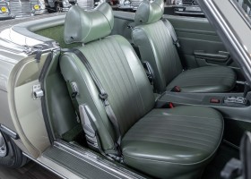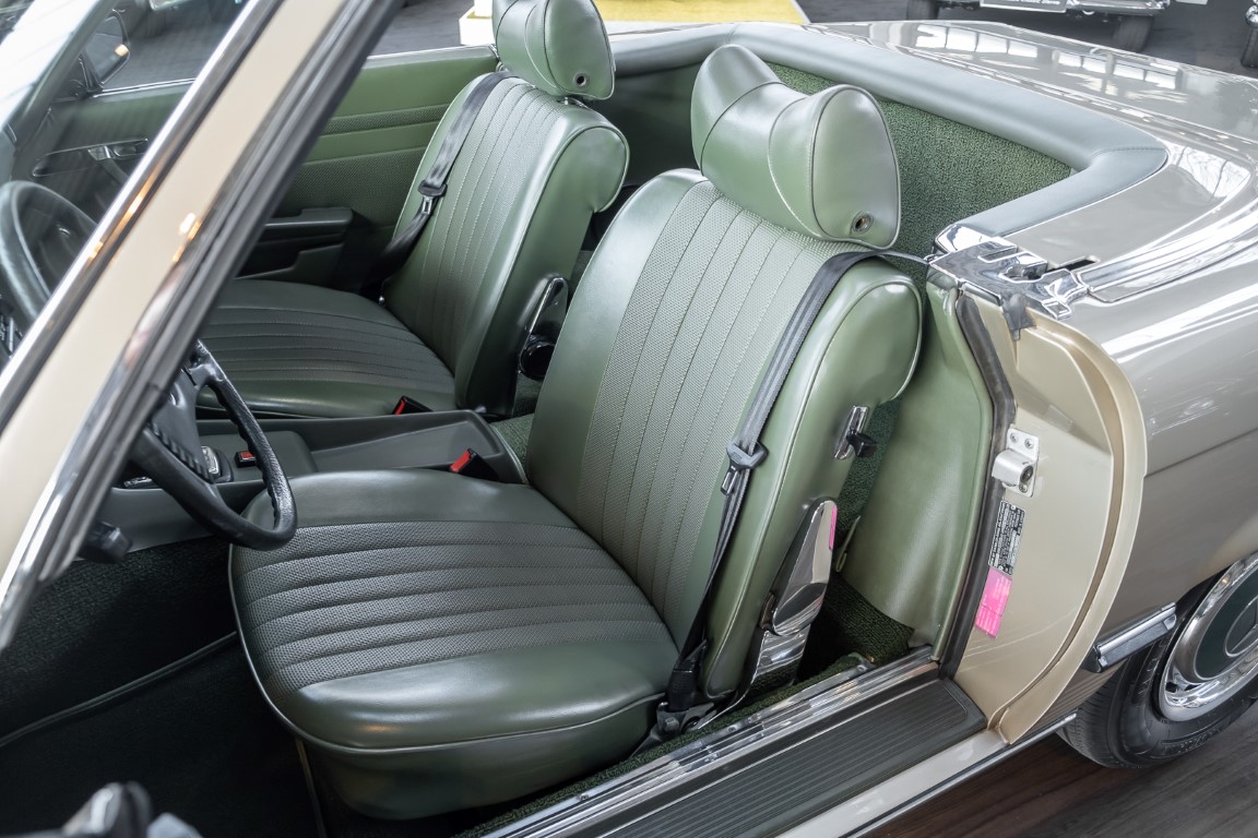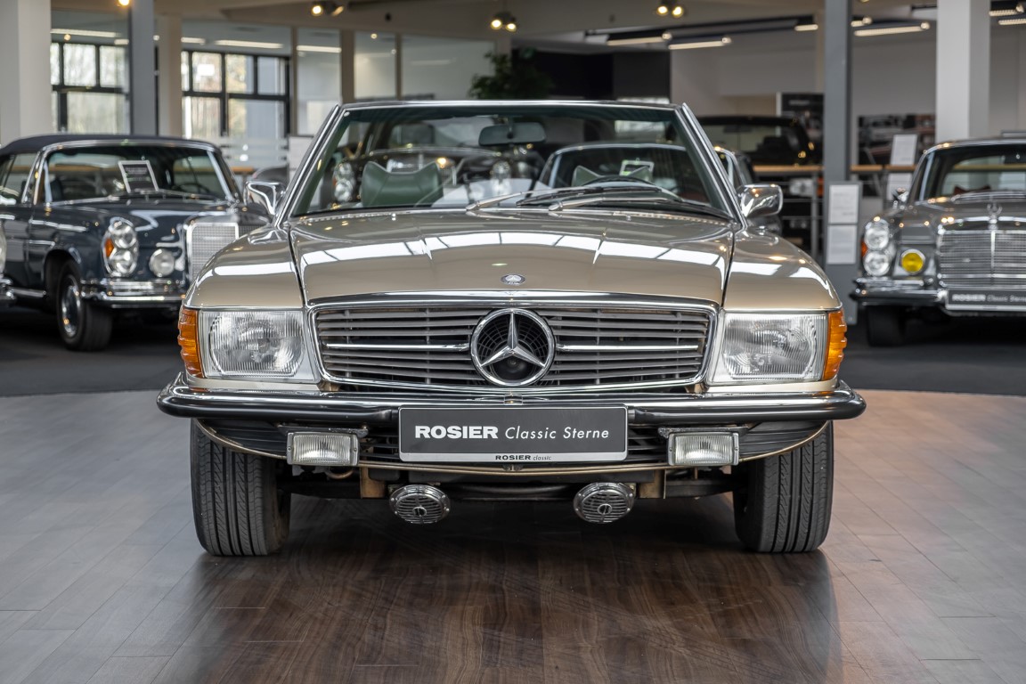 Die Serienproduktion des Mercedes-Benz 350SL Roadsters begann im April 1971 im Werk Sindelfingen. Der hier angebotene Roadster wurde am 25. Oktober 1971 fertiggestellt und in die USA geliefert. Es handelt sich somit um ein ganz frühes Modell und ist für Sammler höchst interessant. Er wurde im Januar 1972 auf den Erstbesitzer zugelassen und verblieb all die Jahre in den USA. Aus der ländlichen ca. 7.000 Einwohner-Gemeinde Sutherlin in Oregon/USA, nur etwa 1 Stunde entfernt von der Winchester Bay am Nord Pacific wurde das Fahrzeug nach Deutschland eingeführt. Der Zustand des Wagens ist sehr original, die unverwüstliche MB-Tex Ausstattung in Olivgrün (166) befindet sich bis heute in einem sehr guten Zustand, die Lackierung wurde offensichtlich vor Jahren erneuert. Der Gesamtzustand des Wagens ist höchst erfreulich, der Unterboden wurde Trockeneisgestrahlt und befindet sich in sauberem und ordentlichen Zustand. Der Motor läuft kraftvoll und weich, das Getriebe wurde erst kürzlich von unseren Spezialisten überholt und schaltet wie man es von einem Mercedes erwartet. Ein rundum toller 107er, der mit seinem starken V8 Motor und einer besonders stilsicheren Farbkombination zu überzeugen weiß. Steigen Sie ein und erfahren Sie es selbst.