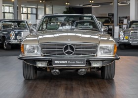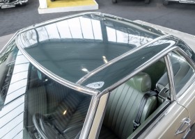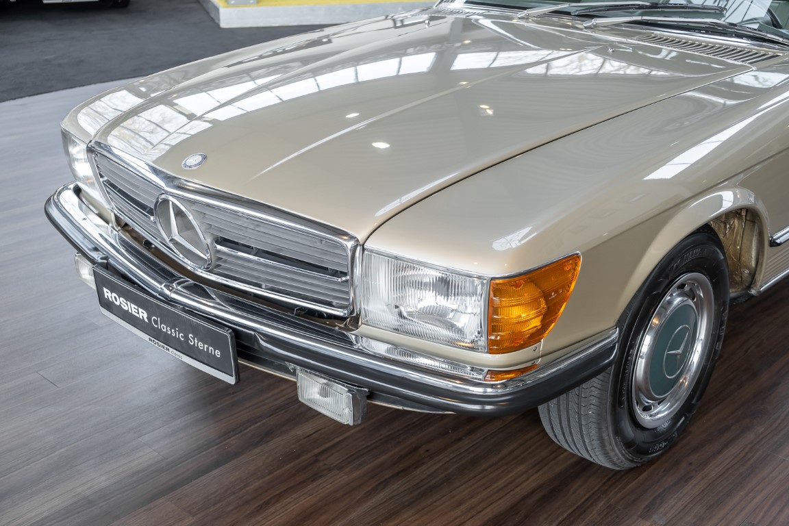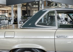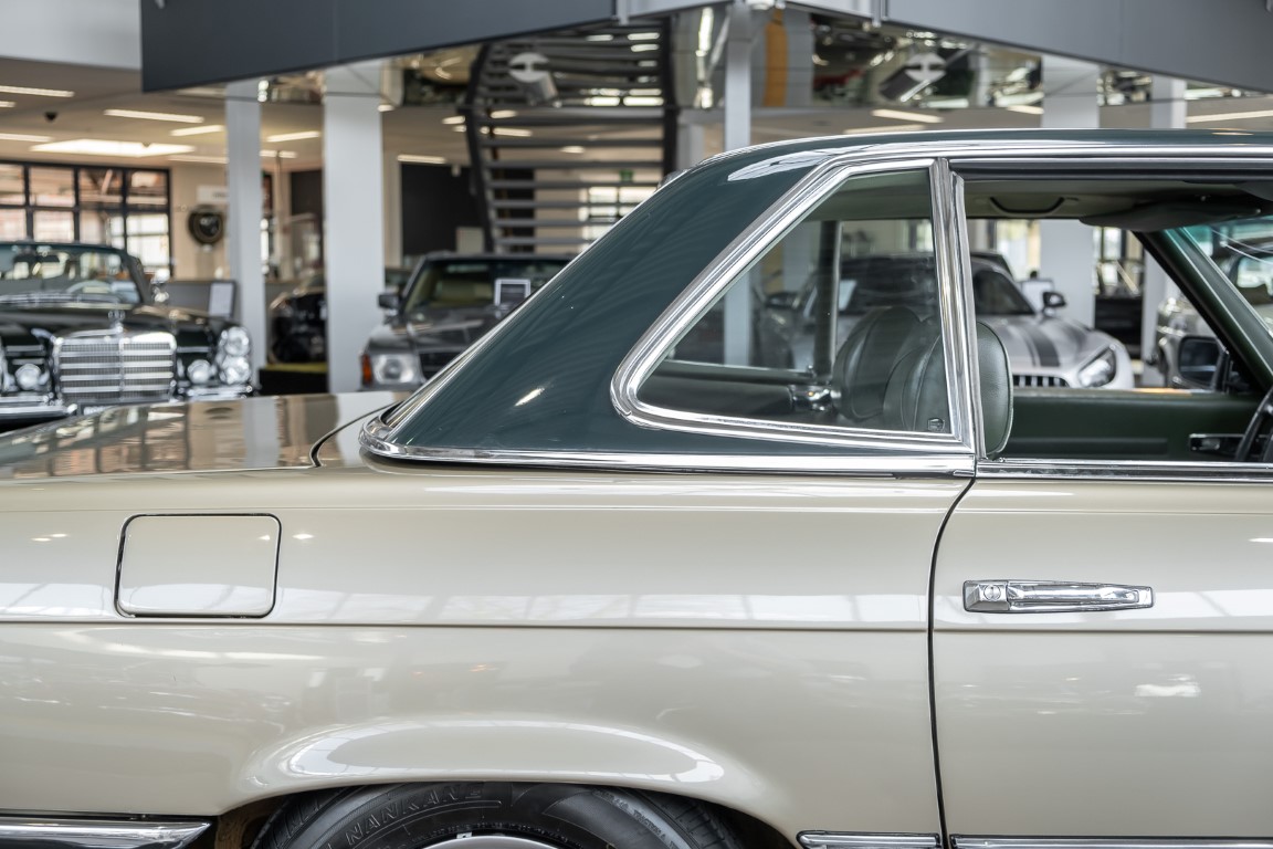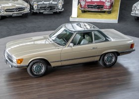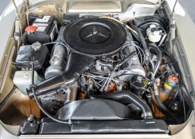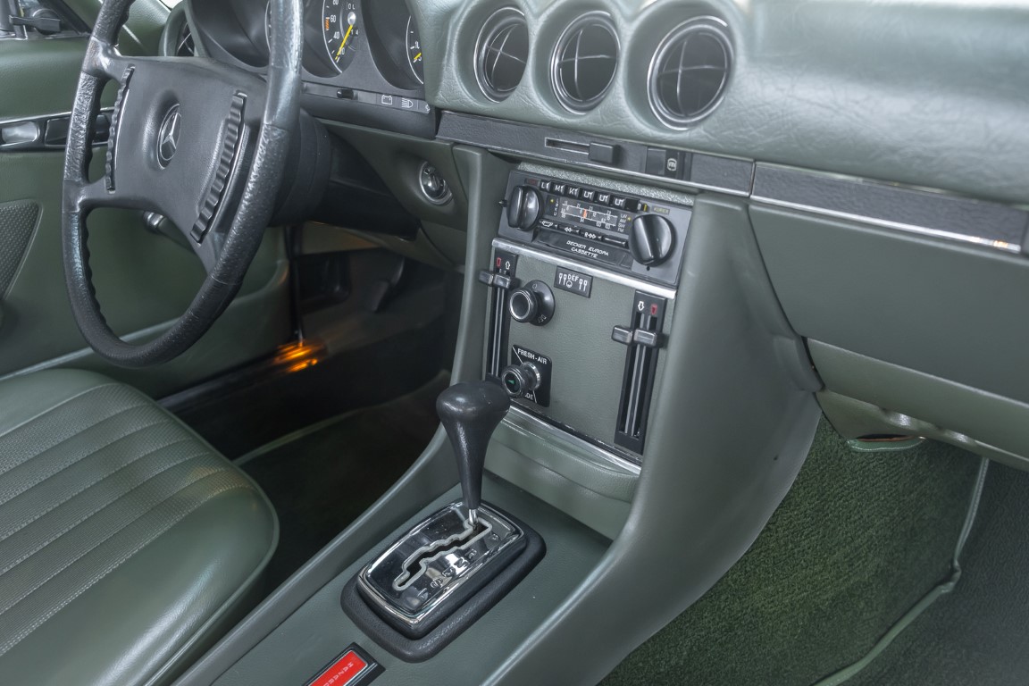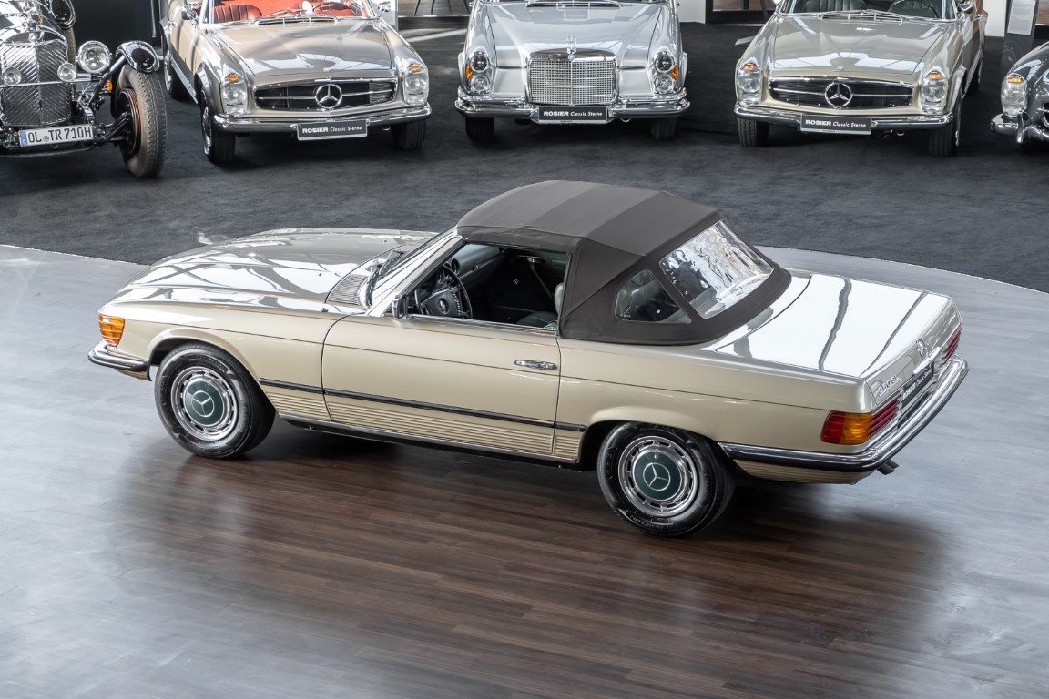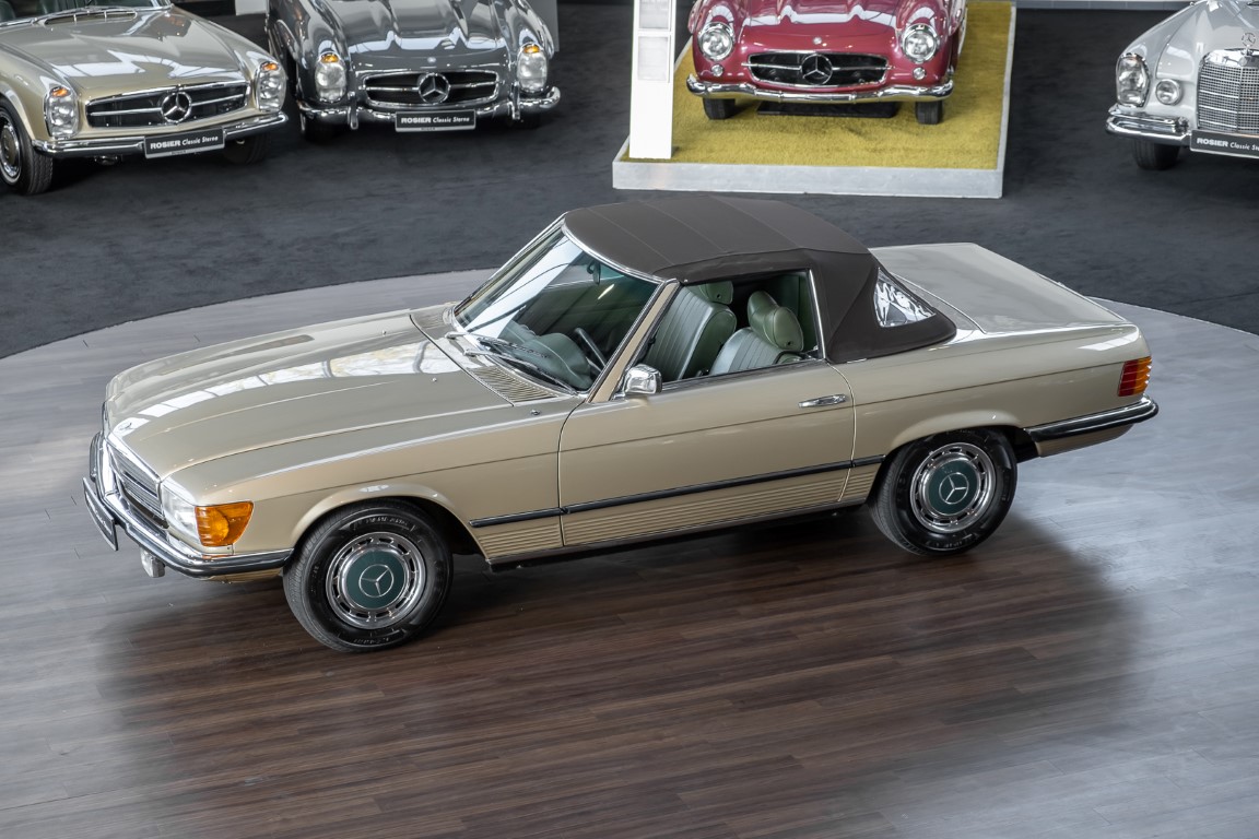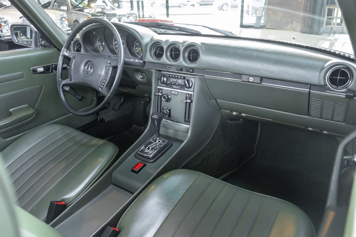 Die Serienproduktion des Mercedes-Benz 350SL Roadsters begann im April 1971 im Werk Sindelfingen. Der hier angebotene Roadster wurde am 25. Oktober 1971 fertiggestellt und in die USA geliefert. Es handelt sich somit um ein ganz frühes Modell und ist für Sammler höchst interessant. Er wurde im Januar 1972 auf den Erstbesitzer zugelassen und verblieb all die Jahre in den USA. Aus der ländlichen ca. 7.000 Einwohner-Gemeinde Sutherlin in Oregon/USA, nur etwa 1 Stunde entfernt von der Winchester Bay am Nord Pacific wurde das Fahrzeug nach Deutschland eingeführt. Der Zustand des Wagens ist sehr original, die unverwüstliche MB-Tex Ausstattung in Olivgrün (166) befindet sich bis heute in einem sehr guten Zustand, die Lackierung wurde offensichtlich vor Jahren erneuert. Der Gesamtzustand des Wagens ist höchst erfreulich, der Unterboden wurde Trockeneisgestrahlt und befindet sich in sauberem und ordentlichen Zustand. Der Motor läuft kraftvoll und weich, das Getriebe wurde erst kürzlich von unseren Spezialisten überholt und schaltet wie man es von einem Mercedes erwartet. Ein rundum toller 107er, der mit seinem starken V8 Motor und einer besonders stilsicheren Farbkombination zu überzeugen weiß. Steigen Sie ein und erfahren Sie es selbst.