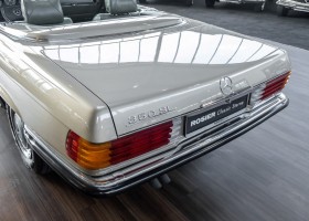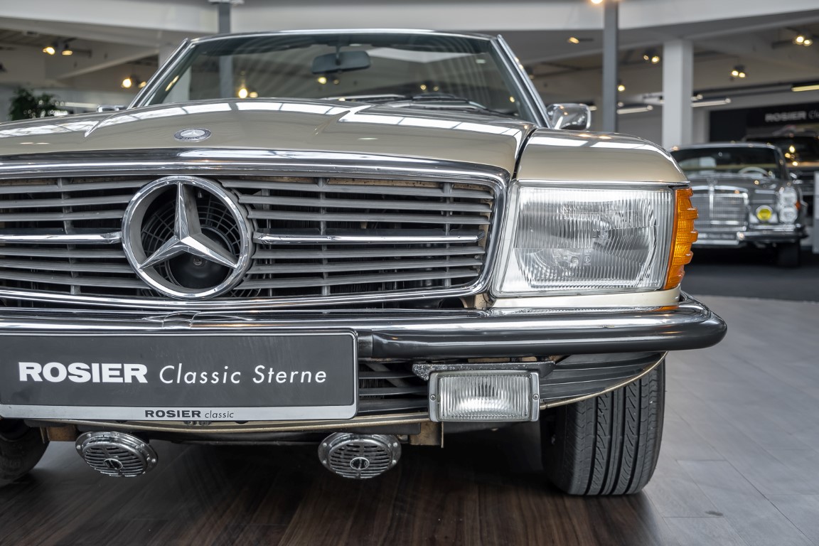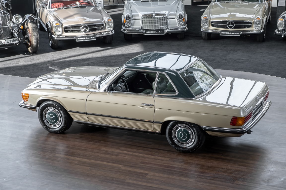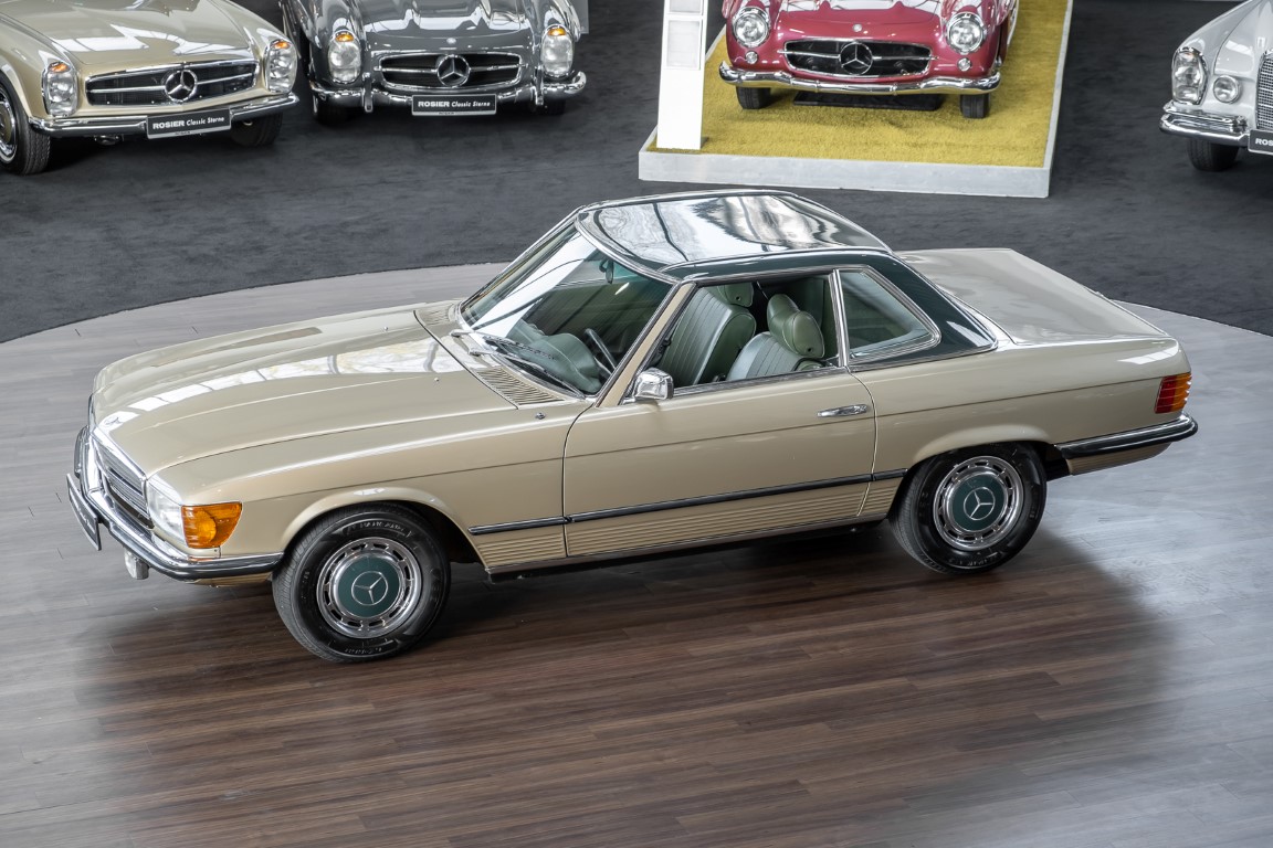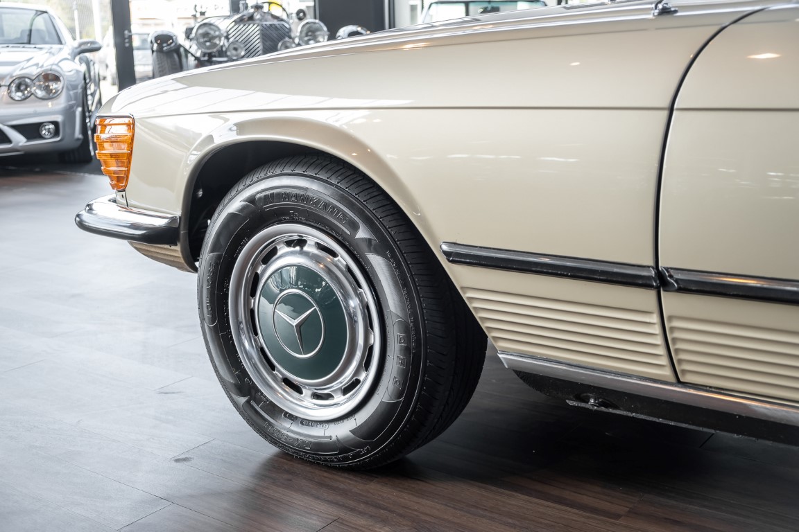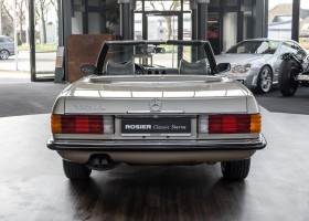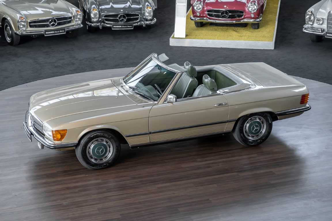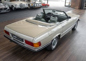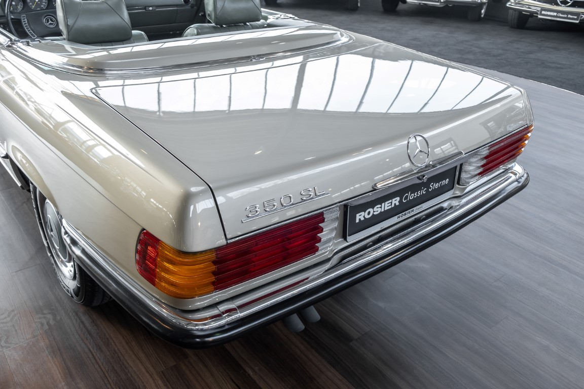 Die Serienproduktion des Mercedes-Benz 350SL Roadsters begann im April 1971 im Werk Sindelfingen. Der hier angebotene Roadster wurde am 25. Oktober 1971 fertiggestellt und in die USA geliefert. Es handelt sich somit um ein ganz frühes Modell und ist für Sammler höchst interessant. Er wurde im Januar 1972 auf den Erstbesitzer zugelassen und verblieb all die Jahre in den USA. Aus der ländlichen ca. 7.000 Einwohner-Gemeinde Sutherlin in Oregon/USA, nur etwa 1 Stunde entfernt von der Winchester Bay am Nord Pacific wurde das Fahrzeug nach Deutschland eingeführt. Der Zustand des Wagens ist sehr original, die unverwüstliche MB-Tex Ausstattung in Olivgrün (166) befindet sich bis heute in einem sehr guten Zustand, die Lackierung wurde offensichtlich vor Jahren erneuert. Der Gesamtzustand des Wagens ist höchst erfreulich, der Unterboden wurde Trockeneisgestrahlt und befindet sich in sauberem und ordentlichen Zustand. Der Motor läuft kraftvoll und weich, das Getriebe wurde erst kürzlich von unseren Spezialisten überholt und schaltet wie man es von einem Mercedes erwartet. Ein rundum toller 107er, der mit seinem starken V8 Motor und einer besonders stilsicheren Farbkombination zu überzeugen weiß. Steigen Sie ein und erfahren Sie es selbst.