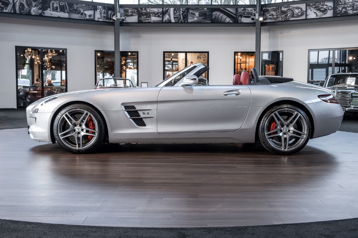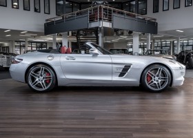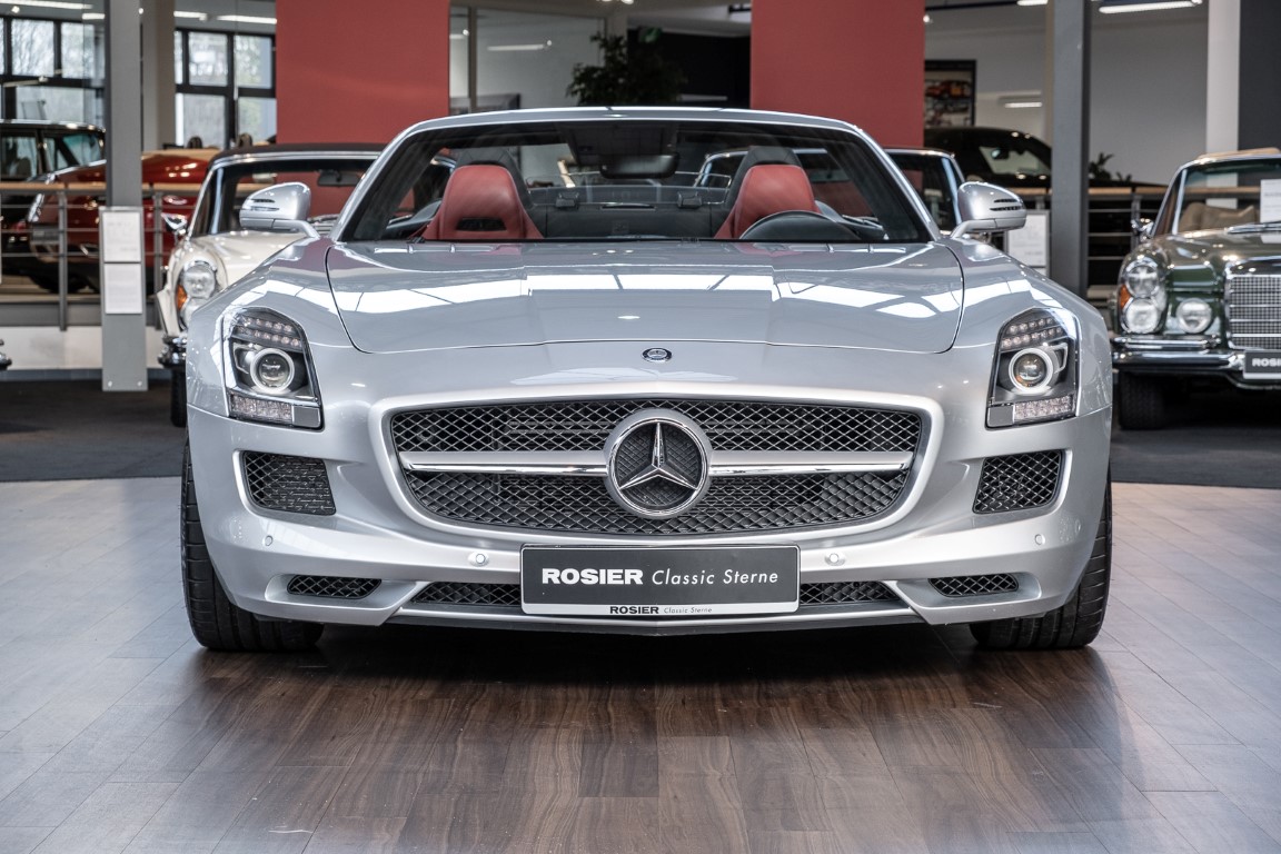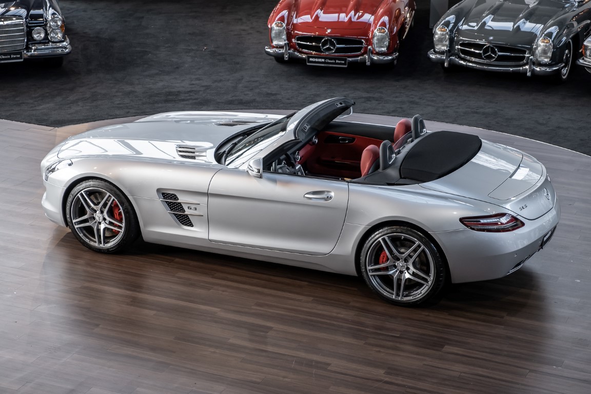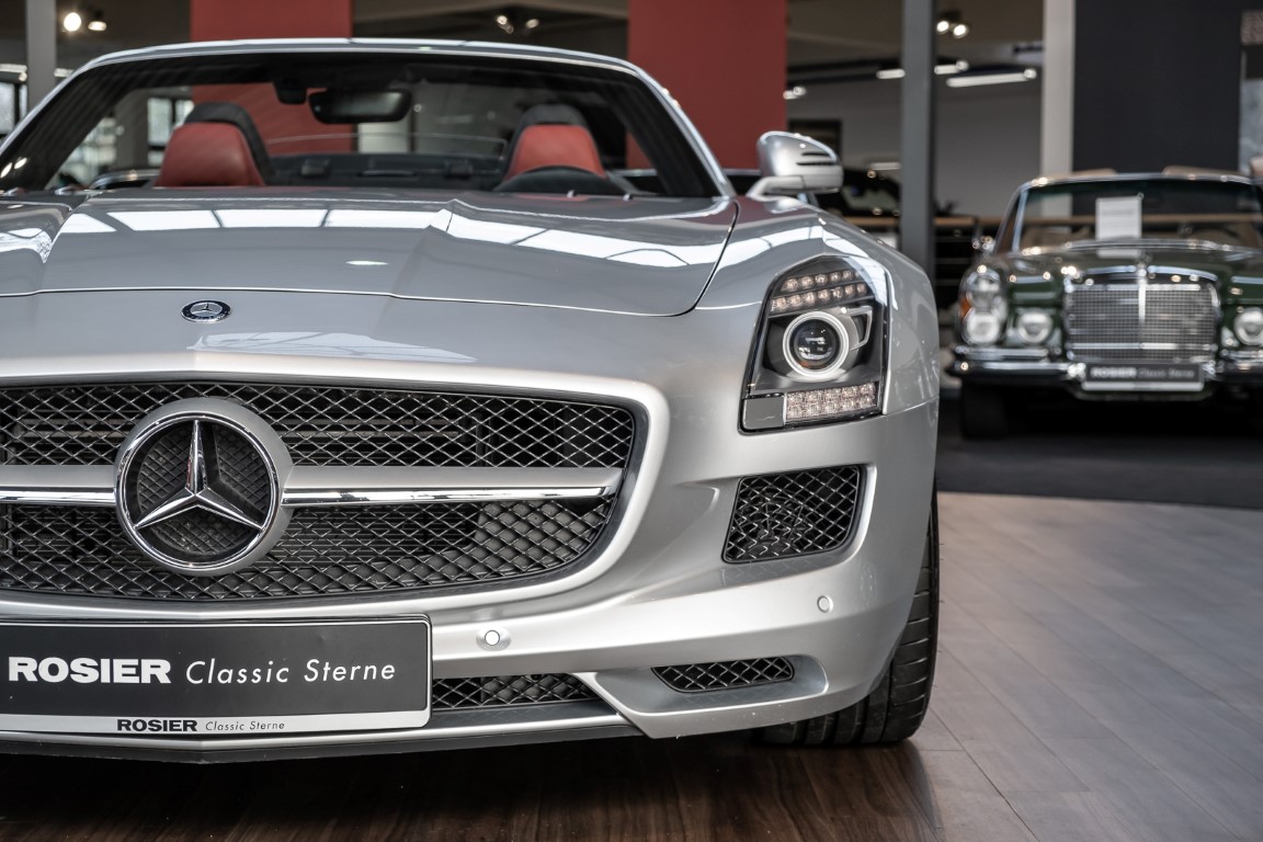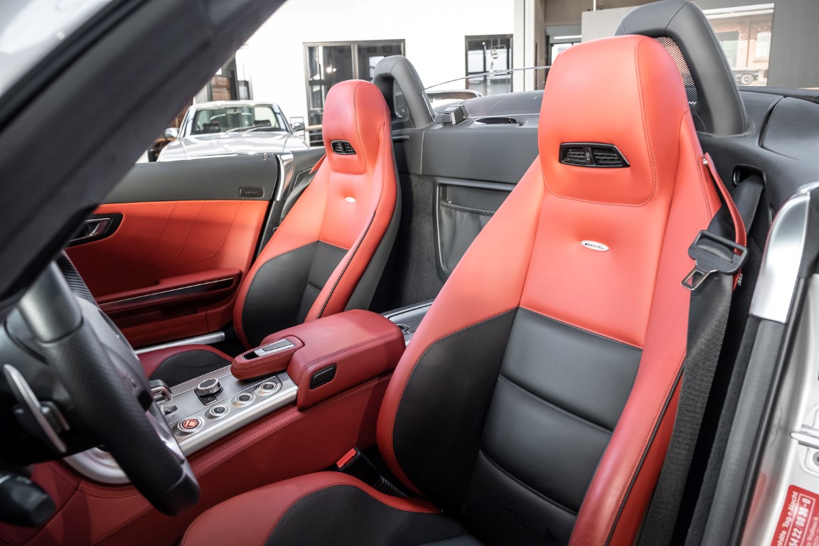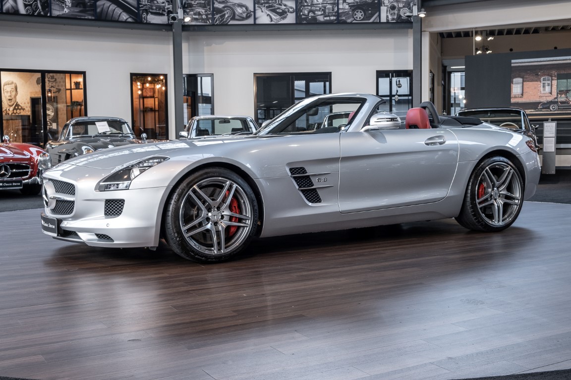 Dieser wundervolle SLS AMG Roadster in der klassisch-sportlichen Kombination „Iridiumsilber Metallic“ mit rotem AMG Exklusiv Leder ist im wahrsten Sinne des Wortes ein Silberpfeil.