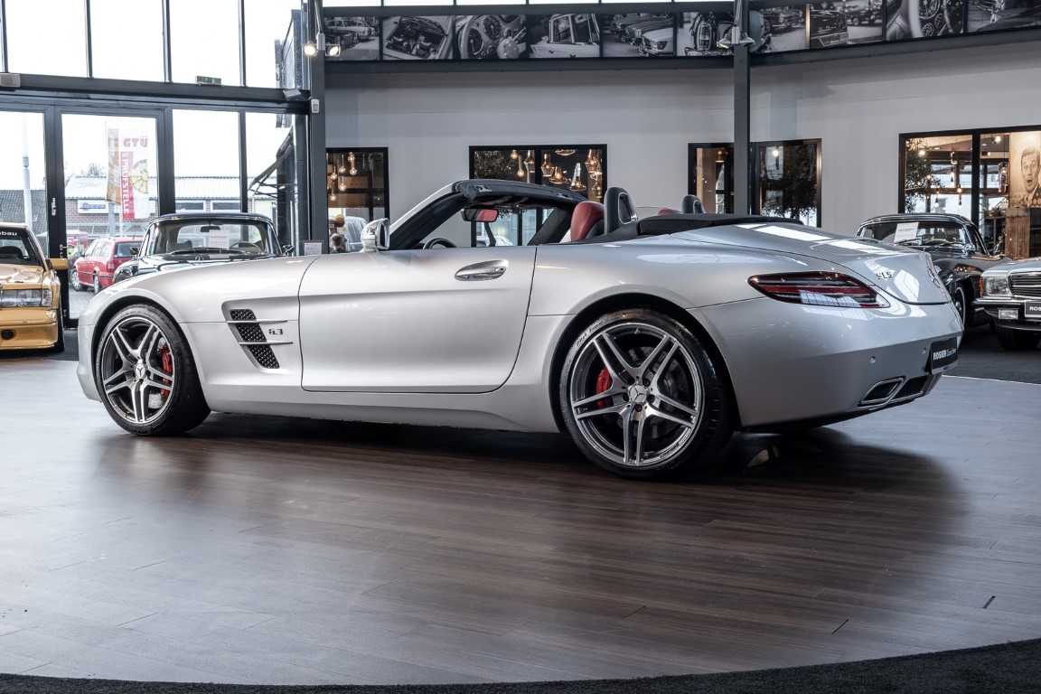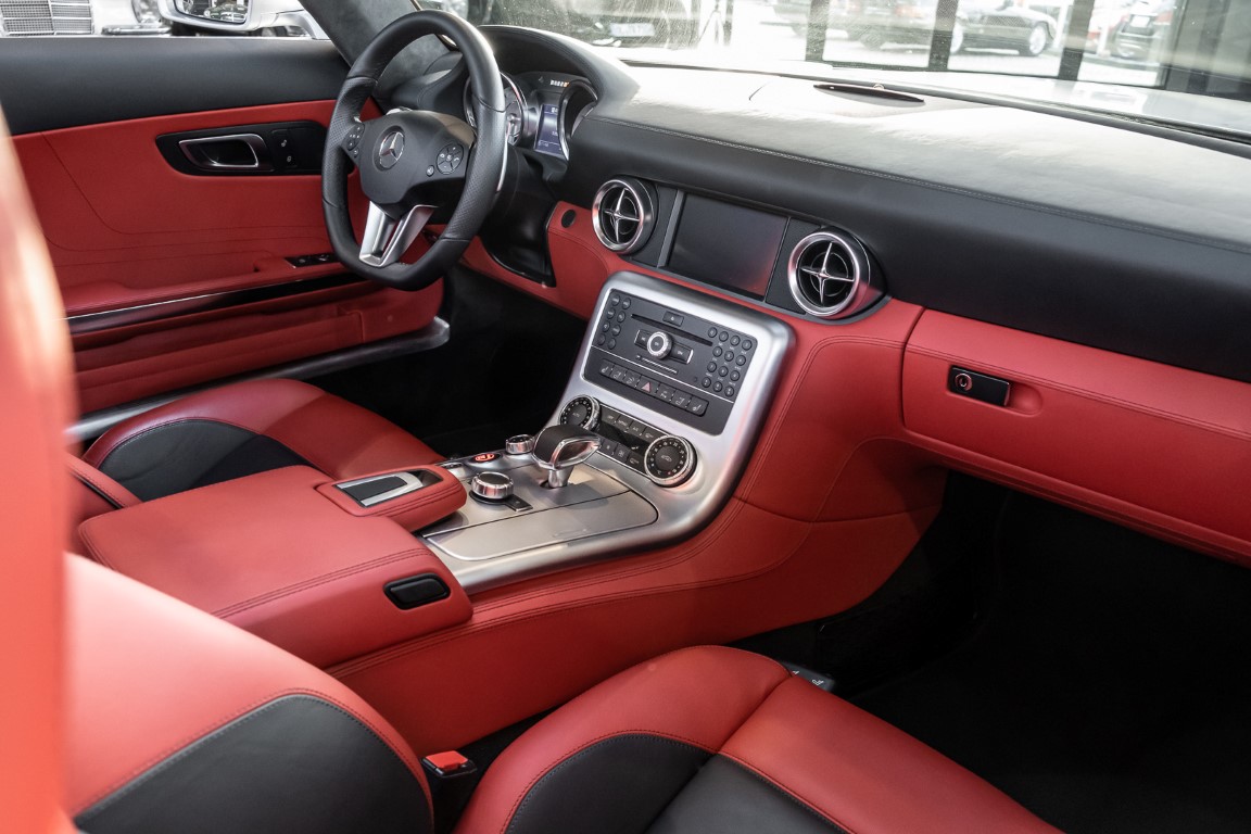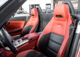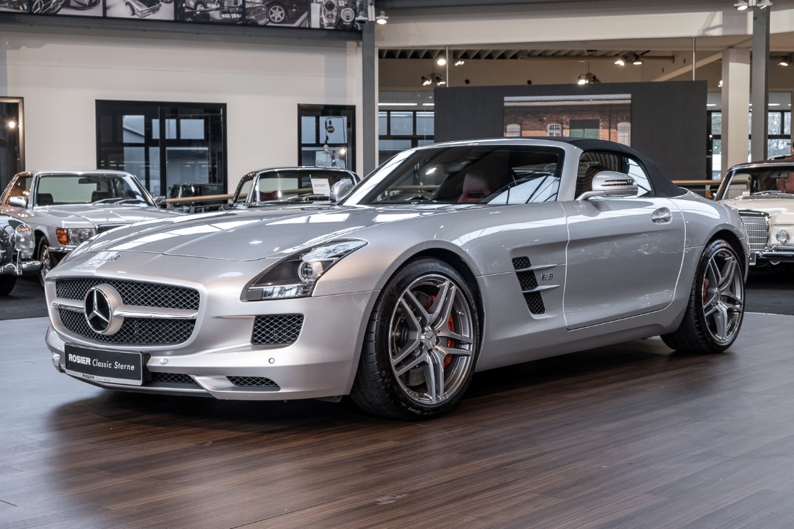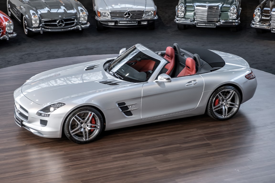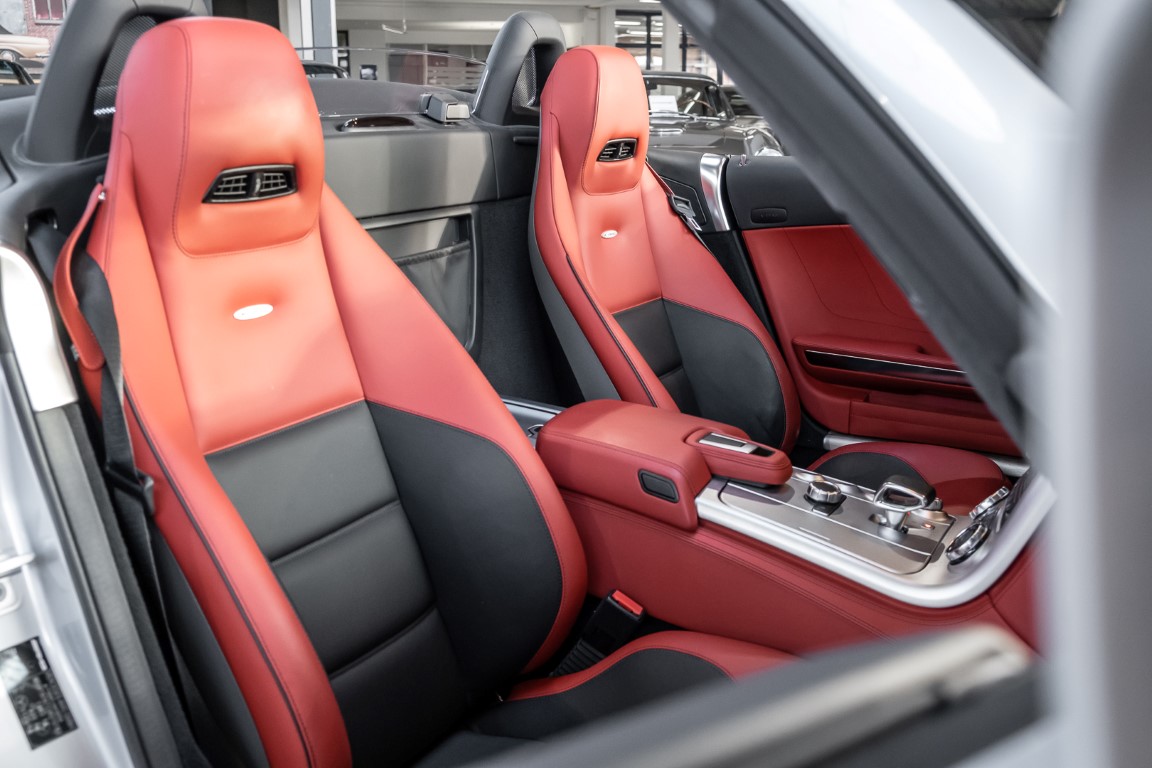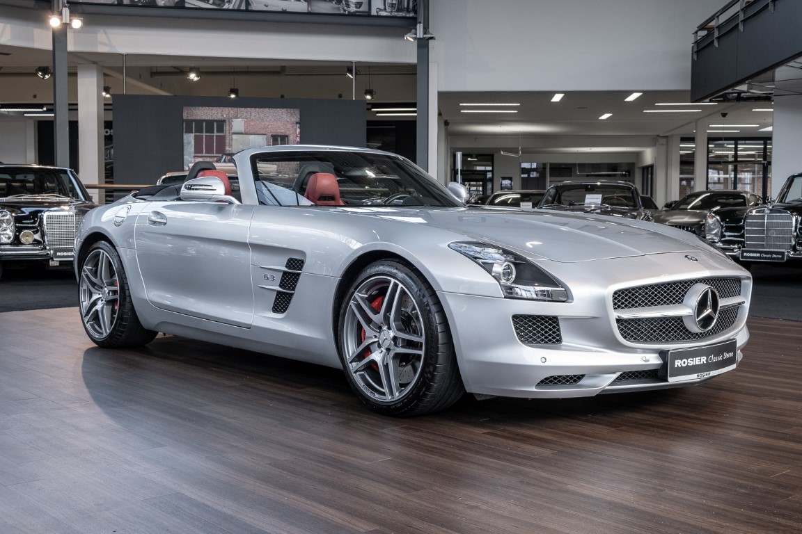 Dieser wundervolle SLS AMG Roadster in der klassisch-sportlichen Kombination „Iridiumsilber Metallic“ mit rotem AMG Exklusiv Leder ist im wahrsten Sinne des Wortes ein Silberpfeil.