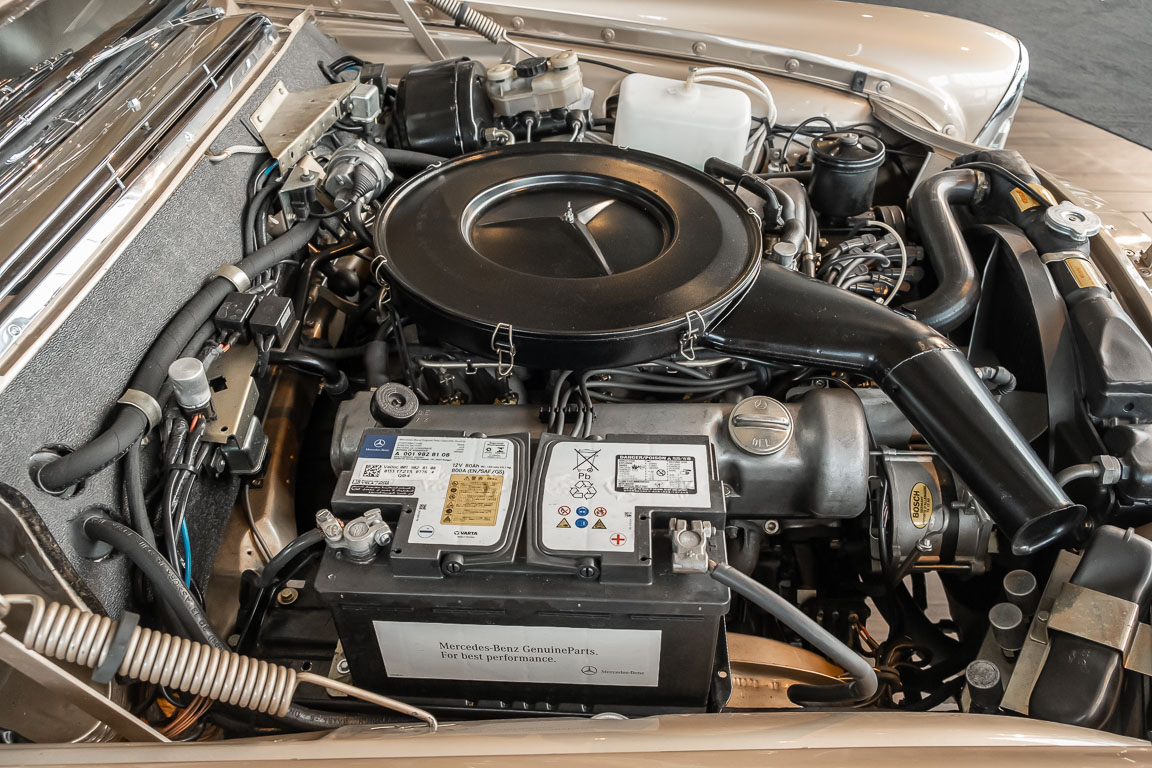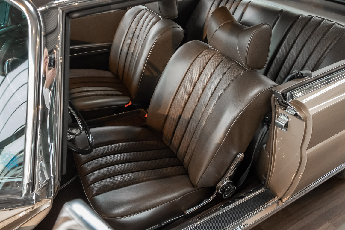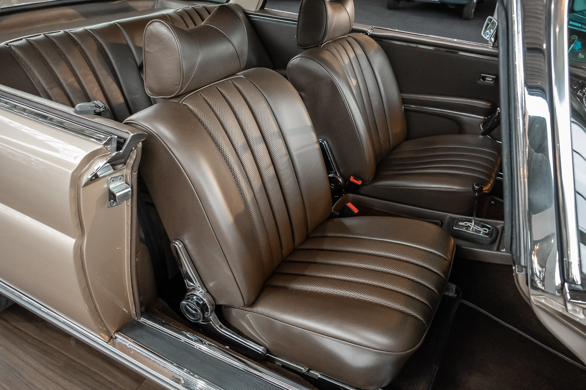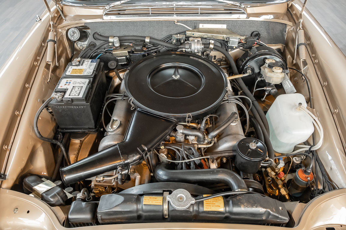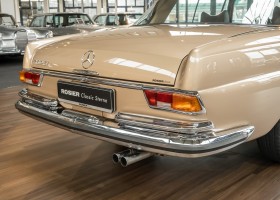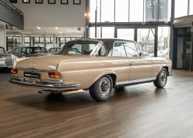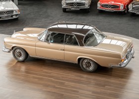 We are pleased to offer you this expressive 3.5-liter coupe with German first registration. A look at the vehicle registration document reveals that a great in the classic car scene was also addicted to the charm of this coupe. The dream coupe has been disassembled and rebuilt "down to the last screw". The engine, the transmission, the front and rear axle as well as all auxiliary units have been revised or replaced. The two-tone paint in sand beige metallic and dark red bruan harmonizes perfectly with the tobacco brown leather upholstery and the burl wood veneers, whose hue is echoed exactly in the brown roof. A color combination that has its own special appeal and exudes enormous radiance. Experience the charm of this luxury coupe of the 70s.