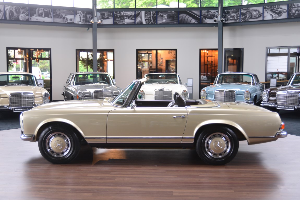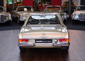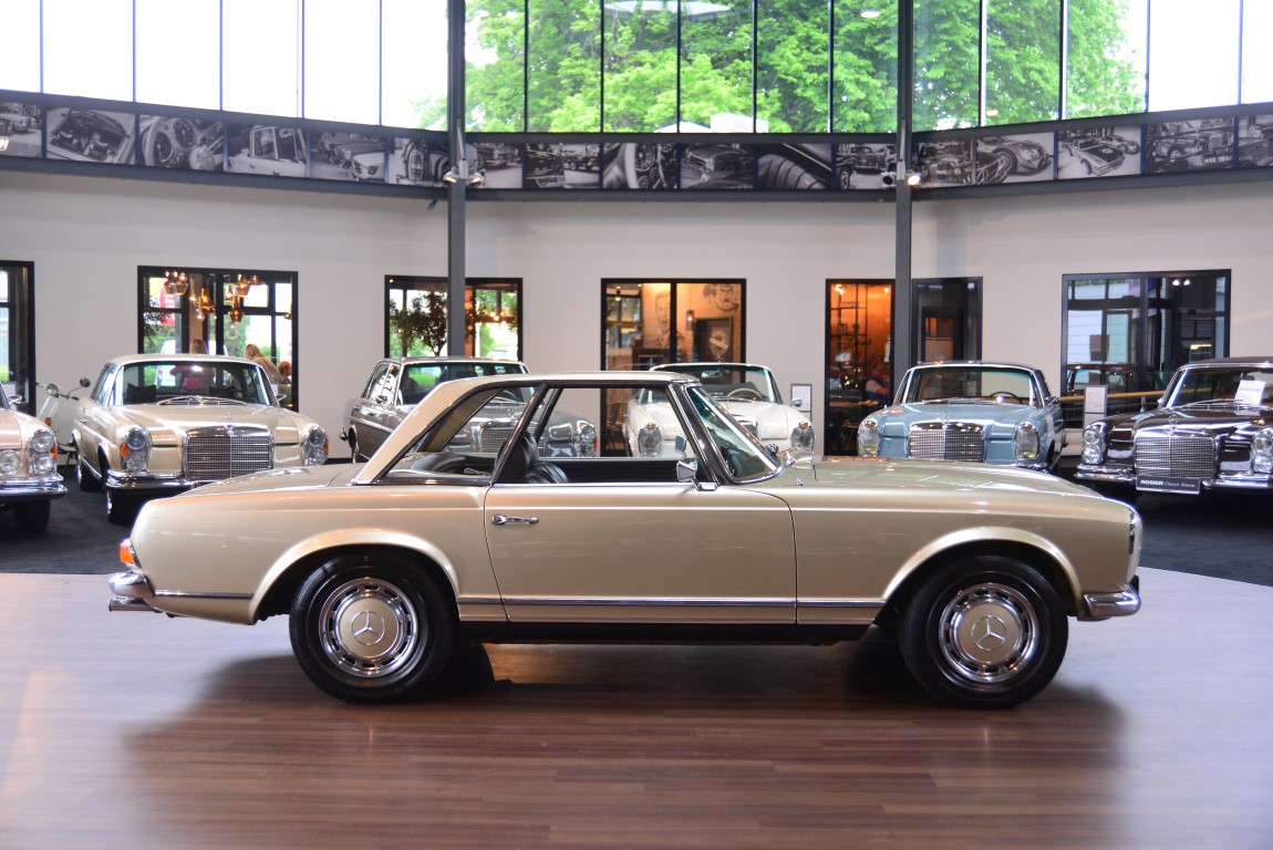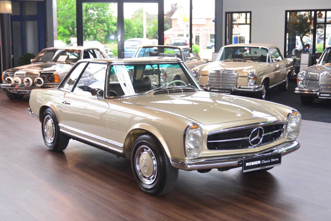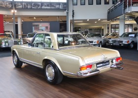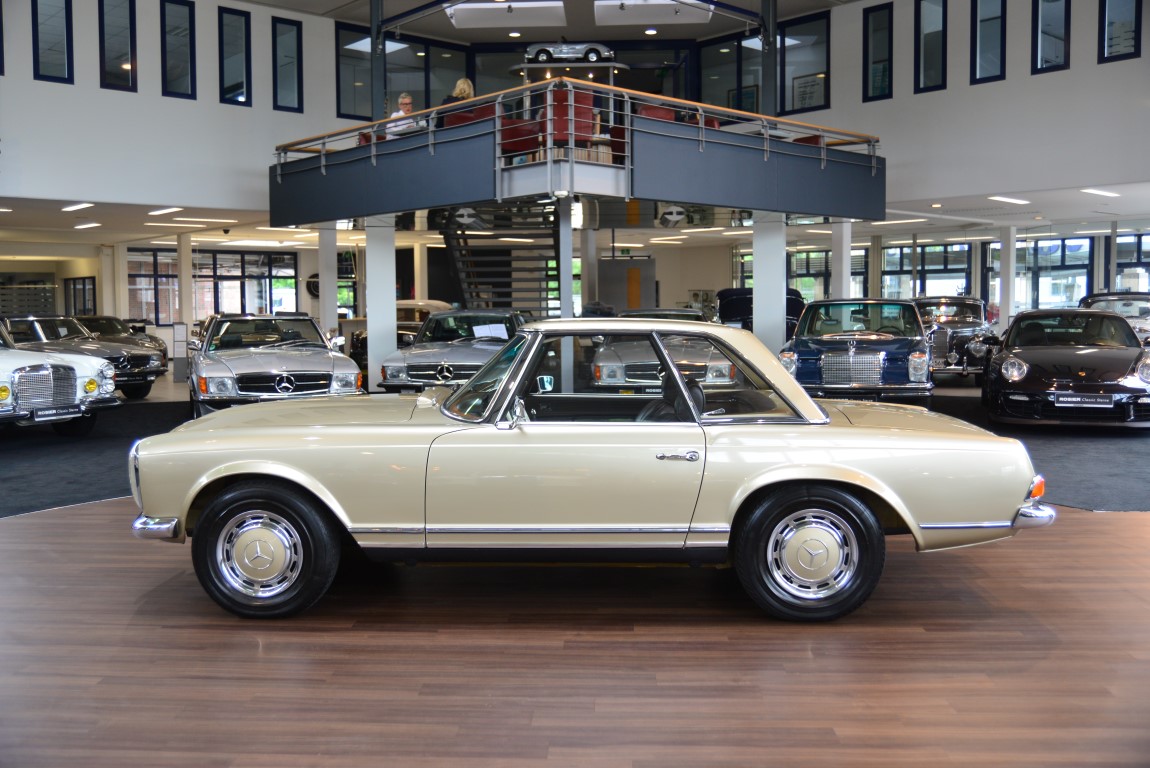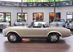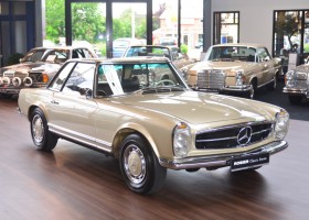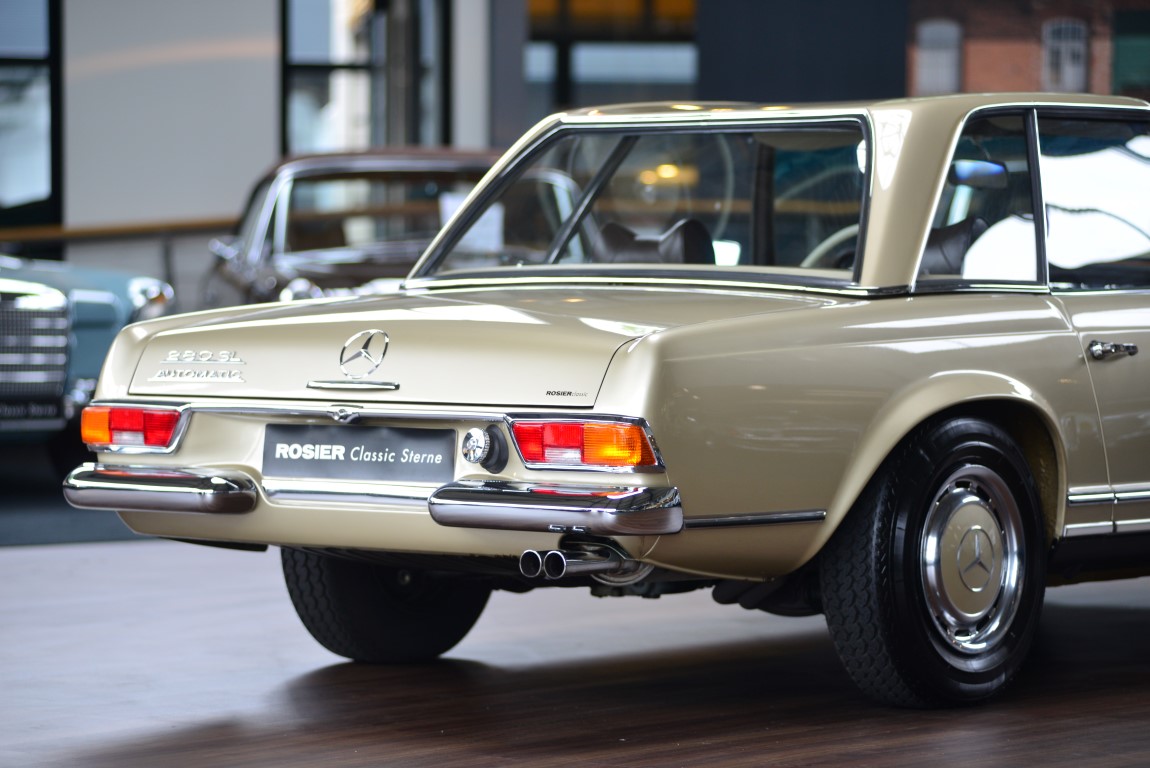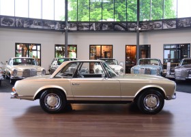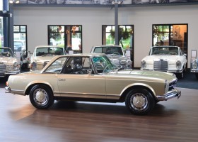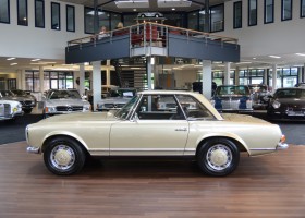 This Mercedes-Benz 280SL Roadster from the so popular series W113 was delivered on 18.04.1968 to an old-established furniture store in Hamburg. The maintenance was mostly done at Mercedes-Benz in Hamburg, as still existing copies of invoices prove. A new factory gearbox was installed in 1981, which is proven by the original Aggregate-Pass. The car remained there until it was sold to a hotelier in Belgium in 2007. The Mercedes-Benz partner in Mechelen provided all the years for the best possible maintenance and preservation of the car. The hotelier kept the roadster in his possession until 2014. In 2014 the elegant pagoda came in excellent condition to Mercedes-Benz partner Autohaus Rosier in the Ammerländer Heerstraße in Oldenburg. An extensive inspection was carried out and the car was put in top condition. The leather upholstery was faithfully renewed by the Mönnich car saddlery in Oldenburg, known for the best leather work. A lover of classic Mercedes-Benz vehicles had taken a great liking to the car and purchased it for his collection. In order to preserve the car and to avoid damage to the car, the pagoda was occasionally used for journeys only in good weather. Now that the collection is to be reduced in size, we are pleased to be able to offer you this magnificent pagoda again. Everything works, no maintenance jam, ready for use even on long distances.