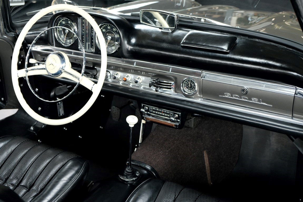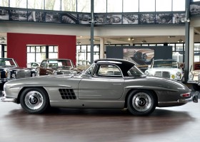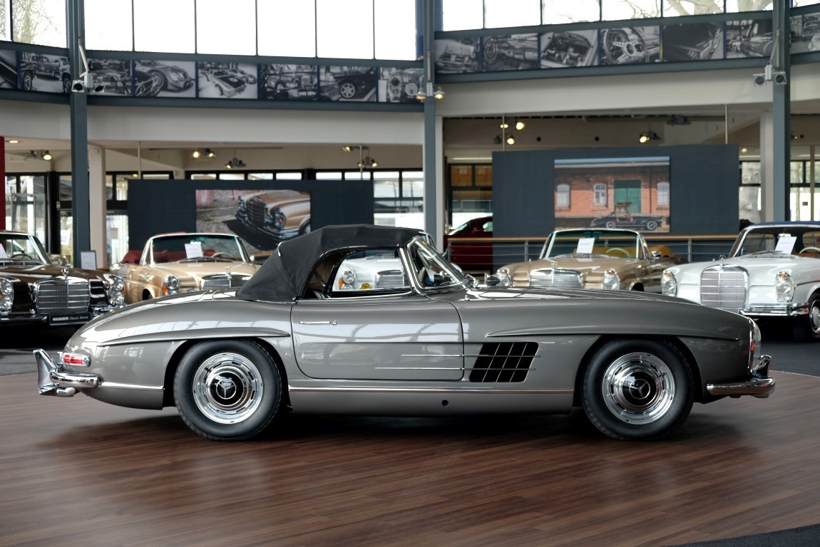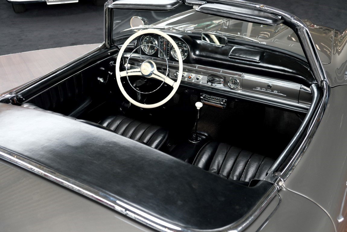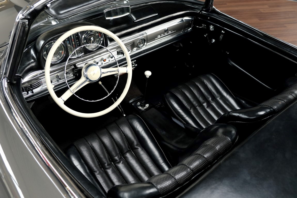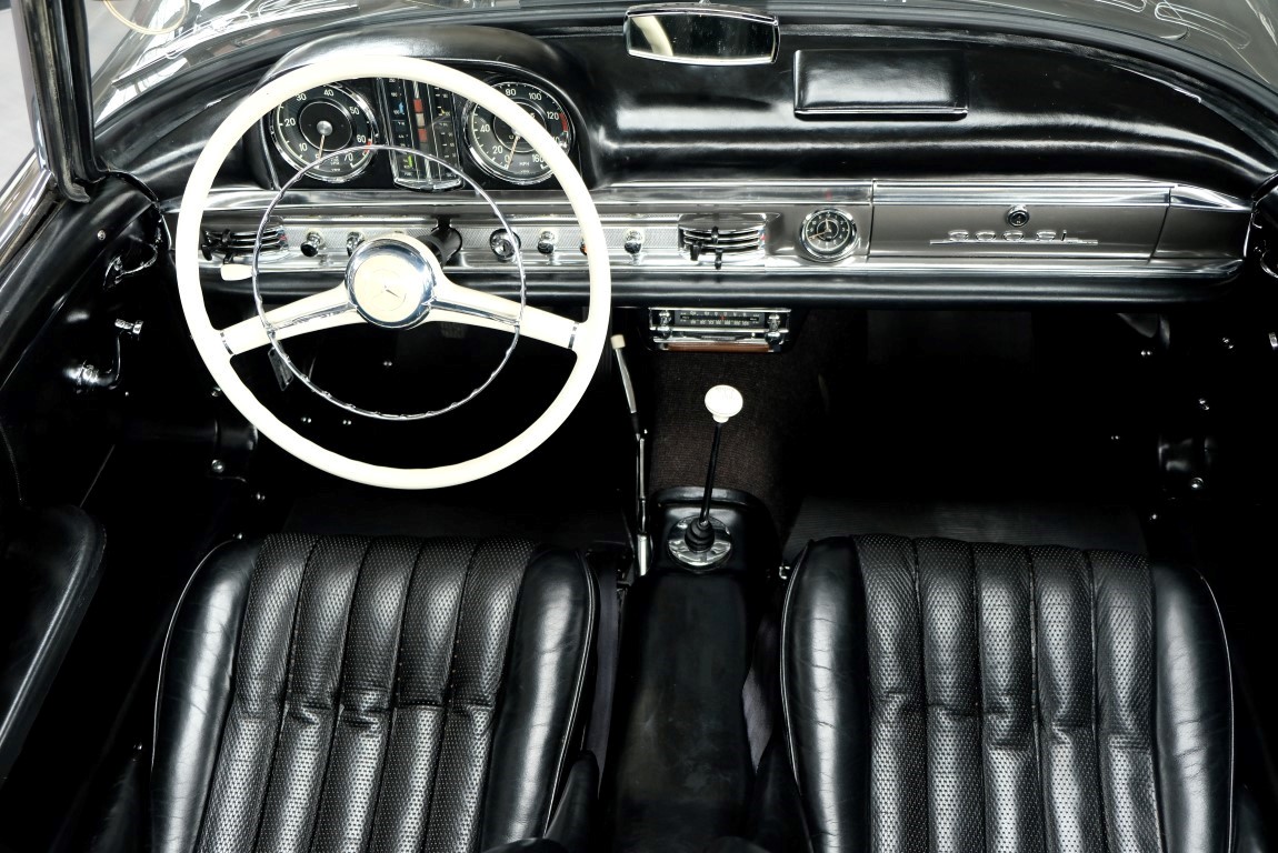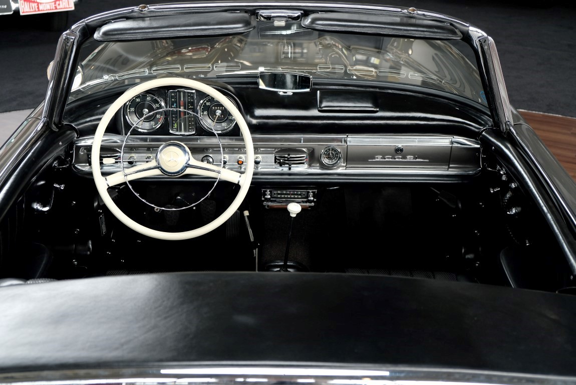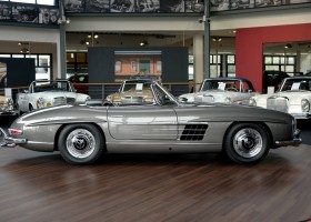 This Mercedes-Benz 300SL Roadster, which we offer, is undoubtedly one of the most sought-after examples of all. He was delivered in 1963 via the American Mercedes importer Max Hoffmann to his first owner in Ohio. A late model, already with disc brakes and the lighter aluminum engine, which has undergone careful revisio. The vehicle was equipped with a black hardtop and black hubcaps, as the car still presents today. From 1977 to 2001 he was owned by Robert B. Harris of Shelbyville Indiana. He then bought the elegant roadster Jack Hutton, which was based in Concord, New Hampshire. He kept the Roadster until 2015 and had it extensively revised at a very high level. The work was done by well-known US addresses. So did the bodywork Al Poskus, the mechanics Dave Twichell and Mike Curley dedicated to the interior. In 2018, the car got a new paintwork and presented itself in a deep shine that is unparalleled.