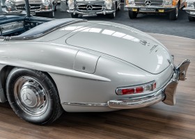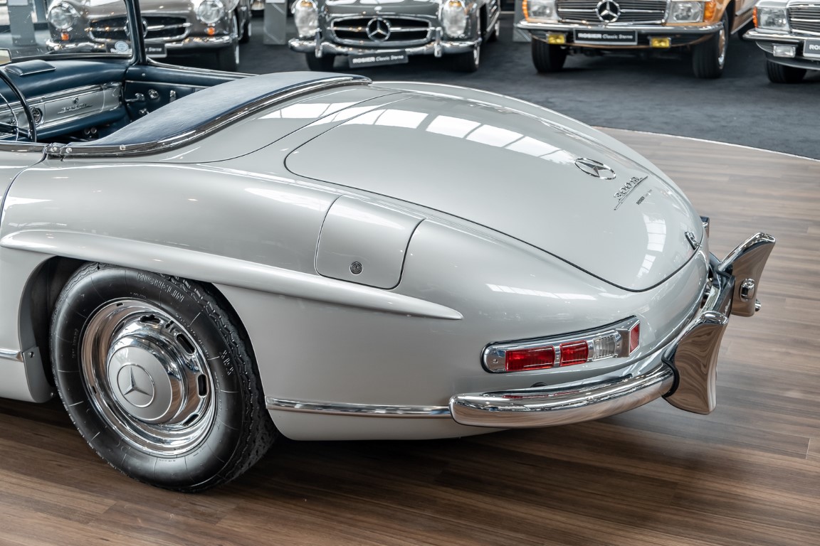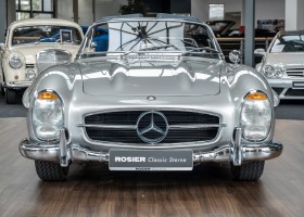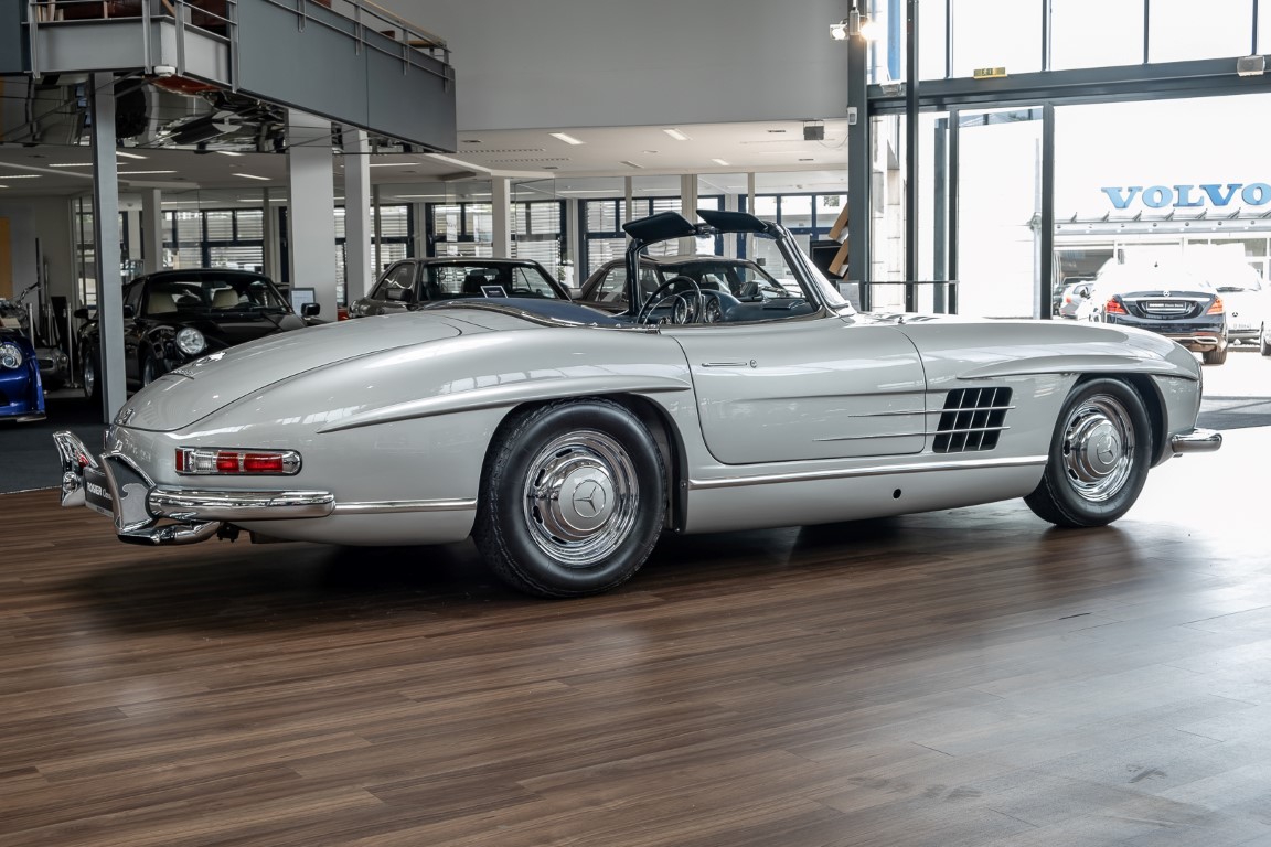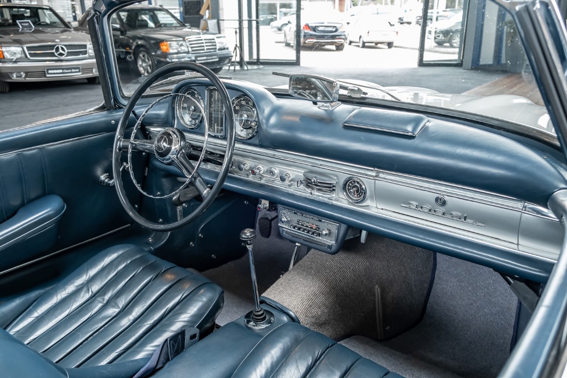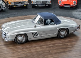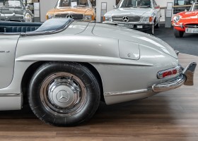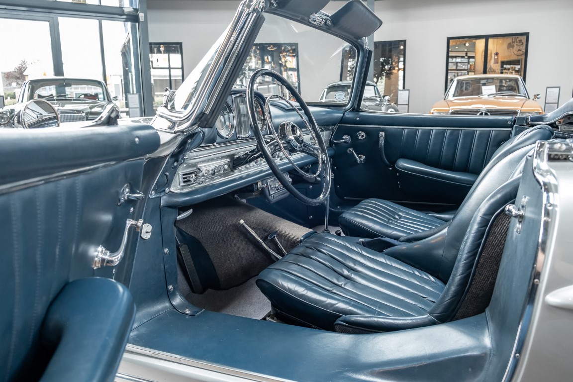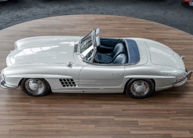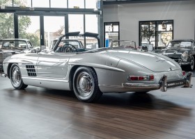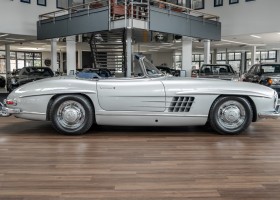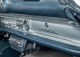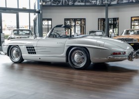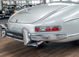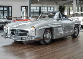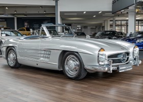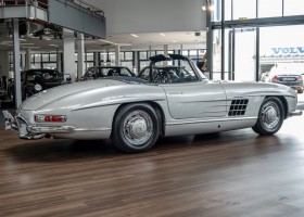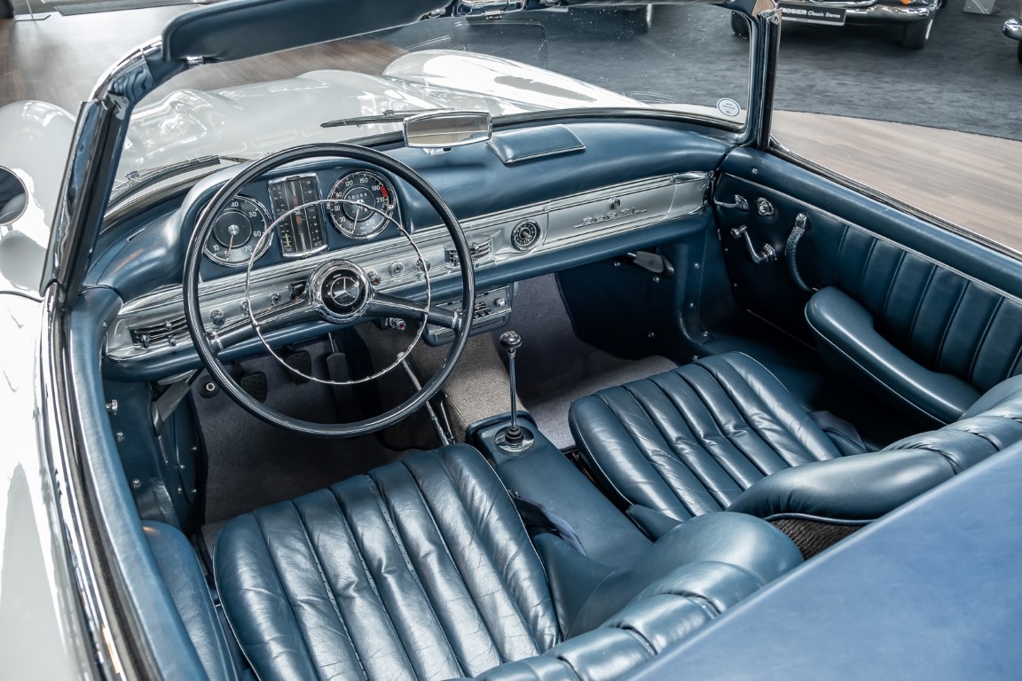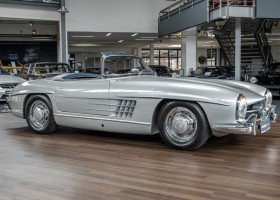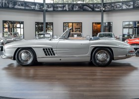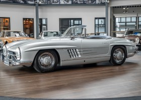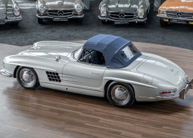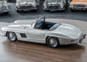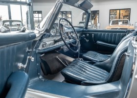 This wonderful 300 SL roadster from the early 1957 model year was delivered in the same year to its first owner in Minnesota USA. The vehicle remained in his possession for a total of 36 years until a gentleman from Texas was able to purchase the vehicle in 1993. Almost 10 years later the car was also sold to a gentleman from Texas before it was sold to Europe and extensively restored by a well-known German 300 SL specialist. At last the vehicle was in an exquisite vehicle collection in sunny Portugal, directly at the Algave, from which we could get this dream convertible in the fantastic colour combination silver-grey-metallic with dark blue leather.