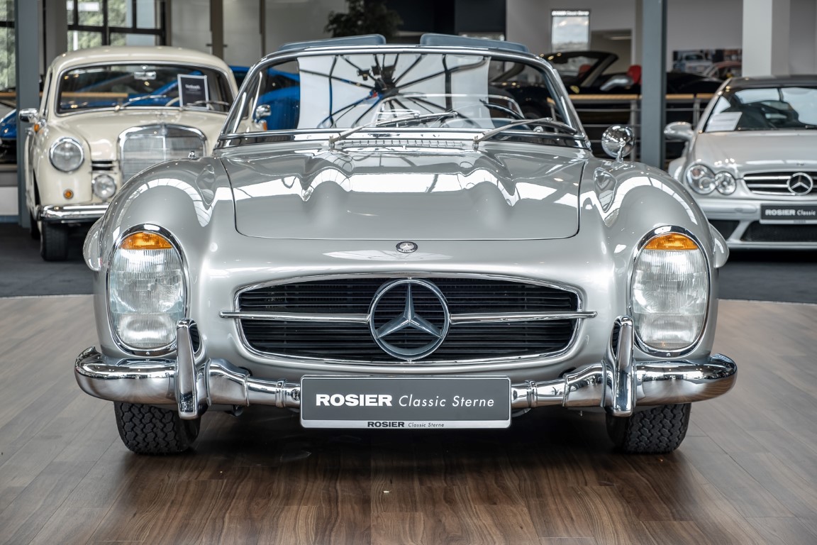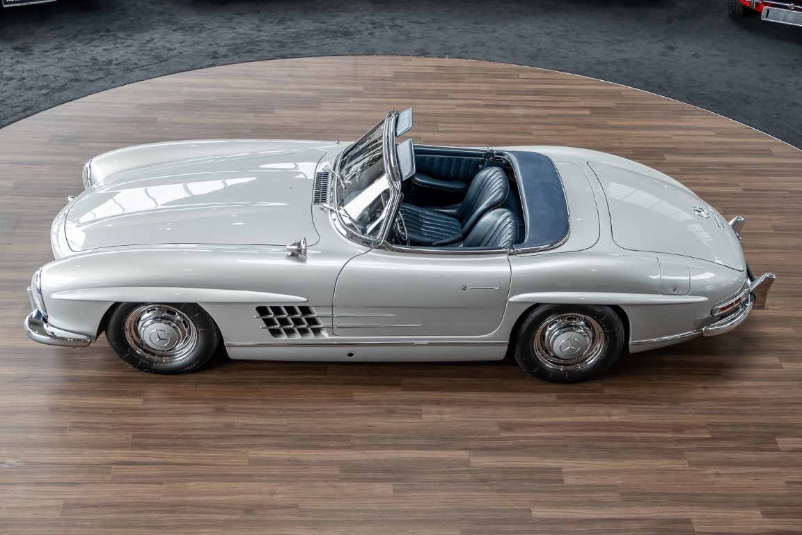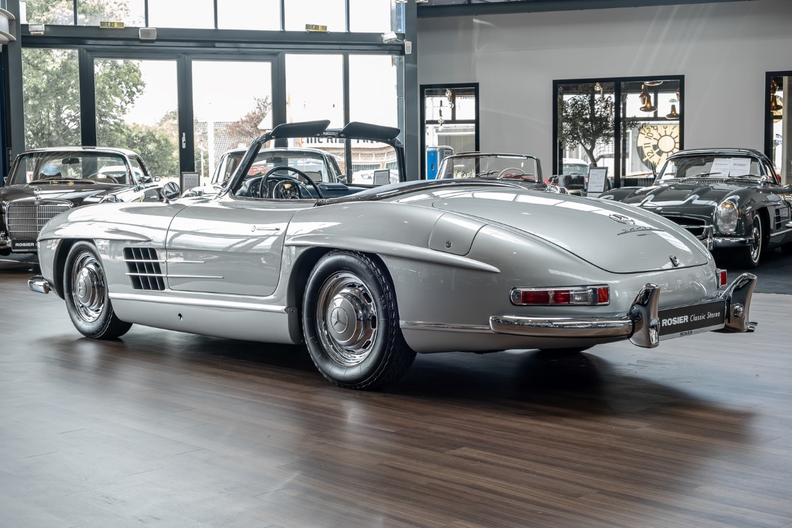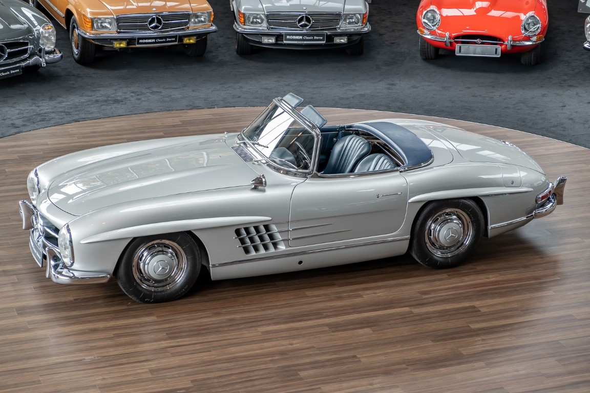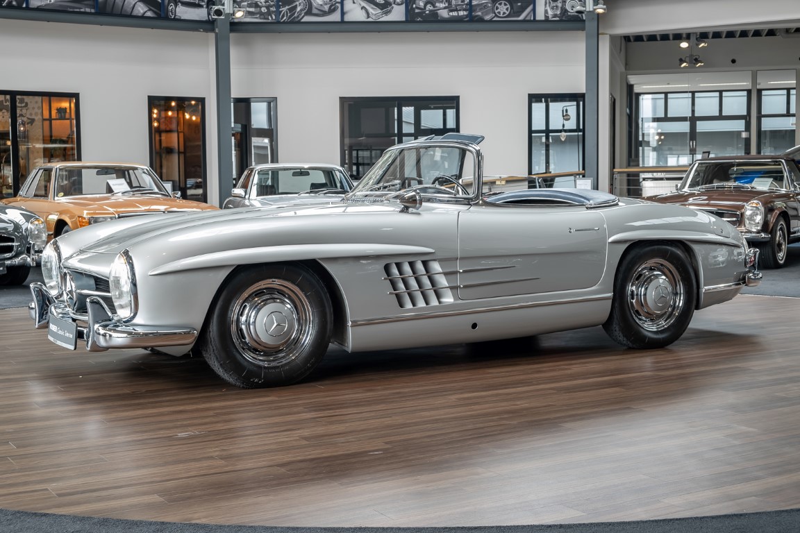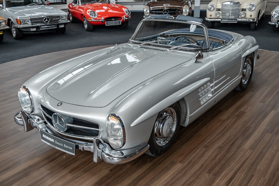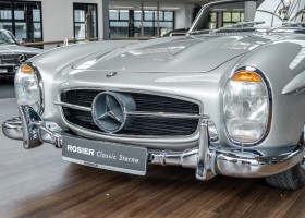 This wonderful 300 SL roadster from the early 1957 model year was delivered in the same year to its first owner in Minnesota USA. The vehicle remained in his possession for a total of 36 years until a gentleman from Texas was able to purchase the vehicle in 1993. Almost 10 years later the car was also sold to a gentleman from Texas before it was sold to Europe and extensively restored by a well-known German 300 SL specialist. At last the vehicle was in an exquisite vehicle collection in sunny Portugal, directly at the Algave, from which we could get this dream convertible in the fantastic colour combination silver-grey-metallic with dark blue leather.