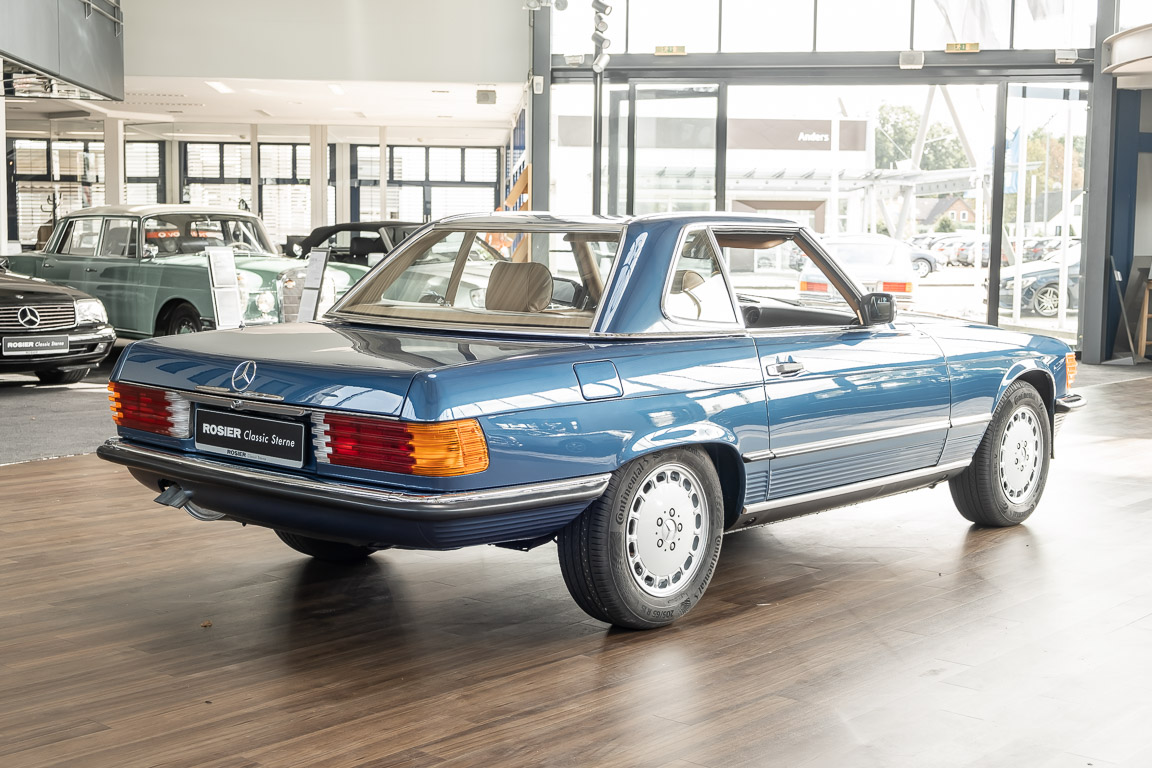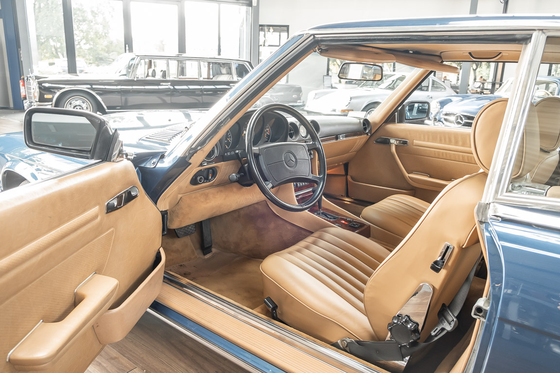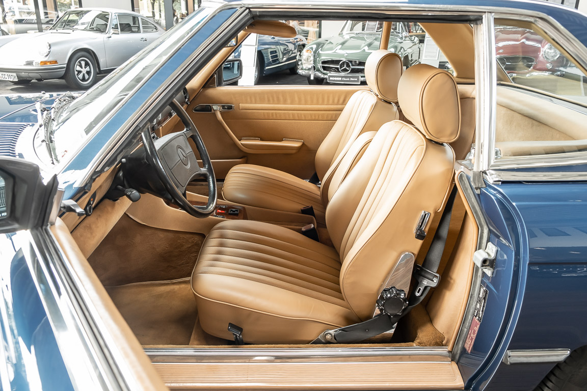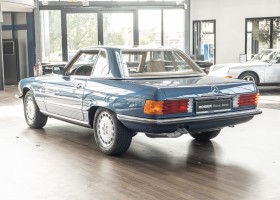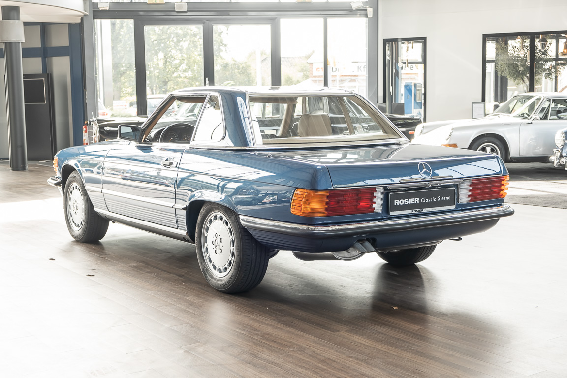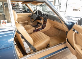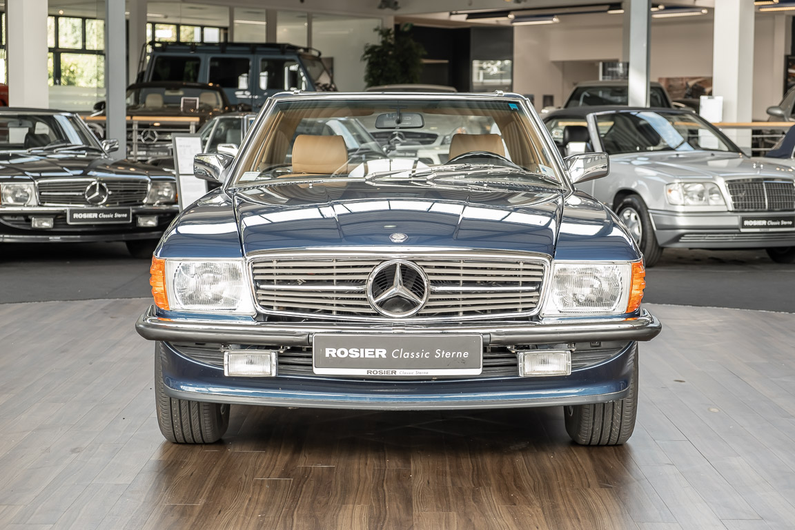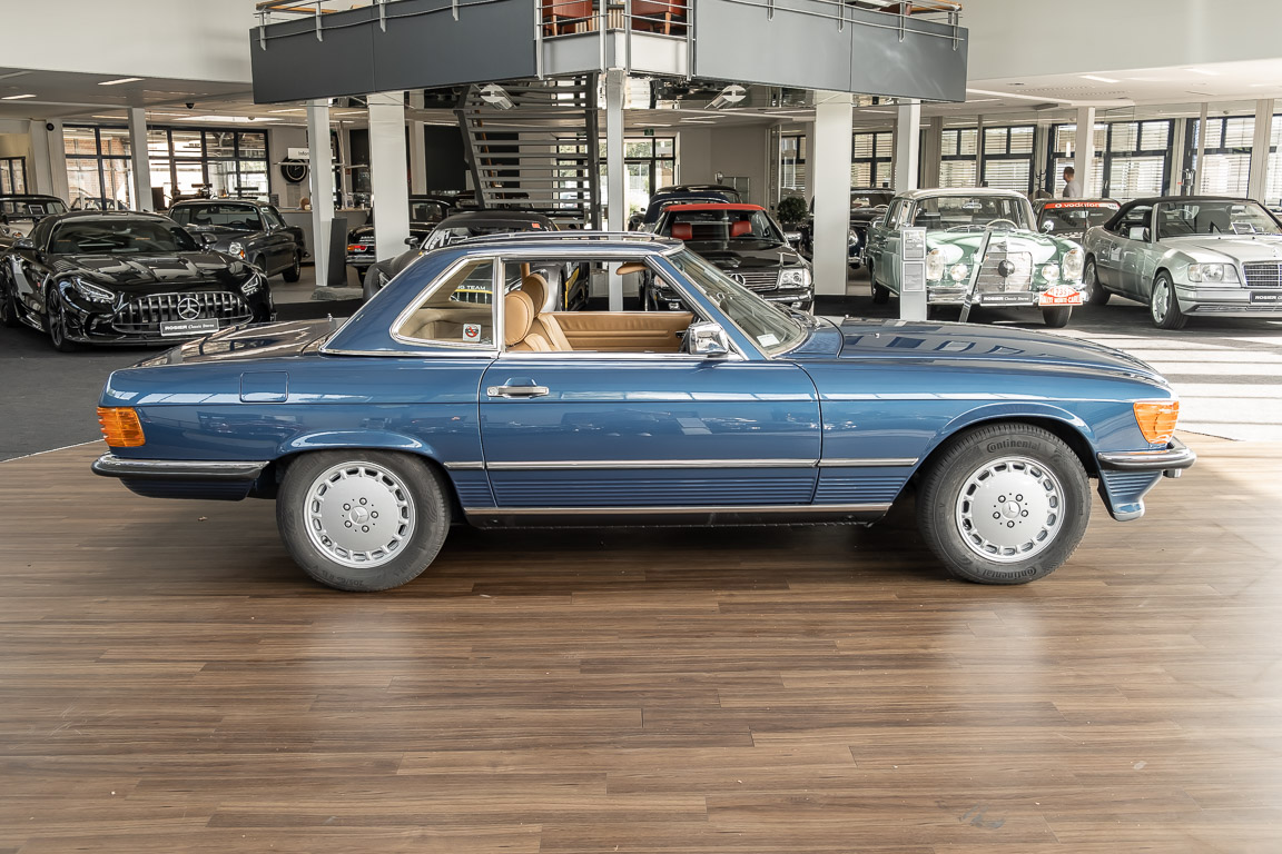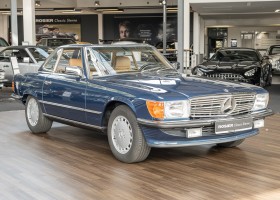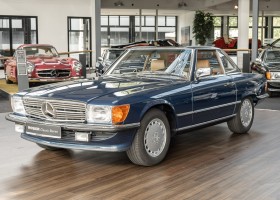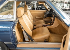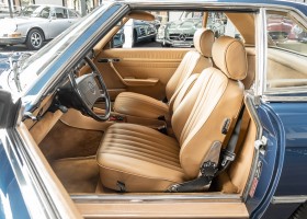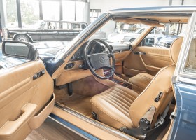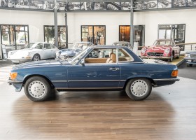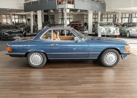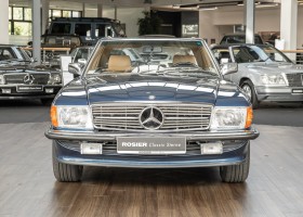 We are pleased to offer you this 560 SL of the 107 series. In the stylish color combination of a paint job in "nautical blue metallic" in combination with leather in the warm color "date", this car radiates a timeless appeal. While gliding effortlessly along with 230 hp in every situation, the driver experiences impeccable and well-maintained technology. Braking, accelerating, shifting: everything works as it should. The vehicle is handed over to its new owner with a fresh main inspection, an up-to-date service and a hardtop. An absolute delight to indulge in this roadster. "Experience" it for yourself. Welcome to ROSIER Classic Stars.
