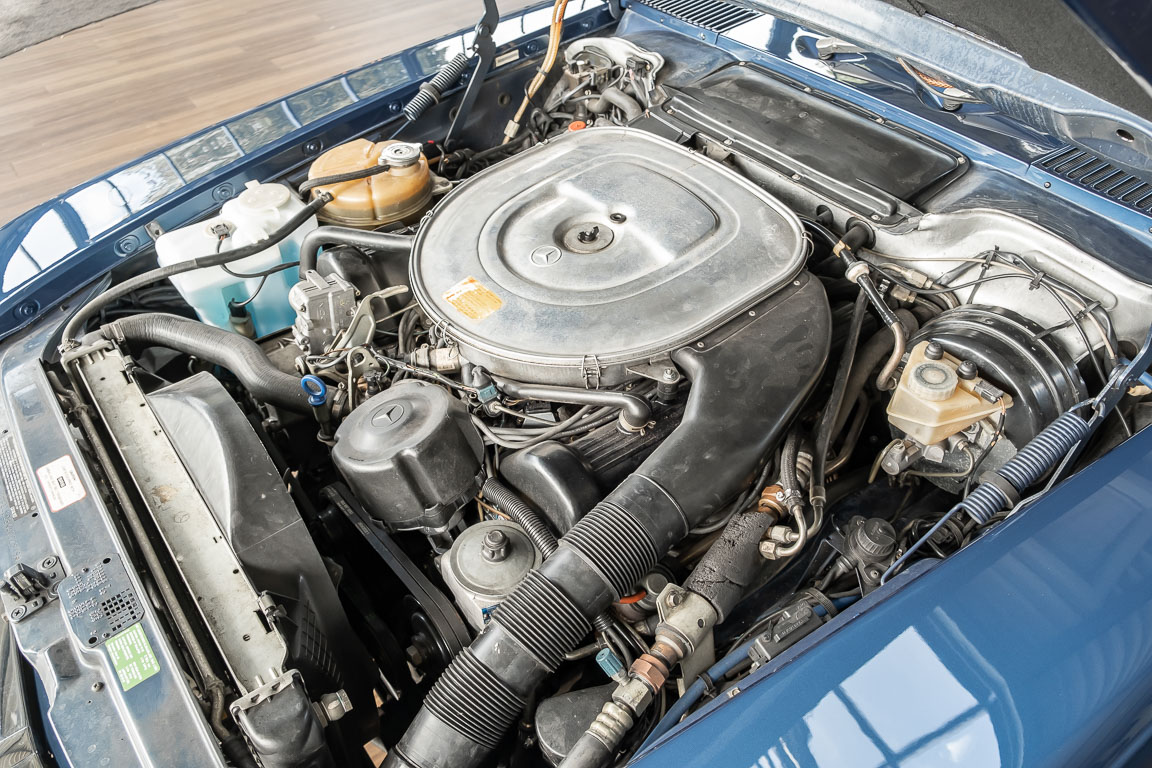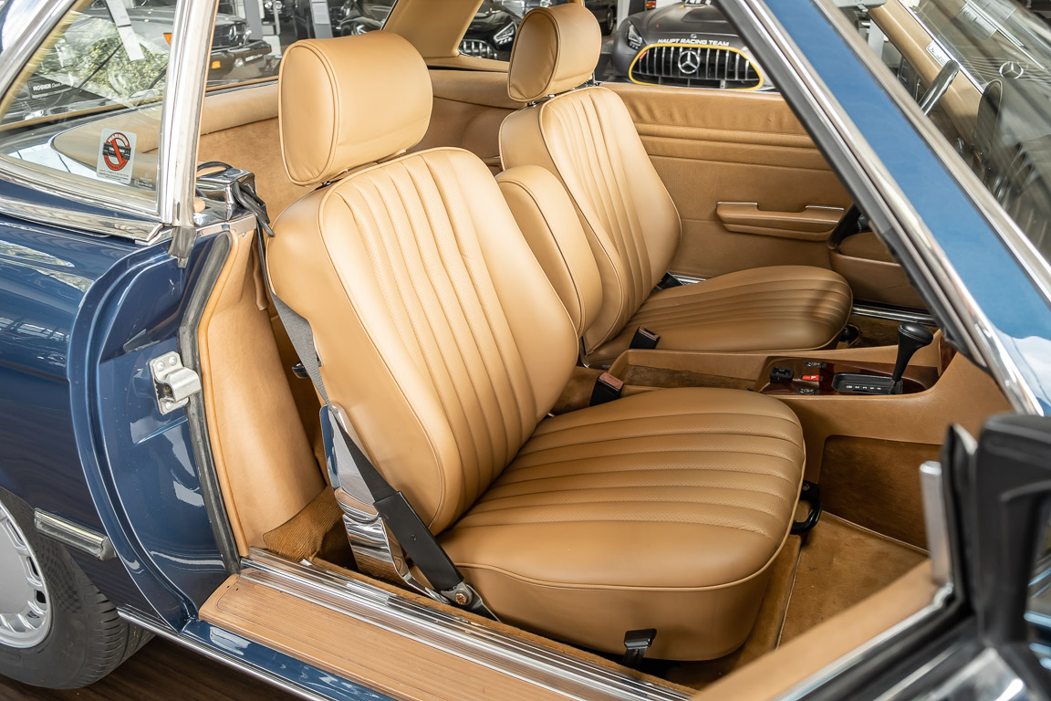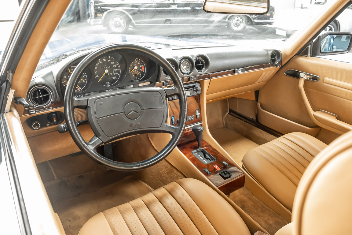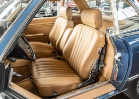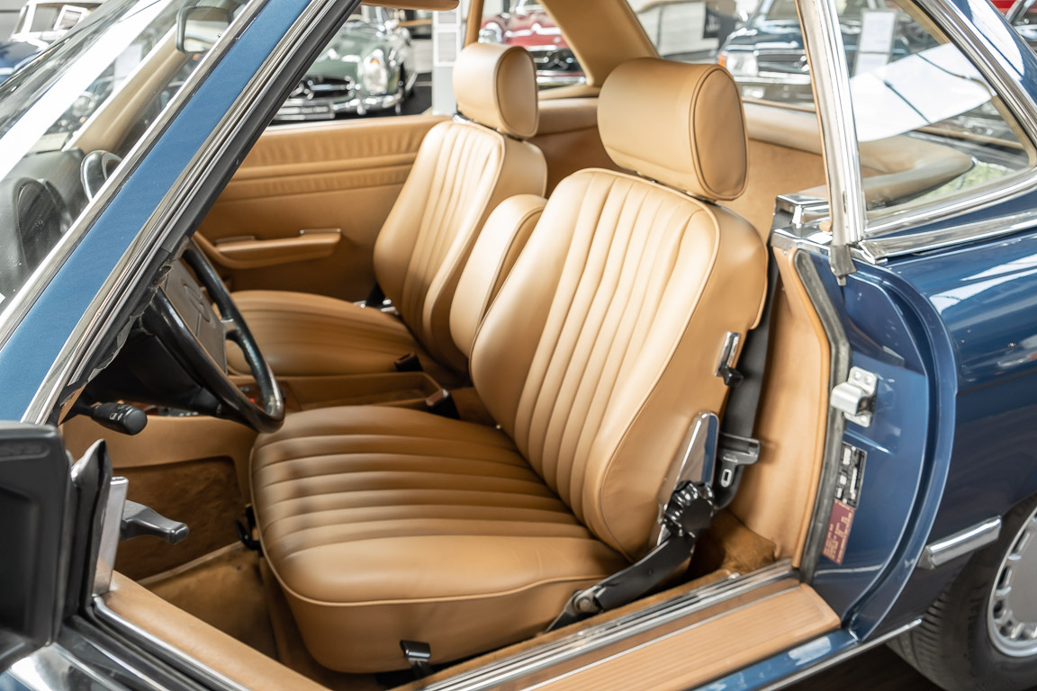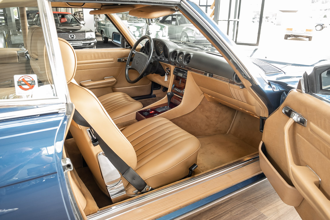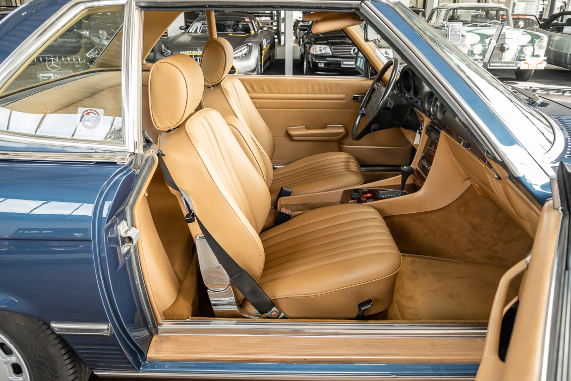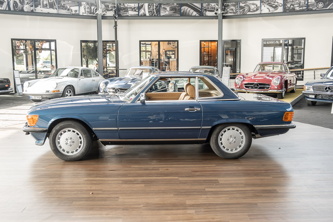 We are pleased to offer you this 560 SL of the 107 series. In the stylish color combination of a paint job in "nautical blue metallic" in combination with leather in the warm color "date", this car radiates a timeless appeal. While gliding effortlessly along with 230 hp in every situation, the driver experiences impeccable and well-maintained technology. Braking, accelerating, shifting: everything works as it should. The vehicle is handed over to its new owner with a fresh main inspection, an up-to-date service and a hardtop. An absolute delight to indulge in this roadster. "Experience" it for yourself. Welcome to ROSIER Classic Stars.