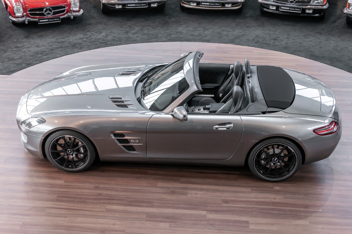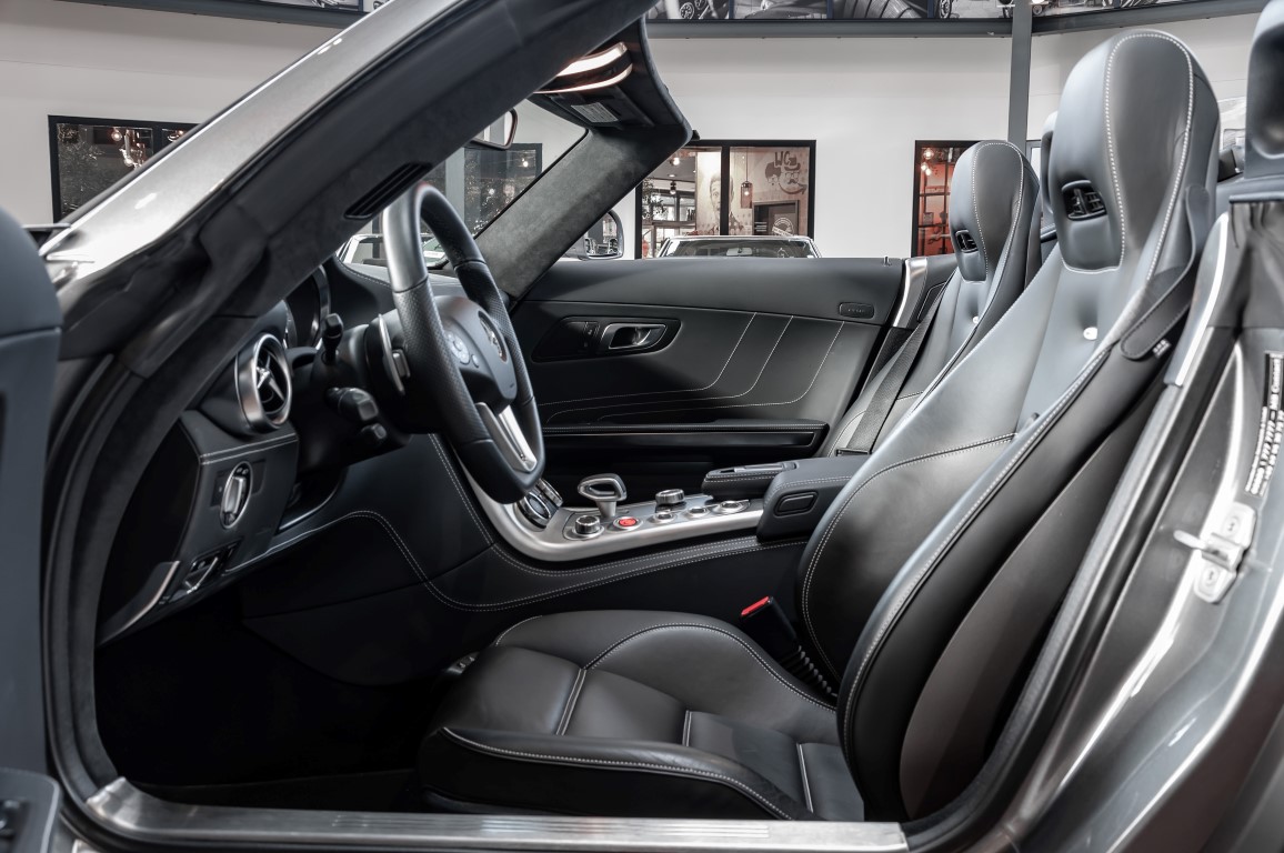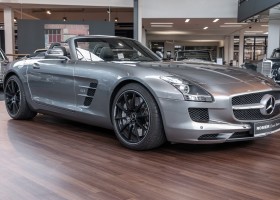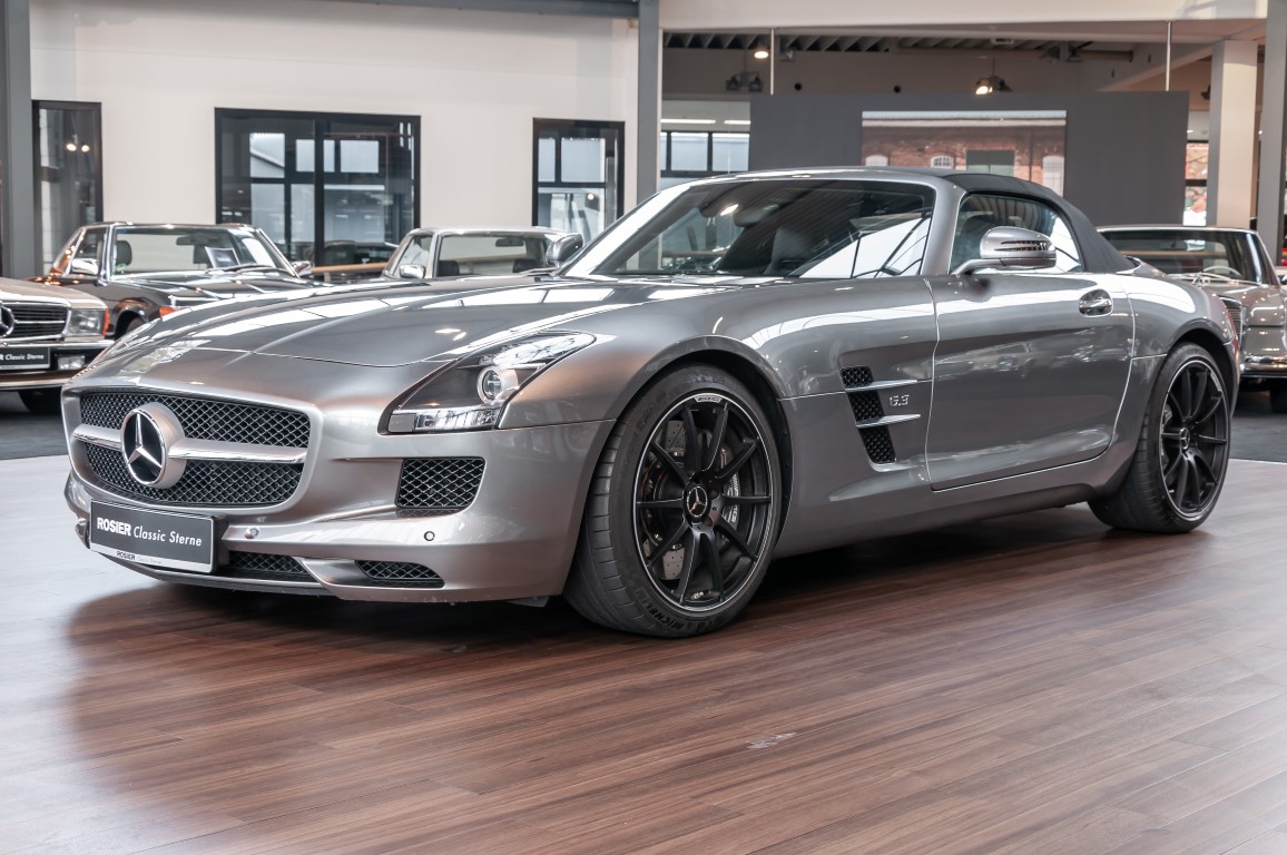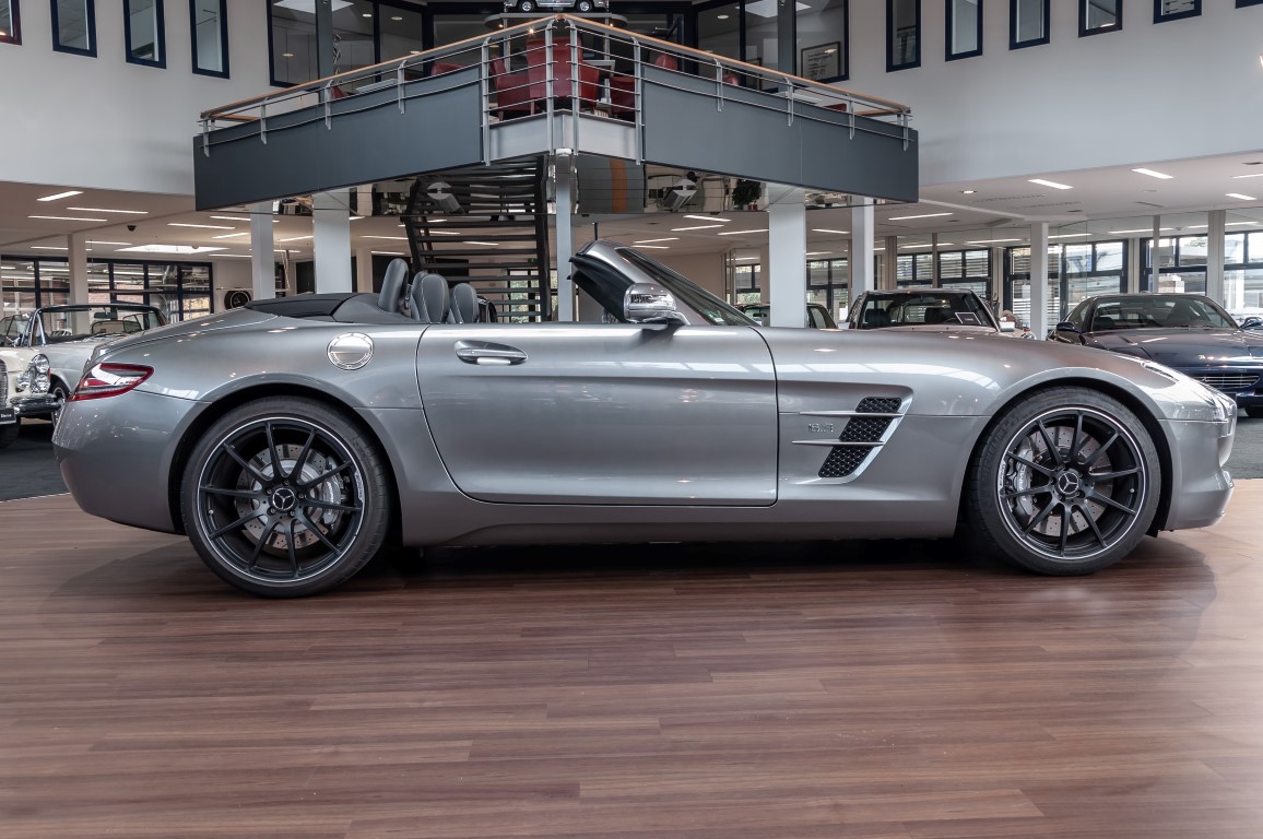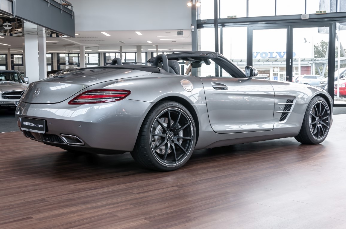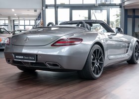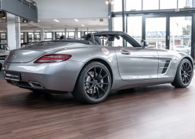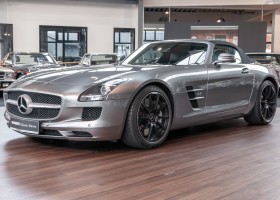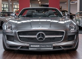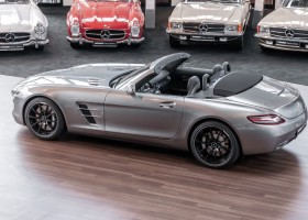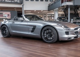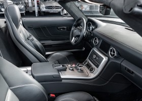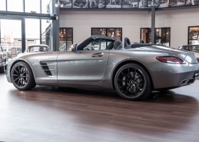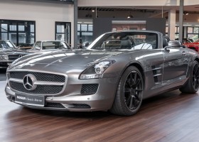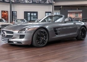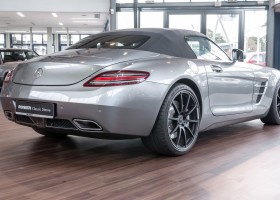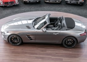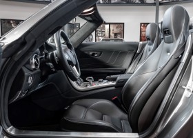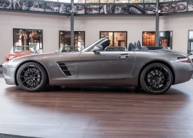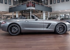 This wonderful SLS AMG Roadster in the popular Himalayan Grey Middle Metallic colour in combination with black AMG forged wheels already looks athletic when stationary. An impression that is confirmed at the latest when the brute 6.3-litre eight-cylinder engine is launched - especially when the top is open.