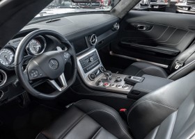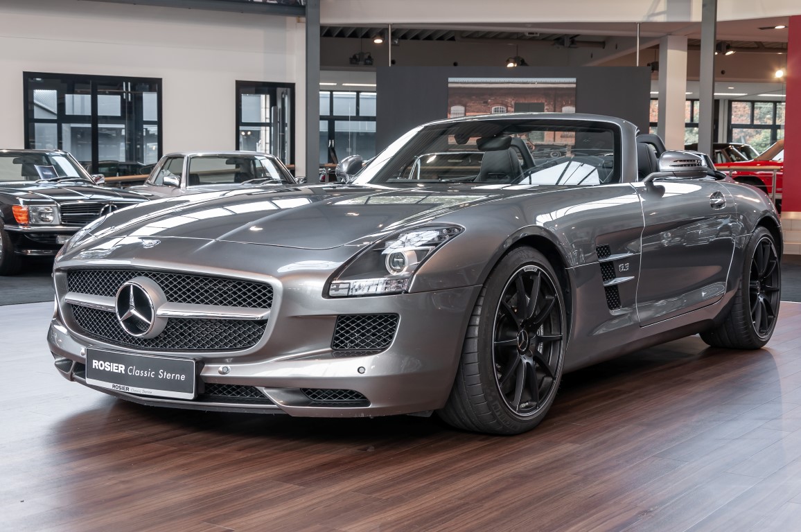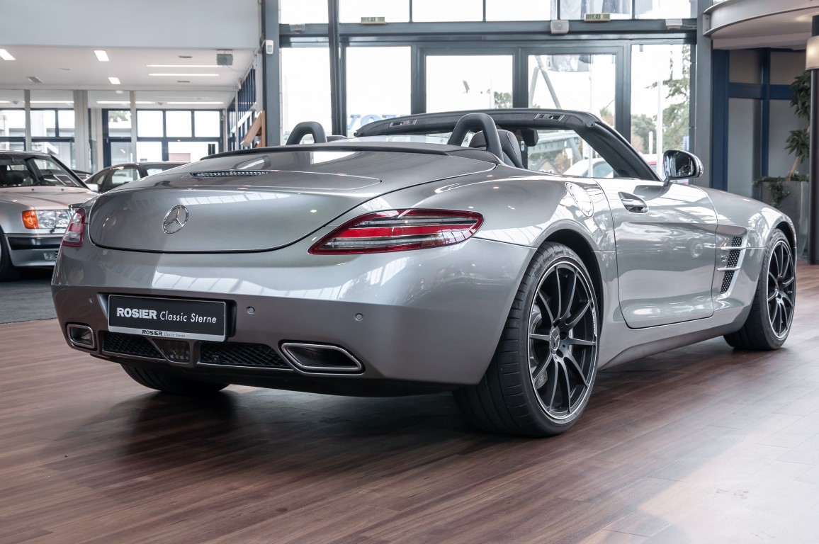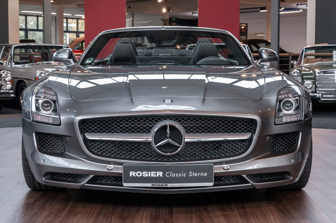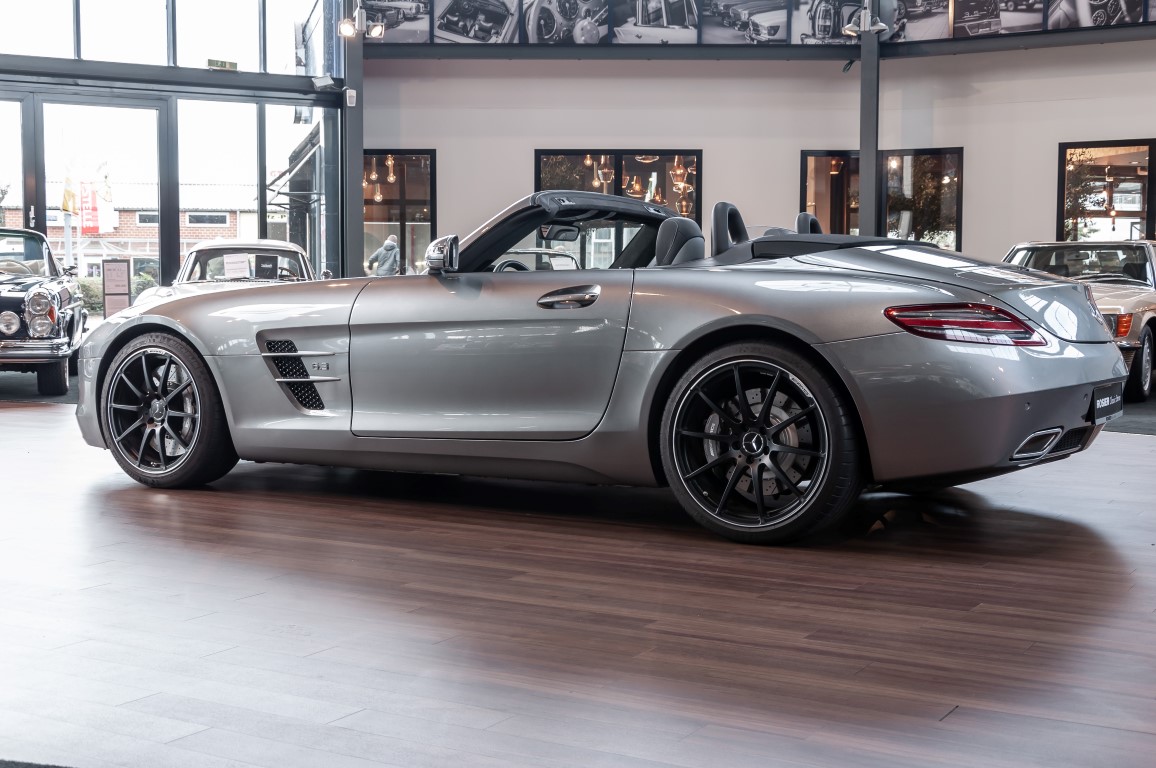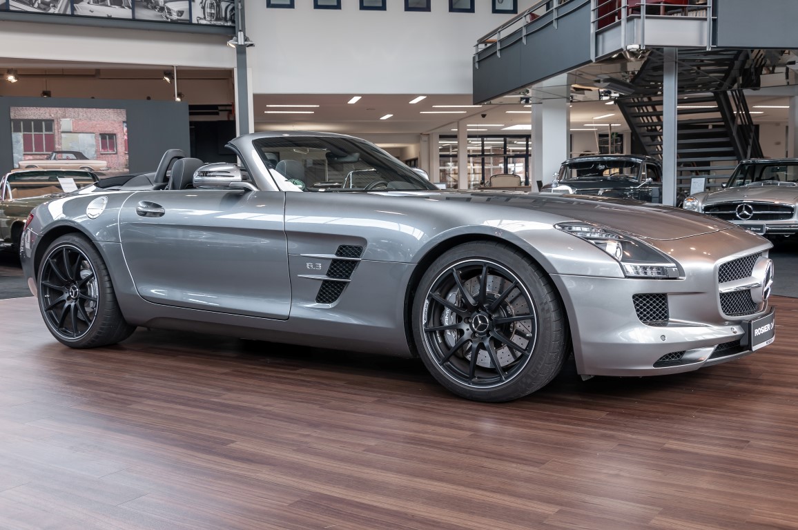 This wonderful SLS AMG Roadster in the popular Himalayan Grey Middle Metallic colour in combination with black AMG forged wheels already looks athletic when stationary. An impression that is confirmed at the latest when the brute 6.3-litre eight-cylinder engine is launched - especially when the top is open.