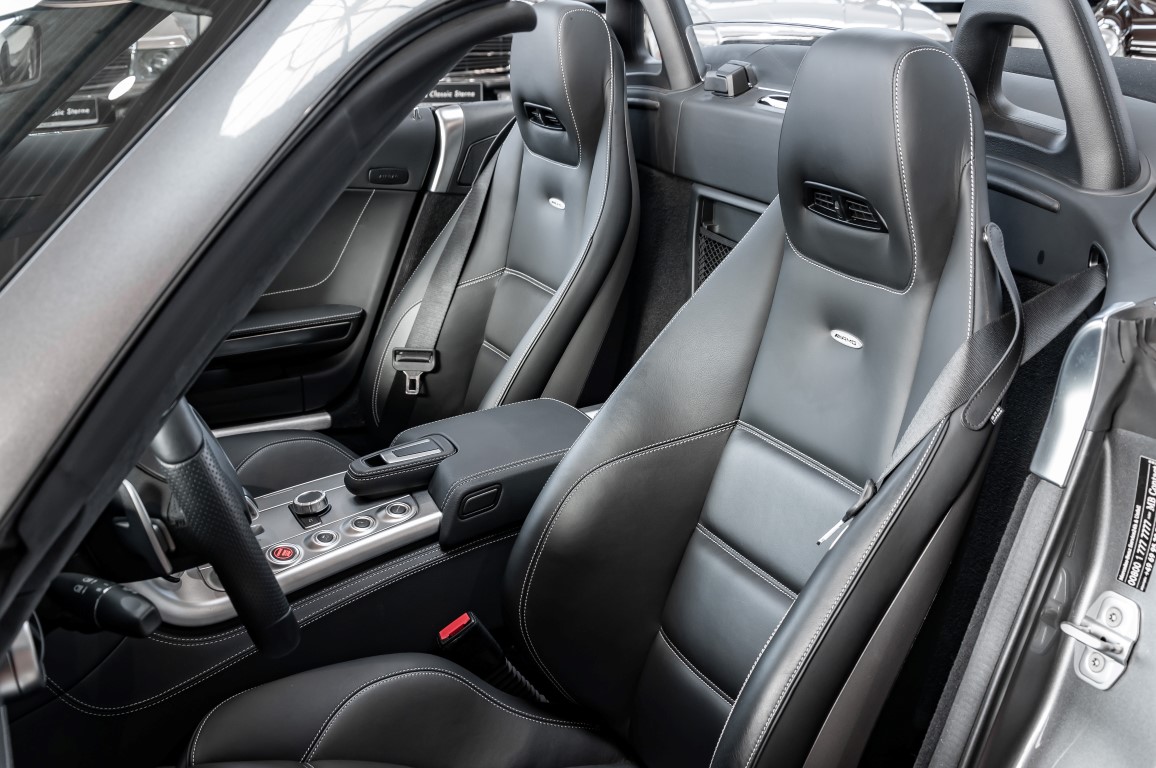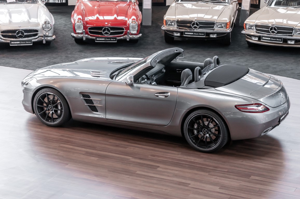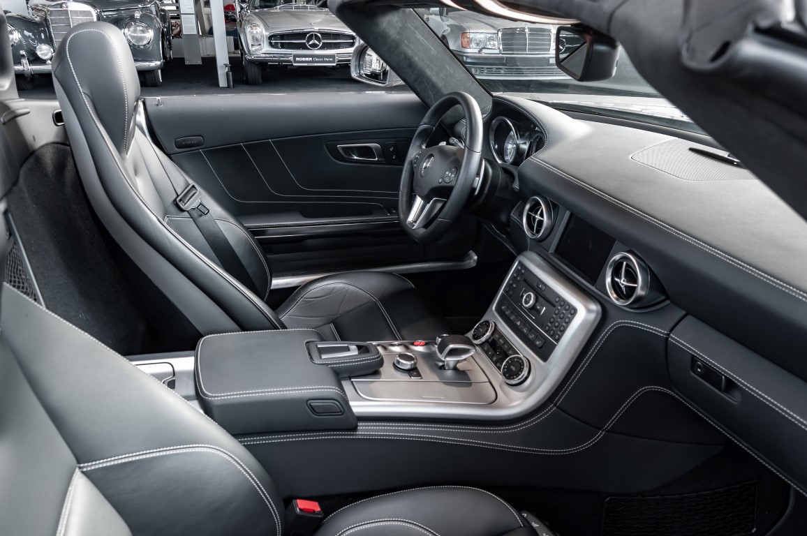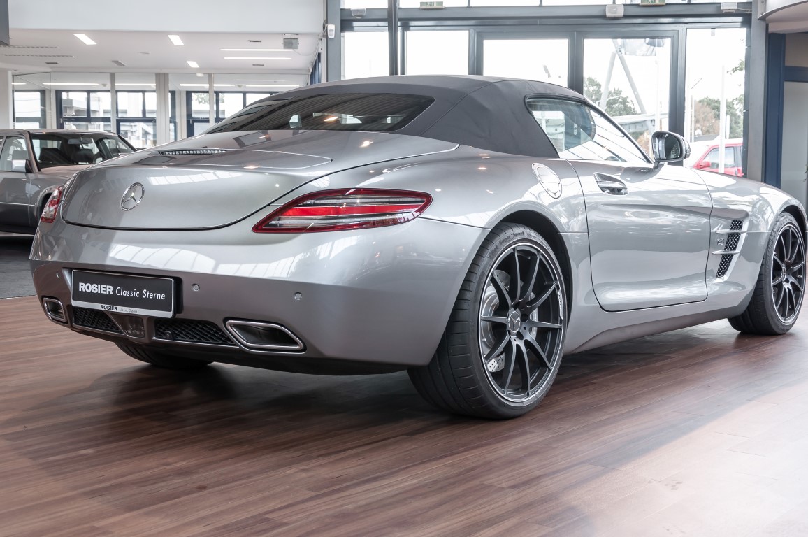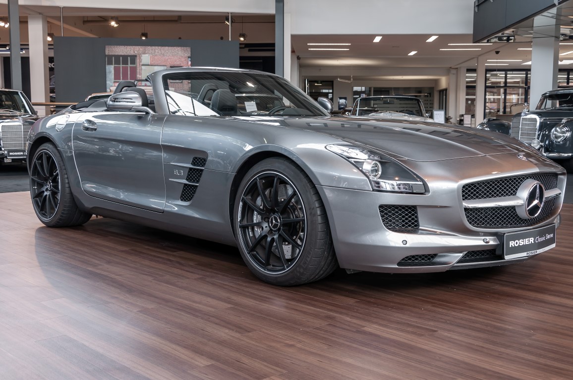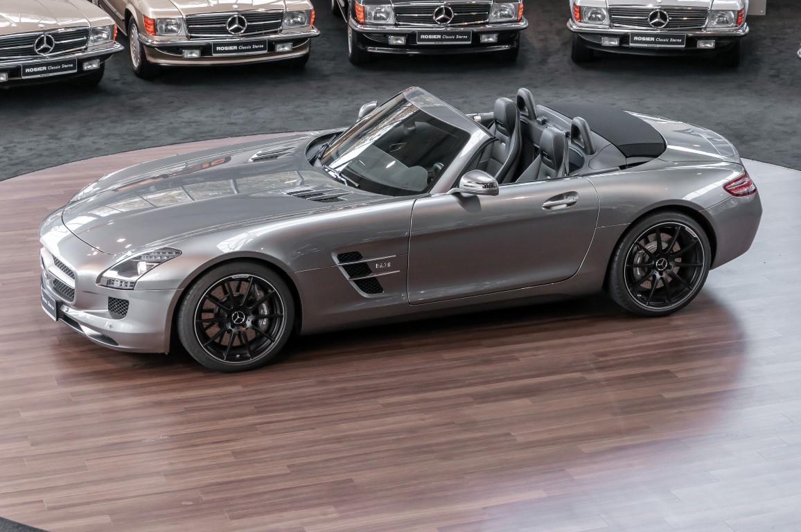 This wonderful SLS AMG Roadster in the popular Himalayan Grey Middle Metallic colour in combination with black AMG forged wheels already looks athletic when stationary. An impression that is confirmed at the latest when the brute 6.3-litre eight-cylinder engine is launched - especially when the top is open.